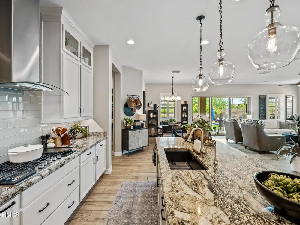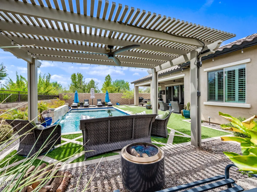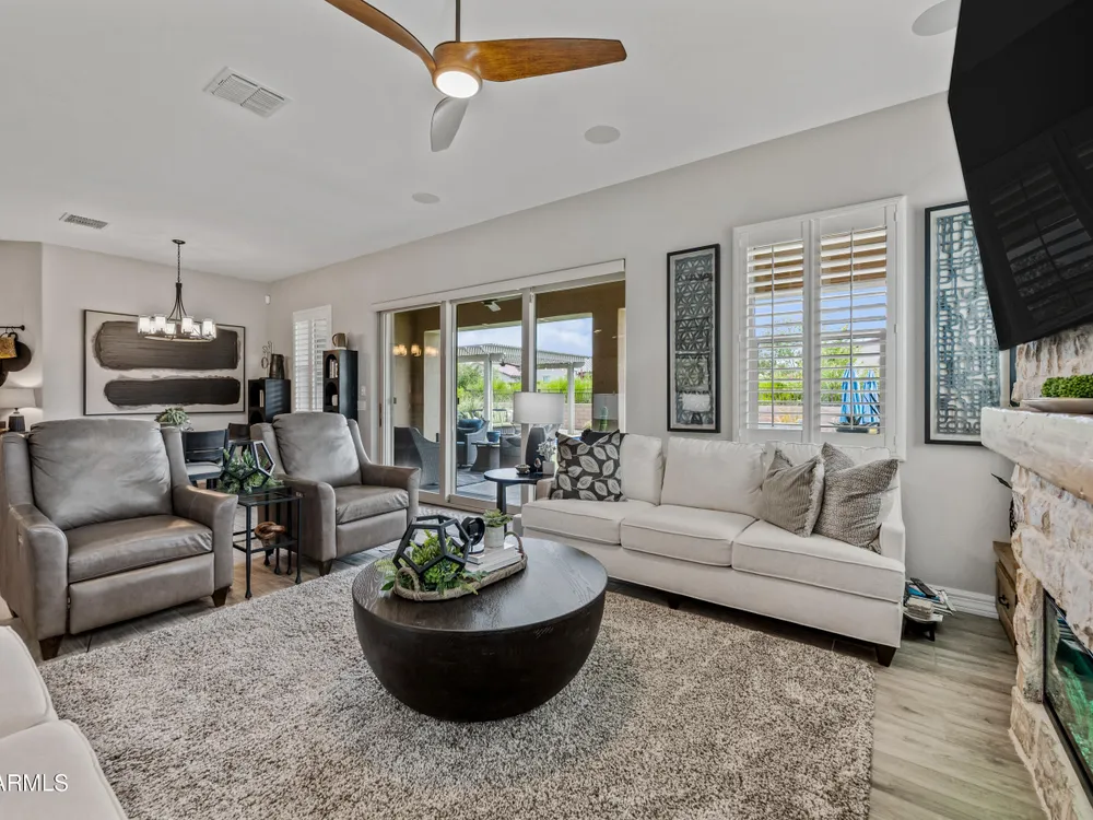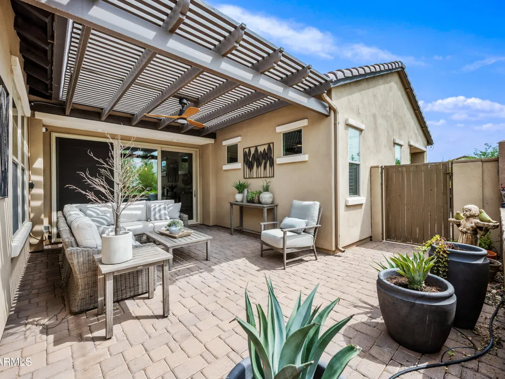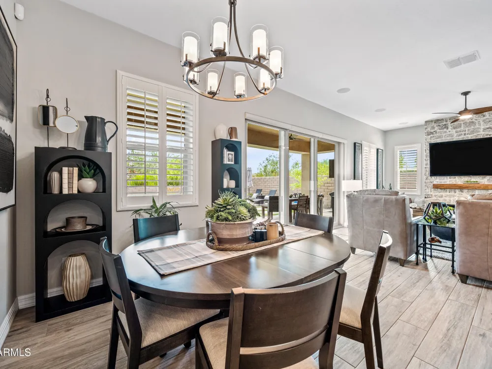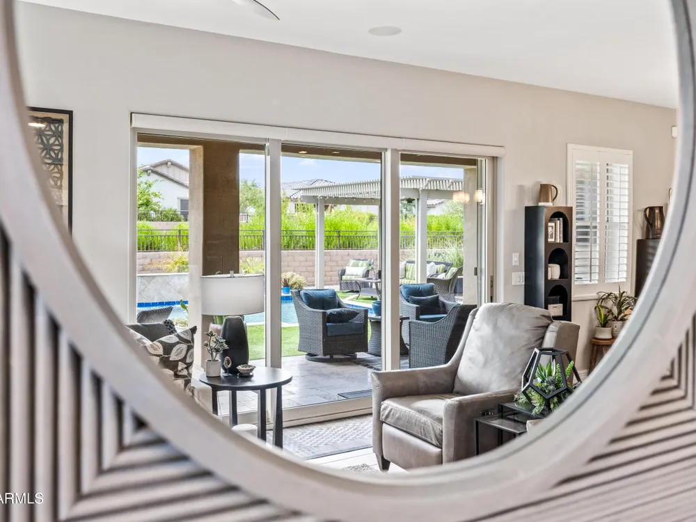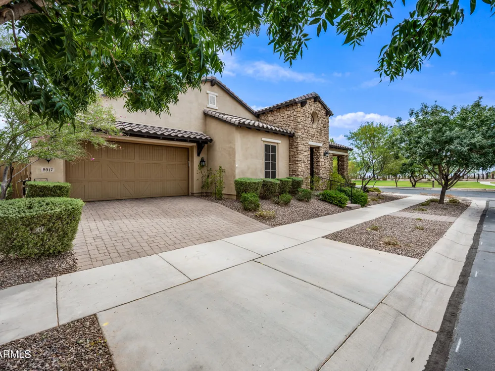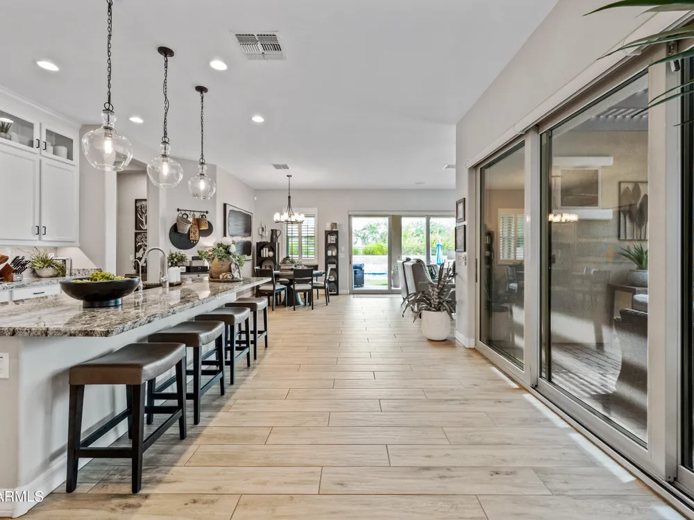 Beautifully upgraded single-story home in the highly sought-after 55+ community of Encore at Eastmark. Open Ballet floor plan with wood-look tile, plantation shutters, and abundant natural light from triple sliding doors with motorized shades. Chef's kitchen features white cabinetry, granite countertops, large island, coffee bar, and walk-in pantry. Two ensuite bedrooms and den/third bedroom, 2.5 baths, office, and remodeled bathrooms with spa-like primary suite. Backyard oasis with sparkling pool, water feature, travertine patio, pergolas, and fruit trees. Oversized 2.5-car garage with epoxy floors and storage. Premium corner lot with wraparound porch. Encore amenities include pickleball, tennis, bocce, fitness, billiards, library, and vibrant social events.