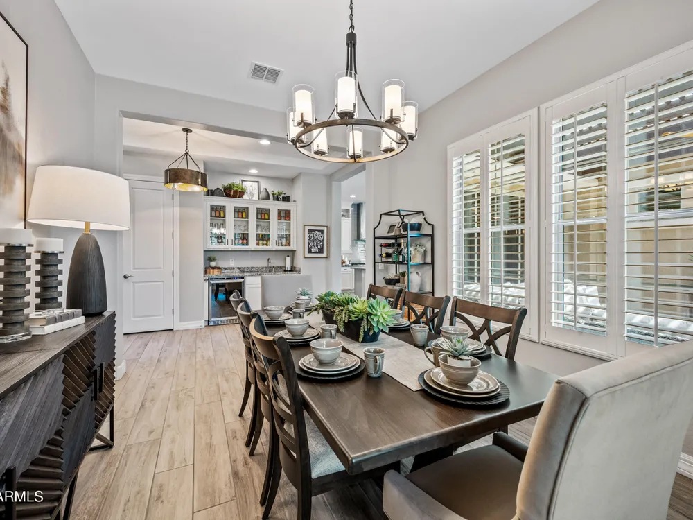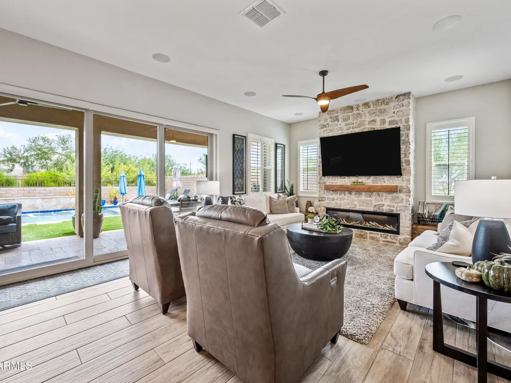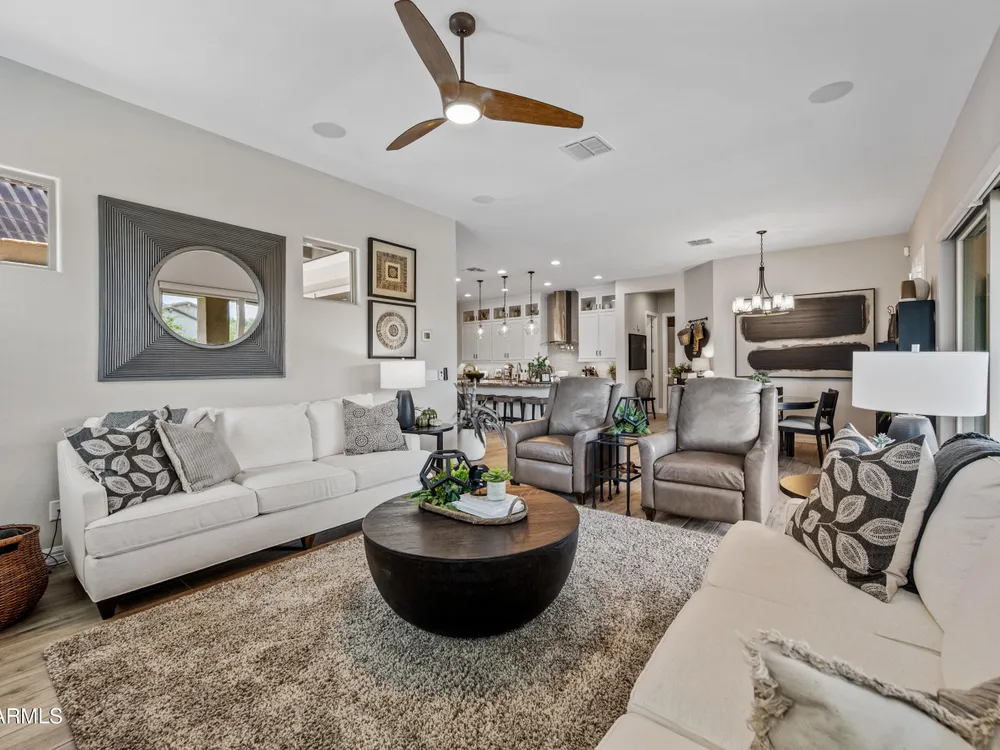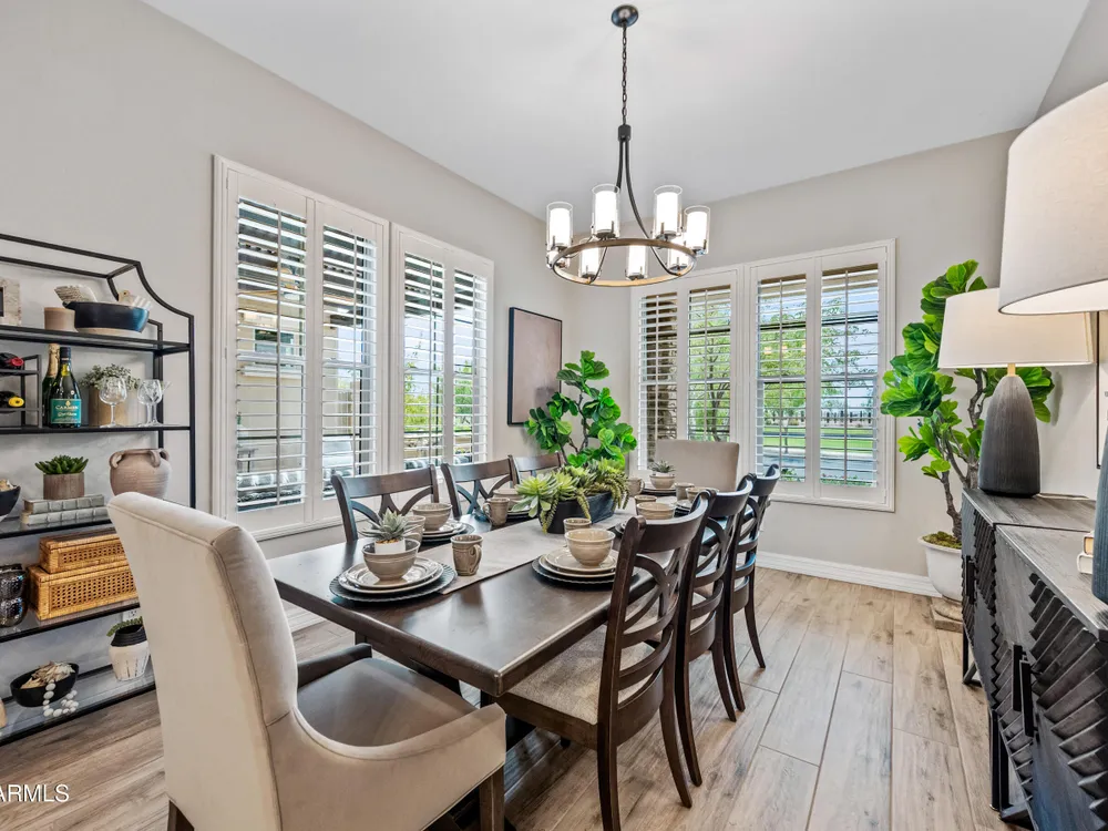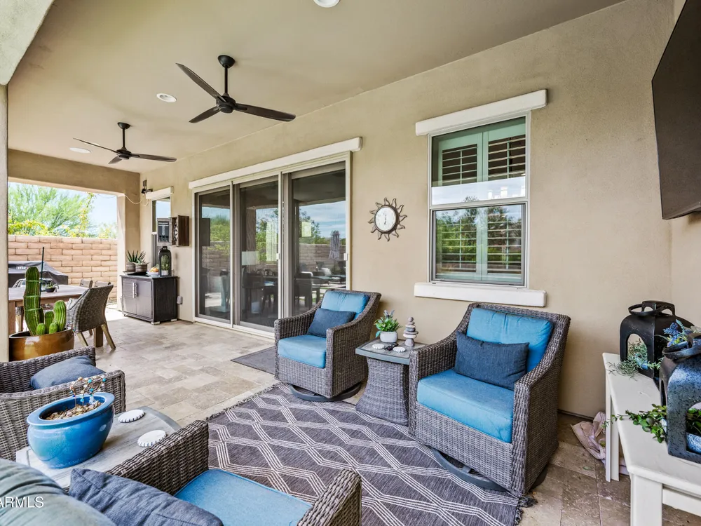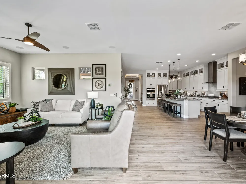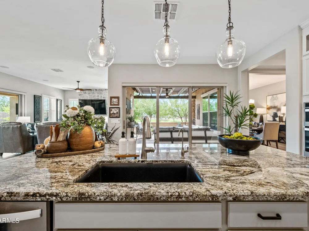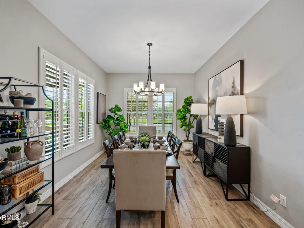 Beautifully upgraded single-story home in the highly sought-after 55+ community of Encore at Eastmark. Open Ballet floor plan with wood-look tile, plantation shutters, and abundant natural light from triple sliding doors with motorized shades. Chef's kitchen features white cabinetry, granite countertops, large island, coffee bar, and walk-in pantry. Two ensuite bedrooms and den/third bedroom, 2.5 baths, office, and remodeled bathrooms with spa-like primary suite. Backyard oasis with sparkling pool, water feature, travertine patio, pergolas, and fruit trees. Oversized 2.5-car garage with epoxy floors and storage. Premium corner lot with wraparound porch. Encore amenities include pickleball, tennis, bocce, fitness, billiards, library, and vibrant social events.
