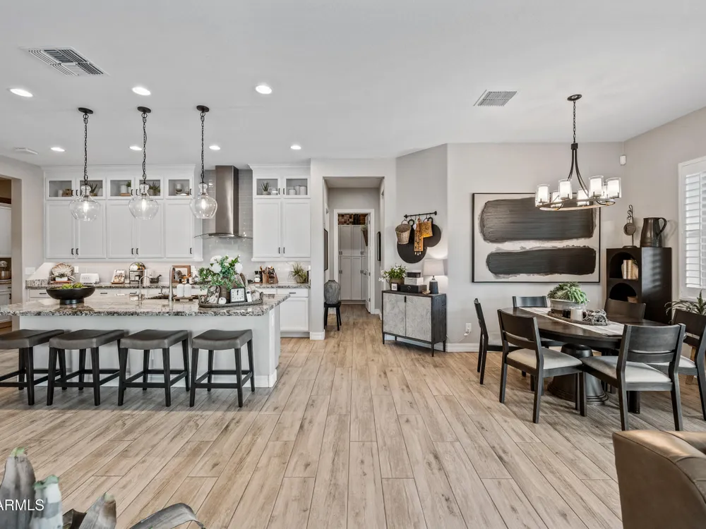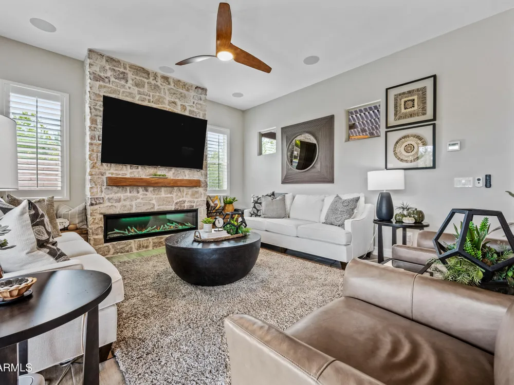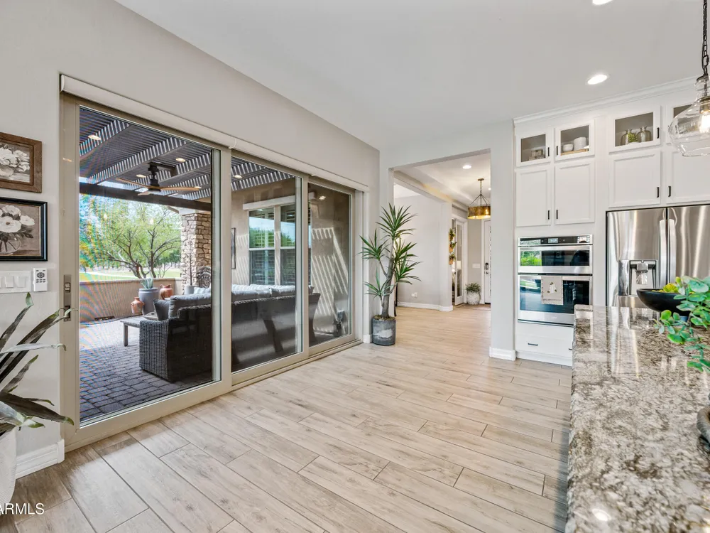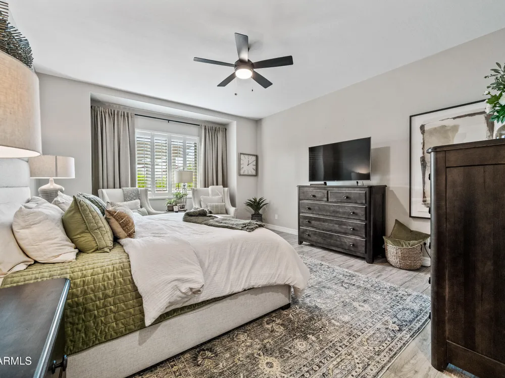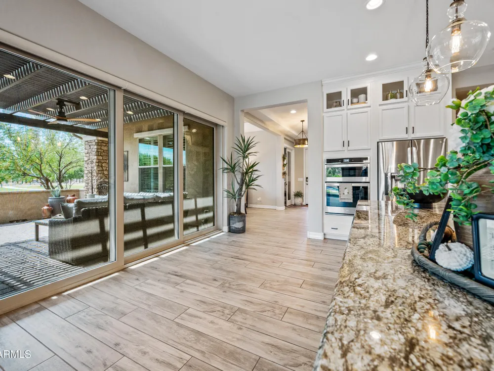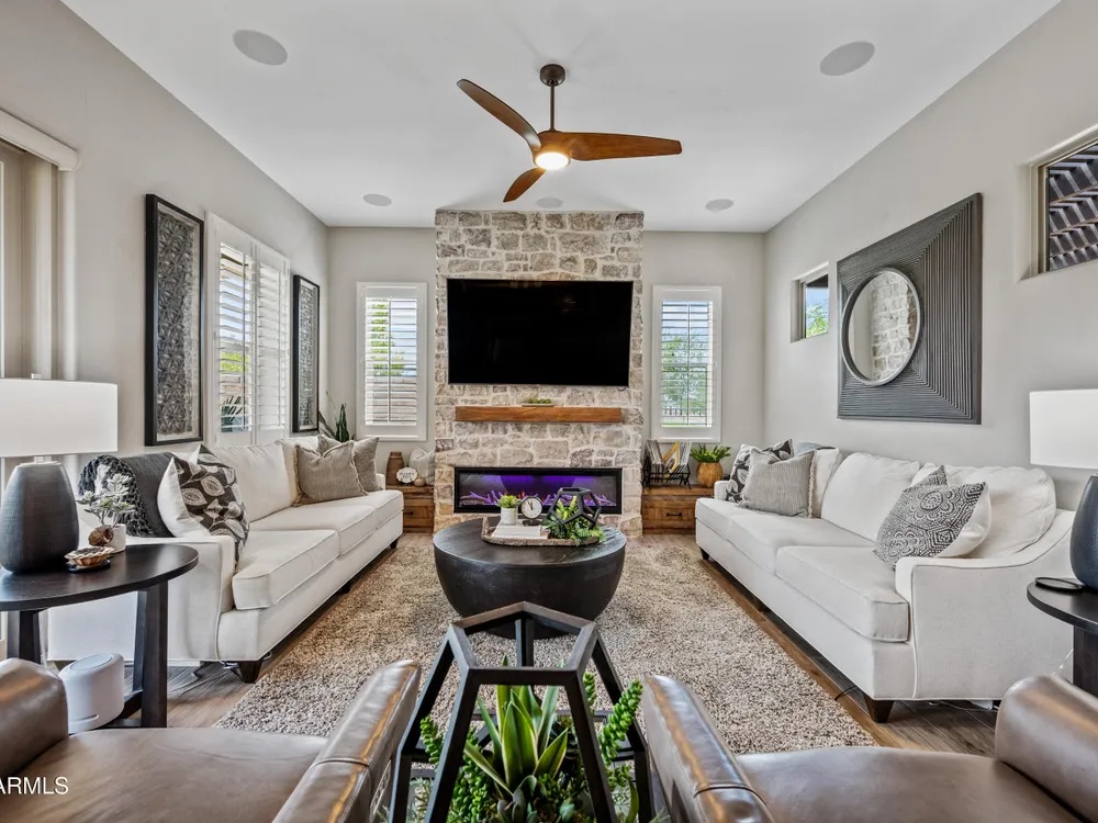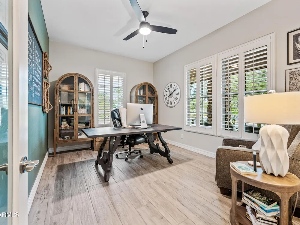 Beautifully upgraded single-story home in the highly sought-after 55+ community of Encore at Eastmark. Open Ballet floor plan with wood-look tile, plantation shutters, and abundant natural light from triple sliding doors with motorized shades. Chef's kitchen features white cabinetry, granite countertops, large island, coffee bar, and walk-in pantry. Two ensuite bedrooms and den/third bedroom, 2.5 baths, office, and remodeled bathrooms with spa-like primary suite. Backyard oasis with sparkling pool, water feature, travertine patio, pergolas, and fruit trees. Oversized 2.5-car garage with epoxy floors and storage. Premium corner lot with wraparound porch. Encore amenities include pickleball, tennis, bocce, fitness, billiards, library, and vibrant social events.