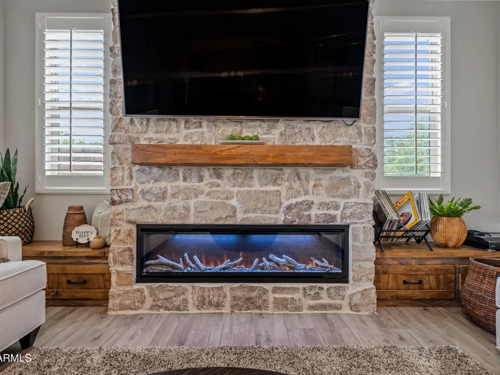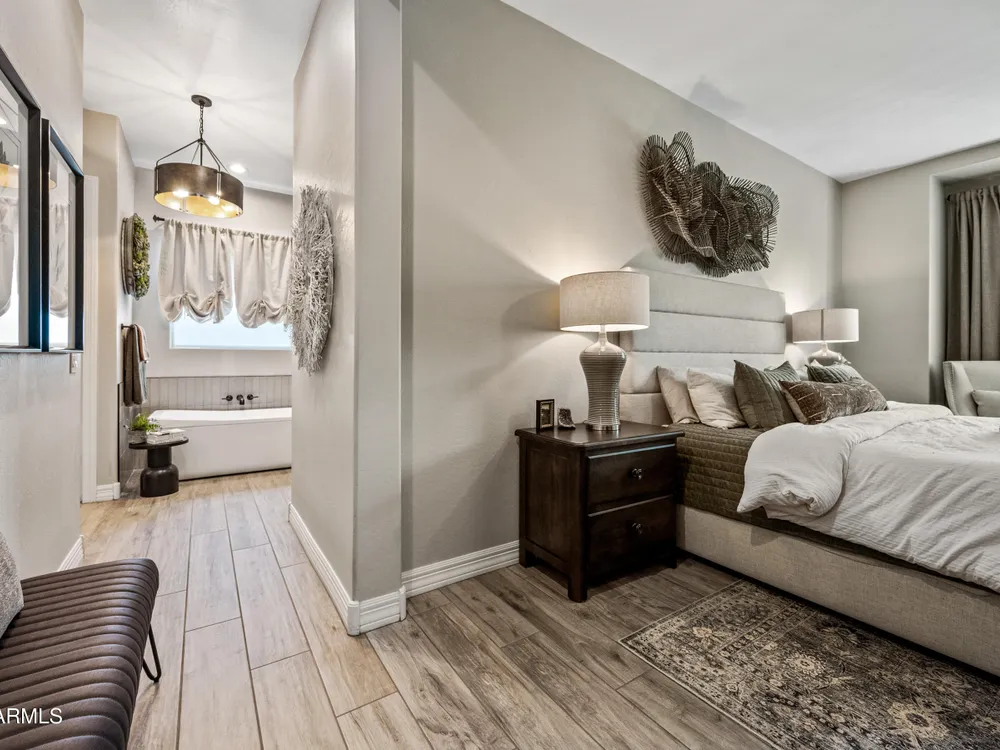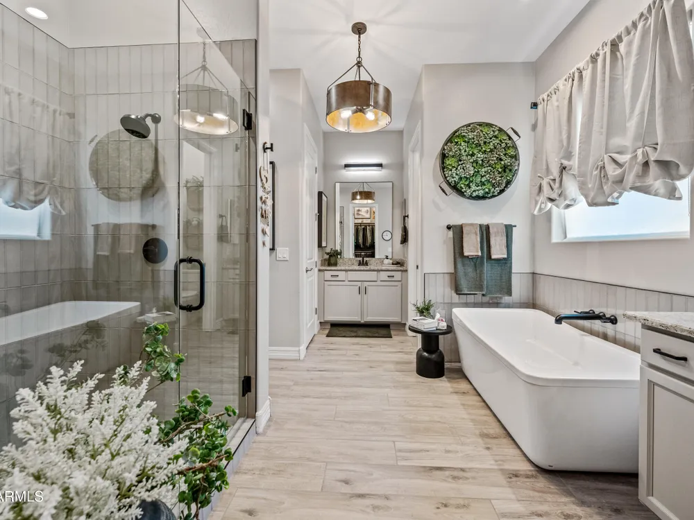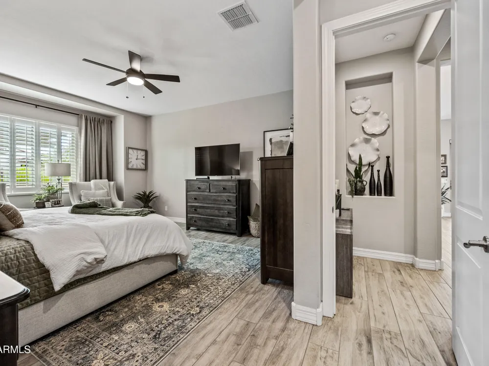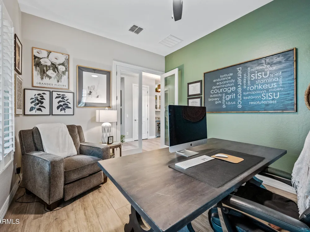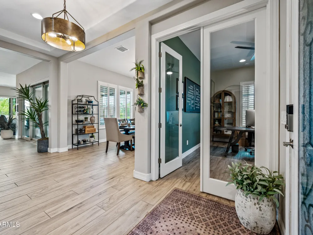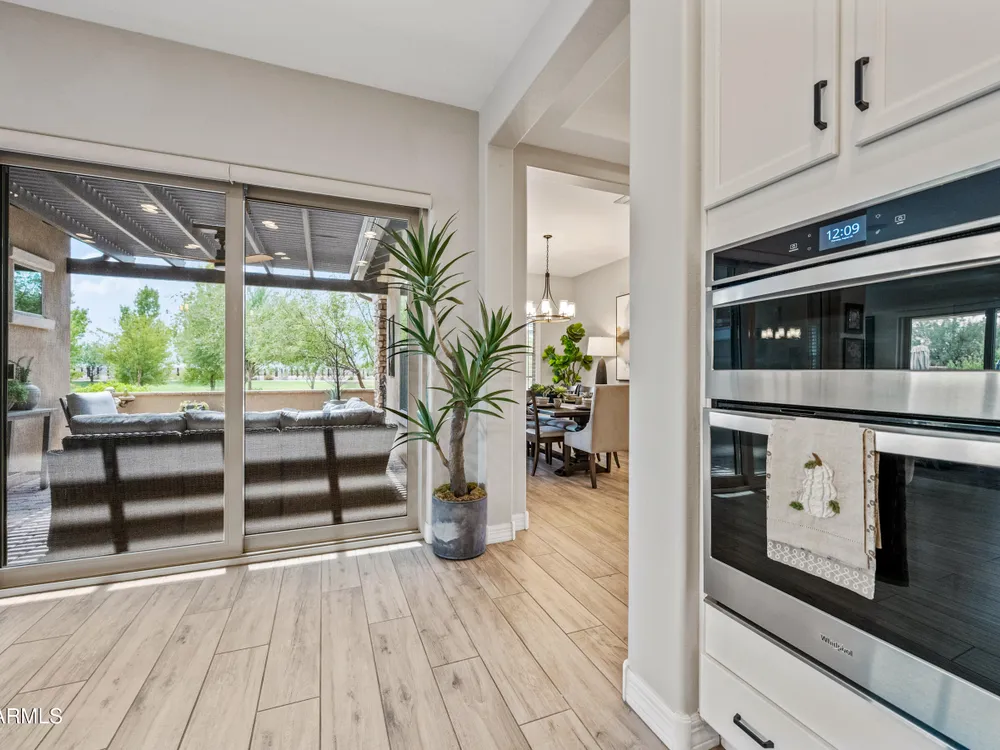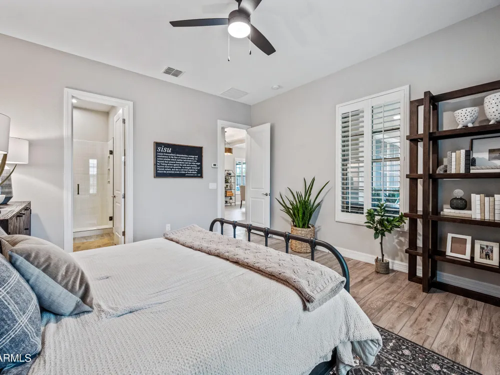Beautifully upgraded single-story home in the highly sought-after 55+ community of Encore at Eastmark. Open Ballet floor plan with wood-look tile, plantation shutters, and abundant natural light from triple sliding doors with motorized shades. Chef's kitchen features white cabinetry, granite countertops, large island, coffee bar, and walk-in pantry. Two ensuite bedrooms and den/third bedroom, 2.5 baths, office, and remodeled bathrooms with spa-like primary suite. Backyard oasis with sparkling pool, water feature, travertine patio, pergolas, and fruit trees. Oversized 2.5-car garage with epoxy floors and storage. Premium corner lot with wraparound porch. Encore amenities include pickleball, tennis, bocce, fitness, billiards, library, and vibrant social events.