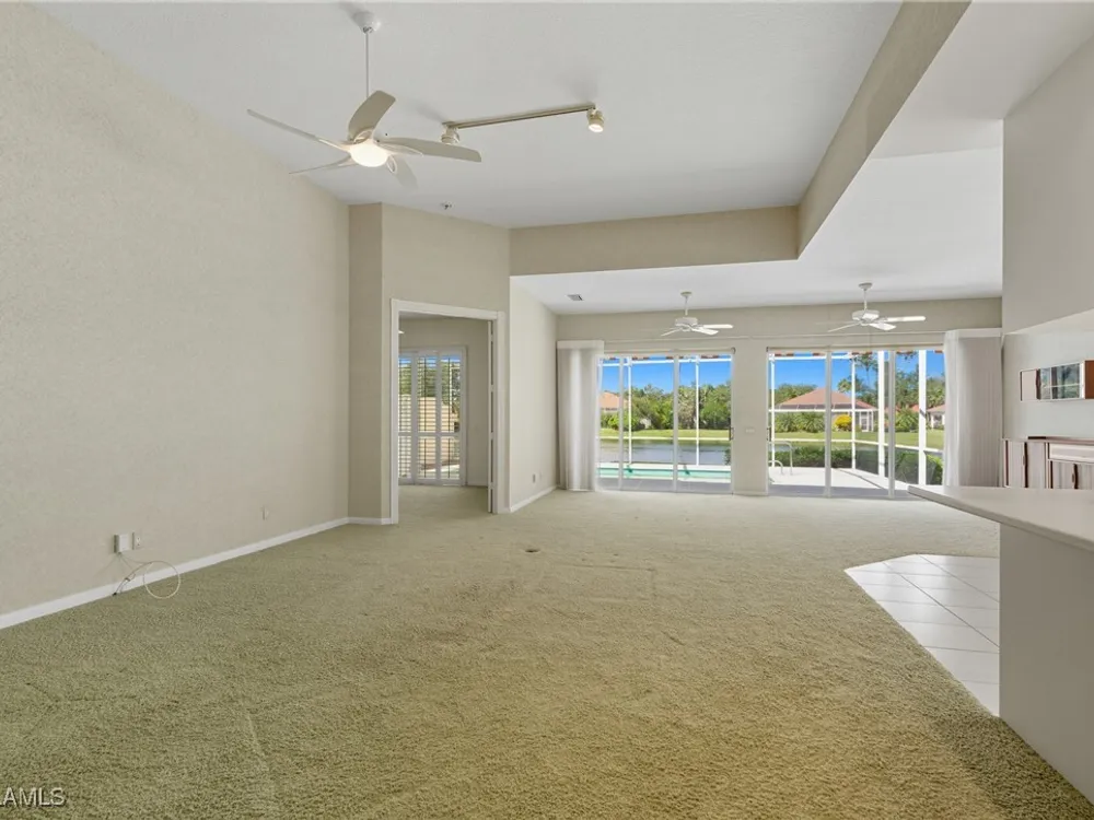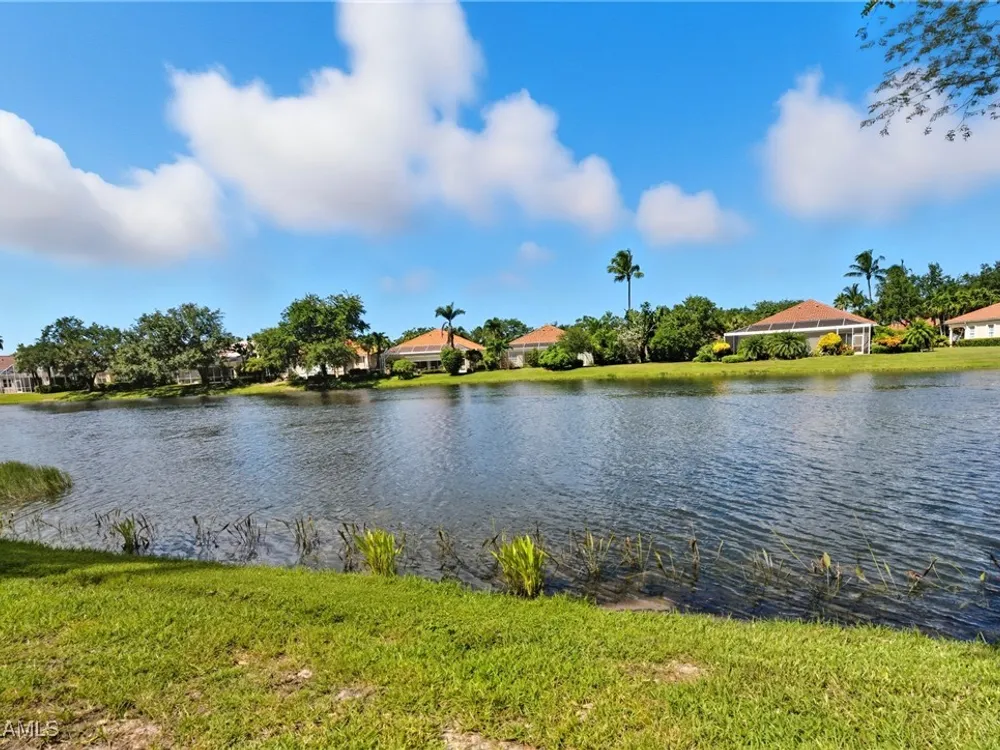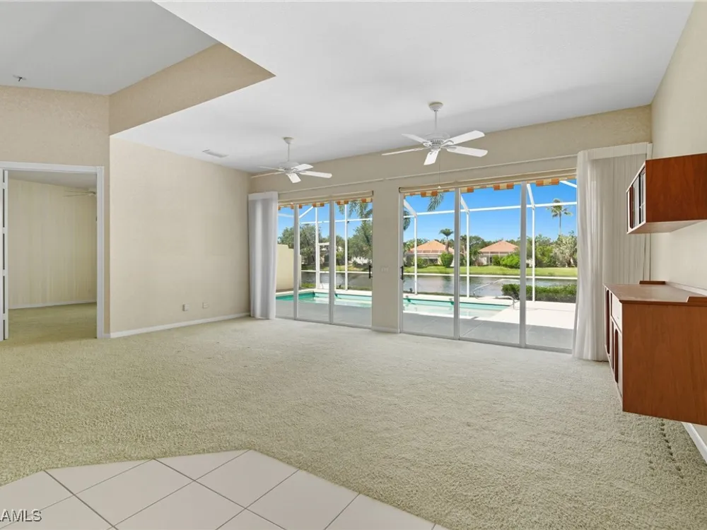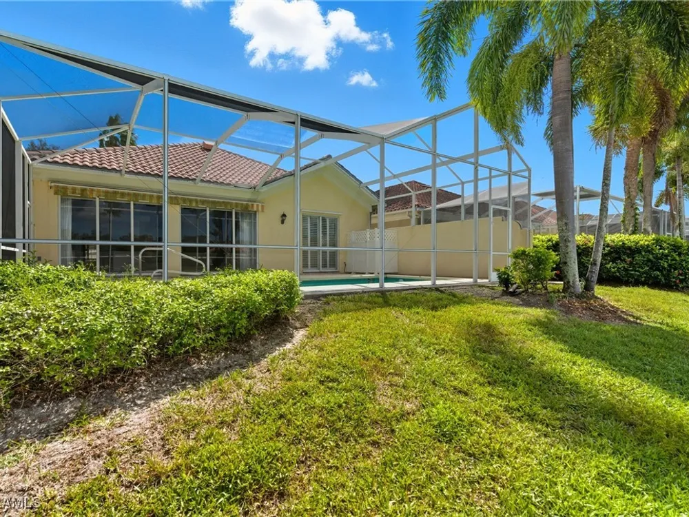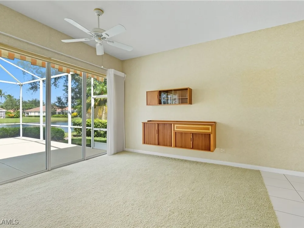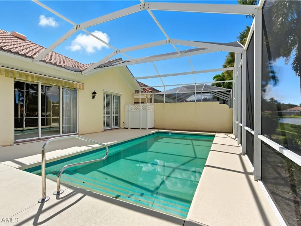 Enjoy beautiful sunsets in this lake front home in the desirable Island Walk community! This spacious 3 bedroom plus den home is the elegant Oakmont floorplan, with the rarely available extended living area (an additional 200 sq ft under air). Open concept kitchen, dining and living area, with wall to wall sliders to the screened lanai and pool. Spacious primary suite with amazing closets, en suite bath and private entry to the lanai. The home boasts two very unique teak built-ins which give it a cool mid-century modern vibe! Additional hanging shelf system in the garage, as well as finished flooring in the attic, provides storage space to meet all your needs! New 4-ton Rheem HVAC (2024) and newer HW tank, tiled garage floor, plantation shutters throughout, new pool pump, solar cover, electric awning on lanai, leaf filter system (2022) and hurricane protection complete the package. Residents of Island Walk enjoy a large town center offering many amenities as well as hair & nail salon, post office, gas station, car wash, popular restaurant, fitness center, resort and lap pools, pickleball, tennis, bocce, and a putting green. Conveniently located near beaches and everything Naples has to offer.