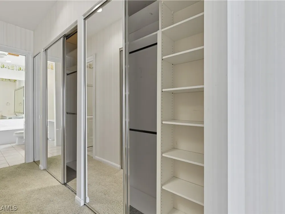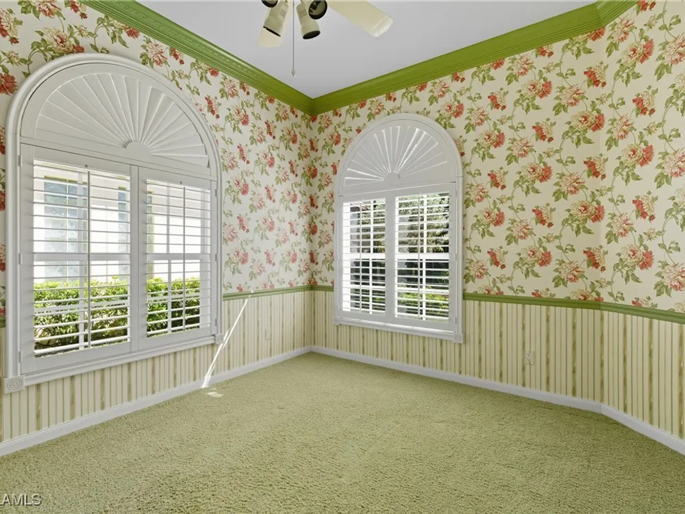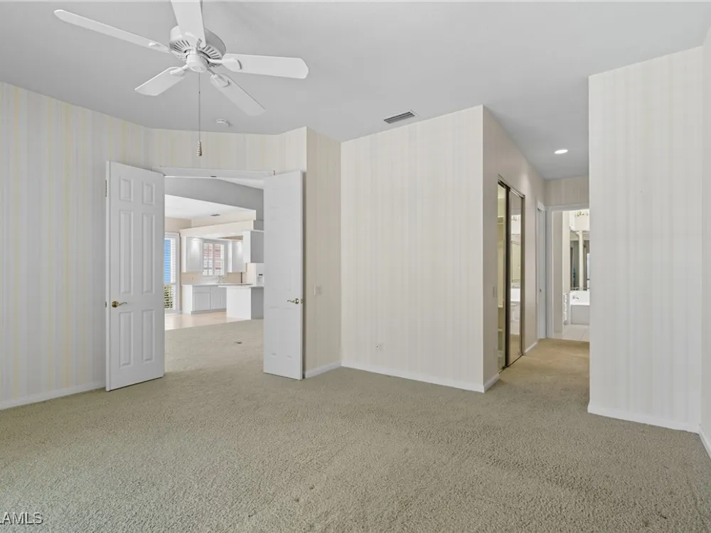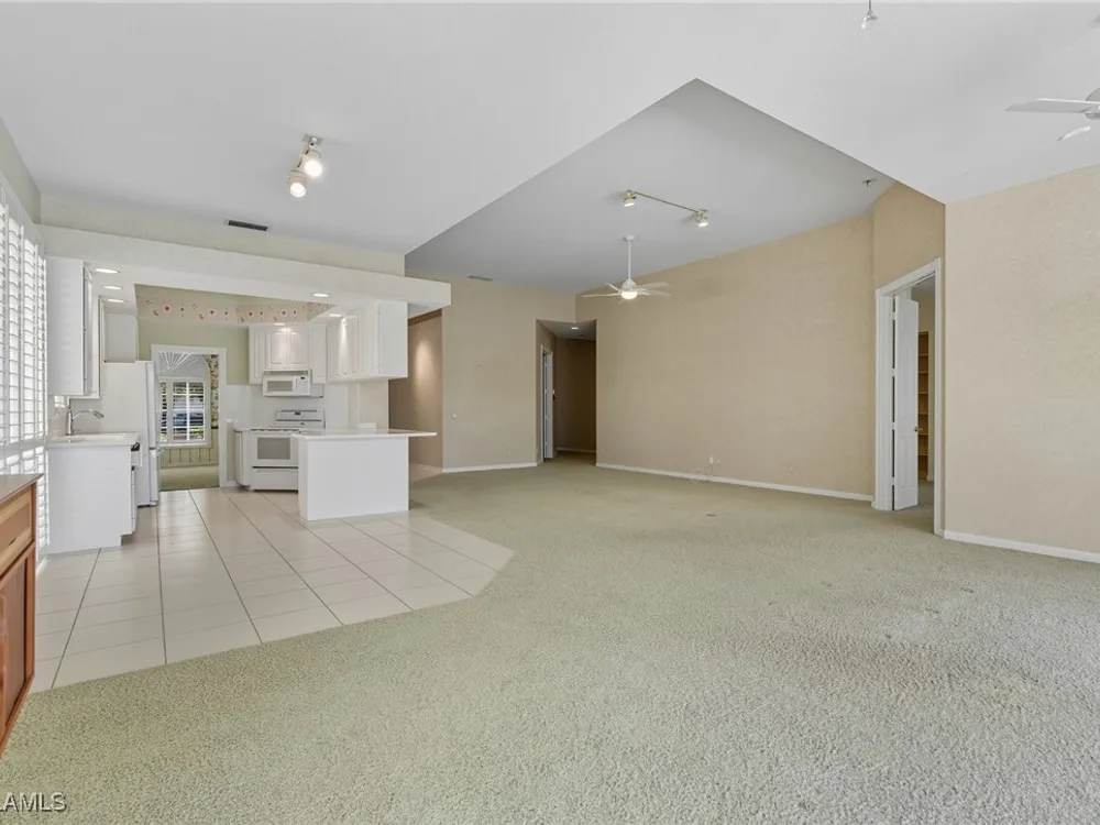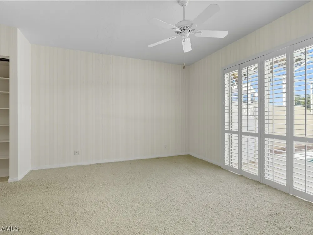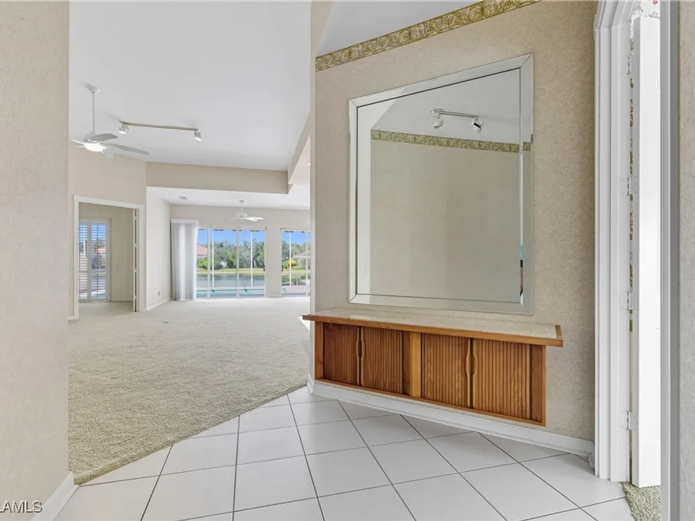 Enjoy beautiful sunsets in this lake front home in the desirable Island Walk community! This spacious 3 bedroom plus den home is the elegant Oakmont floorplan, with the rarely available extended living area (an additional 200 sq ft under air). Open concept kitchen, dining and living area, with wall to wall sliders to the screened lanai and pool. Spacious primary suite with amazing closets, en suite bath and private entry to the lanai. The home boasts two very unique teak built-ins which give it a cool mid-century modern vibe! Additional hanging shelf system in the garage, as well as finished flooring in the attic, provides storage space to meet all your needs! New 4-ton Rheem HVAC (2024) and newer HW tank, tiled garage floor, plantation shutters throughout, new pool pump, solar cover, electric awning on lanai, leaf filter system (2022) and hurricane protection complete the package. Residents of Island Walk enjoy a large town center offering many amenities as well as hair & nail salon, post office, gas station, car wash, popular restaurant, fitness center, resort and lap pools, pickleball, tennis, bocce, and a putting green. Conveniently located near beaches and everything Naples has to offer.