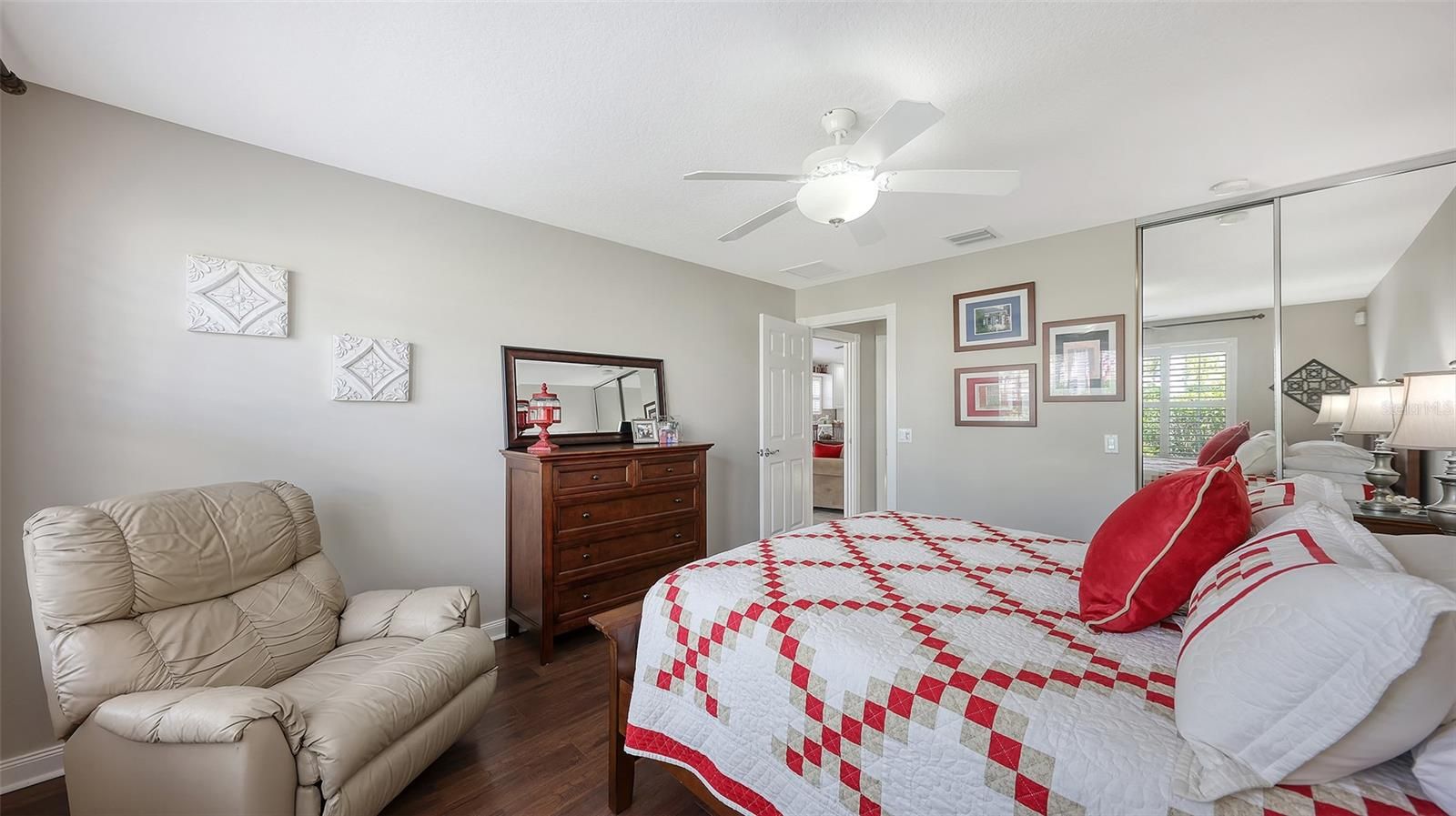 - Ceiling Fan(s), Main Level Primary, Solid Surface Counters, Split Bedrooms, Window Treatments