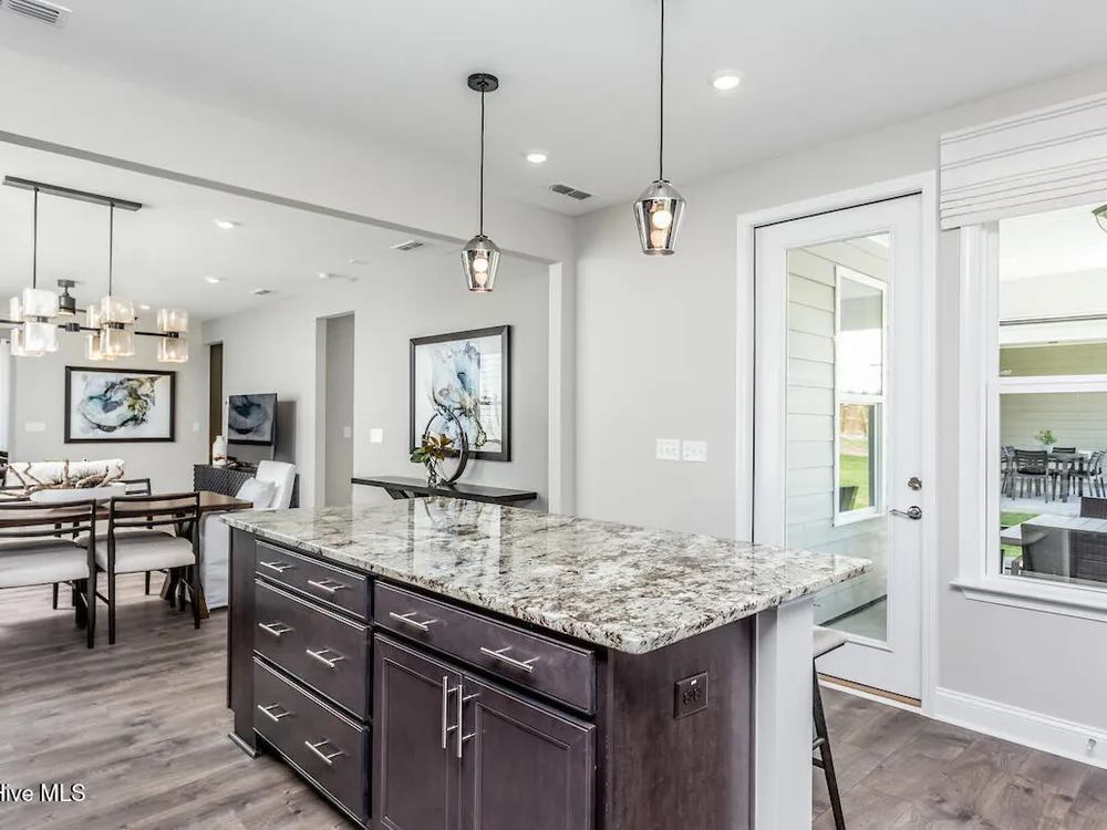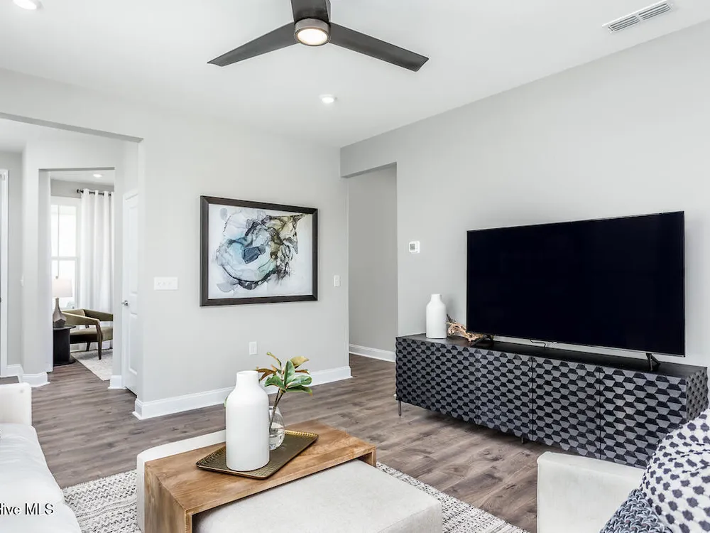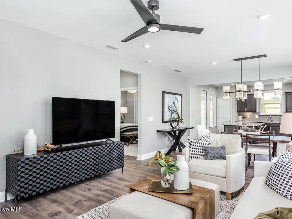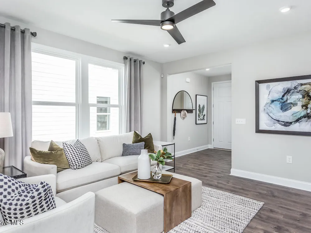 A TWO-STORY home in The Haven at Riverlights! This beautifully designed two-story Compass floor plan with a second floor is 1,979 square feet with 3 bedrooms, 3 full bathrooms, a flex room with glass doors, a large loft space, a screened-in covered patio, and an extended outdoor living space--ideal for relaxing or entertaining. The kitchen is a standout with quartz countertops, white cabinetry, a white tile backsplash, upgraded pendant lighting, and a spacious island perfect for gathering or prep. A sliding glass door leads to the screened-in patio, blending indoor comfort with outdoor charm. The owner's suite is a peaceful retreat, featuring a tray ceiling, a dual-sink vanity with quartz counters, and a white tiled shower with coordinating hexagon tile flooring. At the front of the home, the second bedroom, a full bathroom with tiled tub surround, and the flex room offer privacy and versatility. Upstairs, you'll find a third bedroom, another full bath, and a loft--ideal for guests or a second living area. Additional features include a two-car garage, upgraded flooring throughout, Smart Home technology with a programmable thermostat and video doorbell, and pull-down attic stairs for extra storage. With thoughtful upgrades and a prime location, life at The Haven at Riverlights combines comfort, convenience, and coastal living (only 8 miles to Carolina Beach!). Our on-site Sales Consultant is available seven days a week, and we invite you to tour our beautifully furnished model homes.