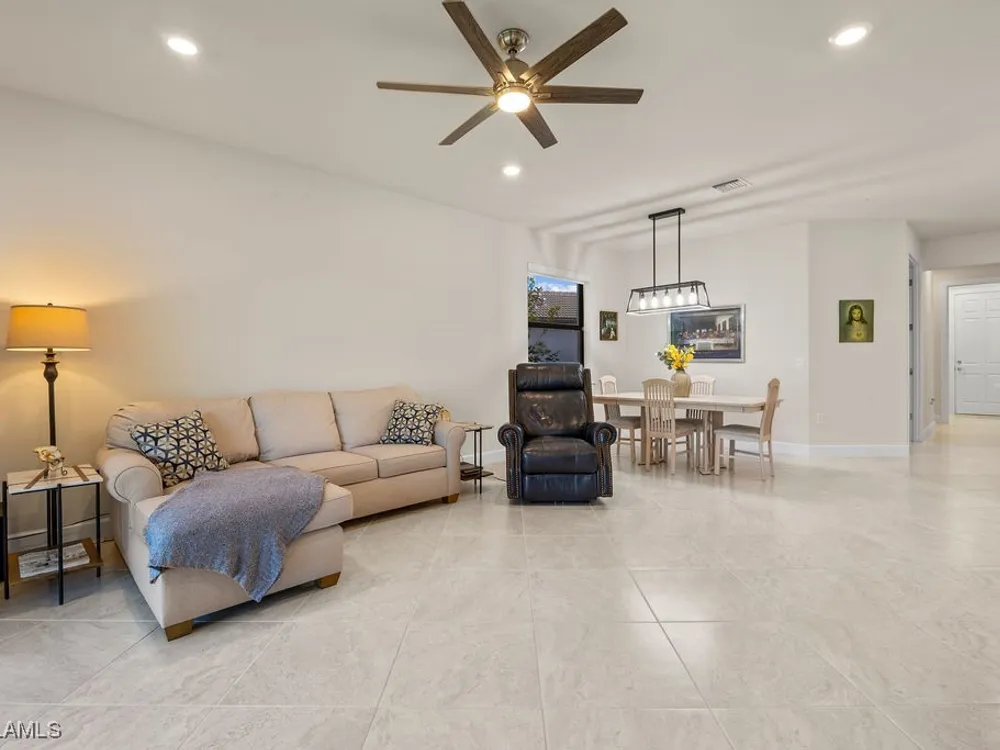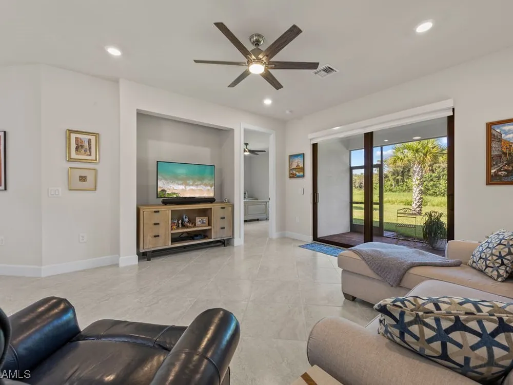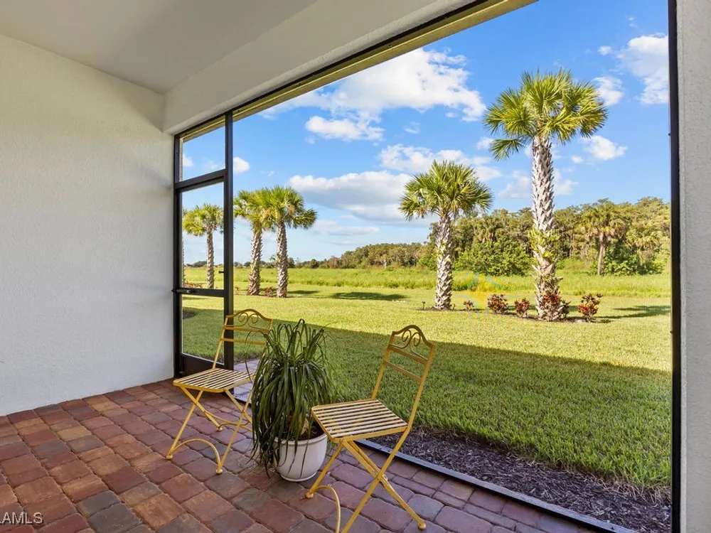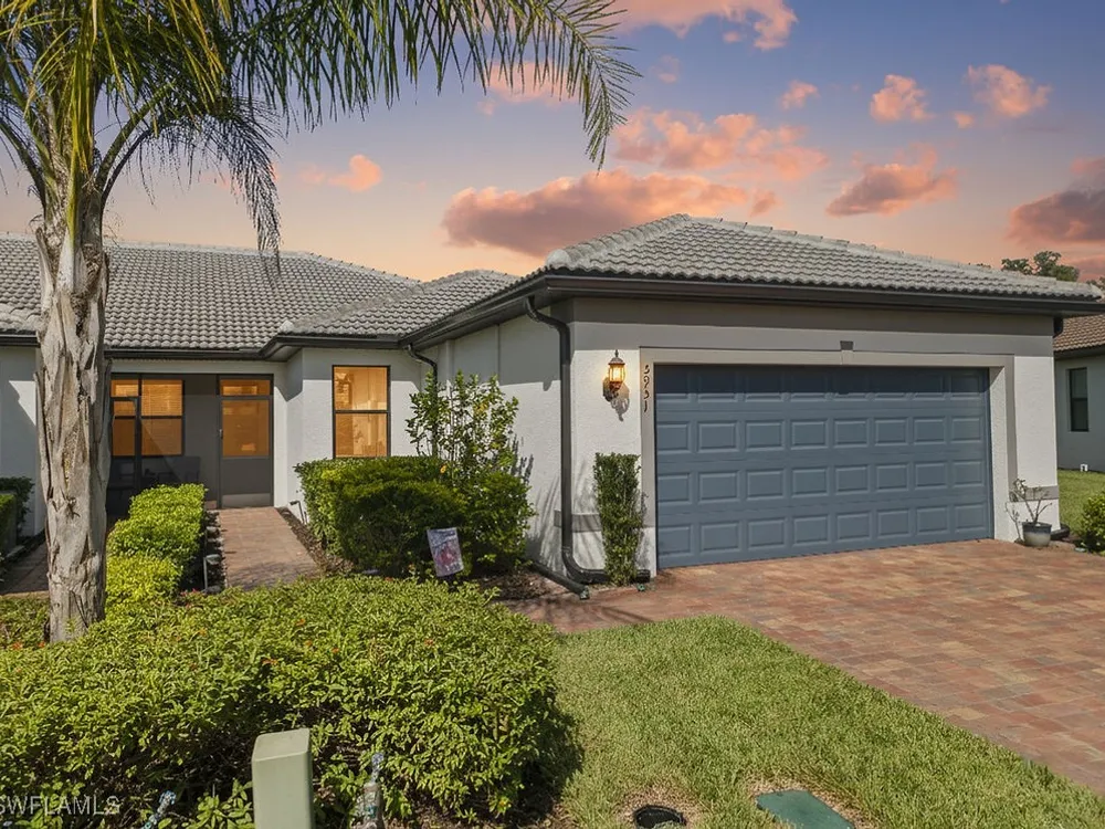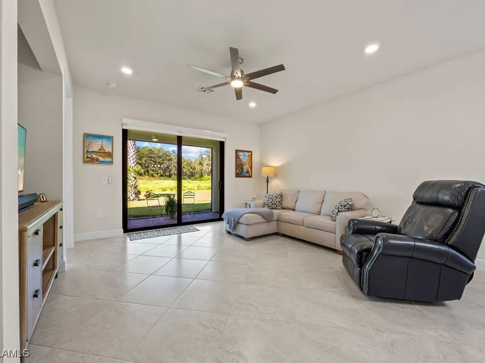 Welcome to this immaculate "Cascadia" model 2 bedroom + den, 2 bathroom end-unit villa located in the desirable 55+ community of Del Webb Naples in Ave Maria. Thoughtfully designed for both comfort and functionality, this home features upgraded porcelain tile flooring set on a diagonal throughout, 8' doors, upgraded baseboards, and custom window treatments over impact-resistant windows for added peace of mind. The open-concept kitchen is highlighted by quartz countertops and timeless shaker-style cabinetry, flowing seamlessly into the bright and spacious living and dining areas – perfect for relaxing or entertaining. The private master suite includes a walk-in closet and a beautifully appointed en-suite bathroom with granite countertops and a large walk-in shower. A flexible den with French door entry provides the ideal space for a home office, guest room, or hobby area. Additional features include a 2-car garage and the advantages of being an end-unit, offering extra privacy and abundant natural light throughout. As a resident, you’ll enjoy access to Del Webb’s Oasis Club resort-style amenities, including two clubhouses, a fitness center, a resort-style pool with beach entry, lap pool, and Jacuzzi; golf simulator, billiards, two tennis courts, twelve lit pickleball courts, four bocce courts, a large catering hall with kitchen, a café, library, arts and crafts room, and an activities director offering a full calendar of social events – all within a golf cart-friendly community. Golf enthusiasts will also appreciate the semi-private championship-style golf course, complete with a pro shop, and on-site golf professional.