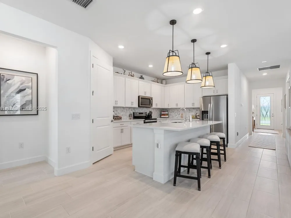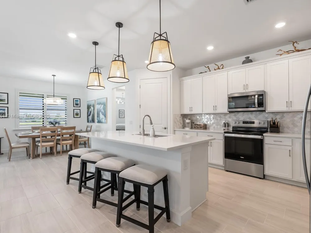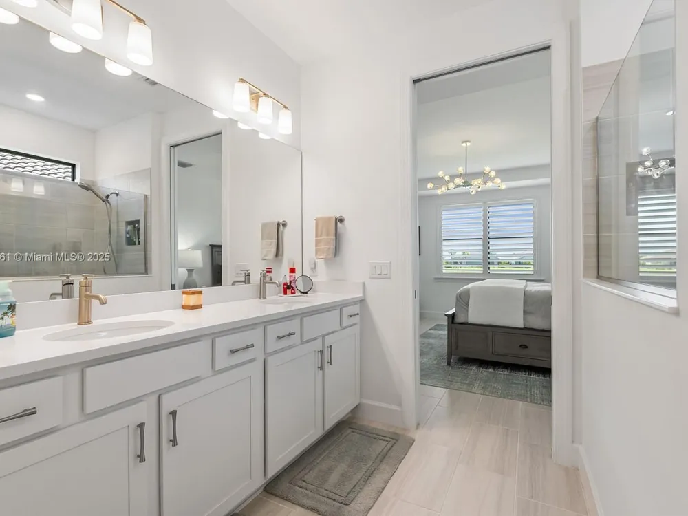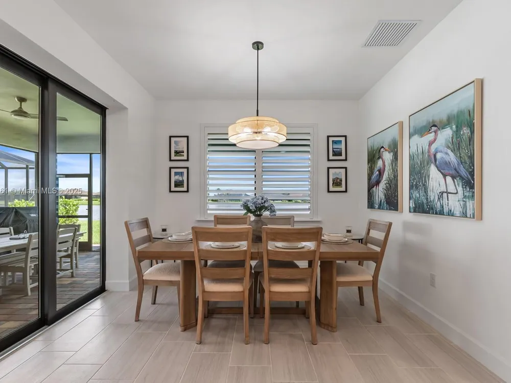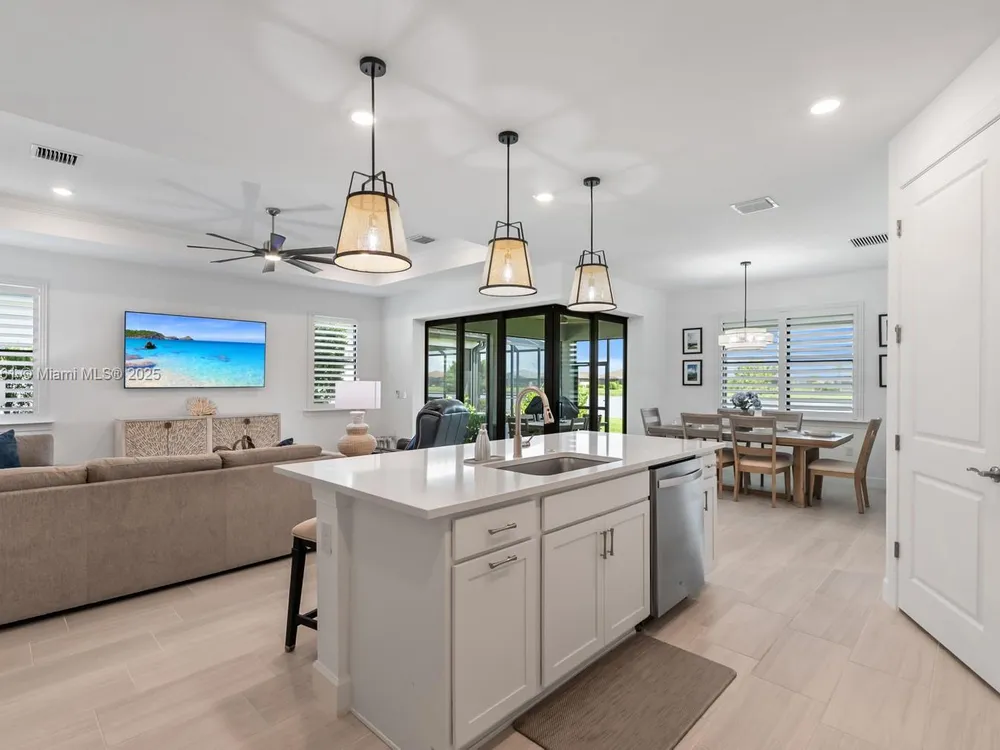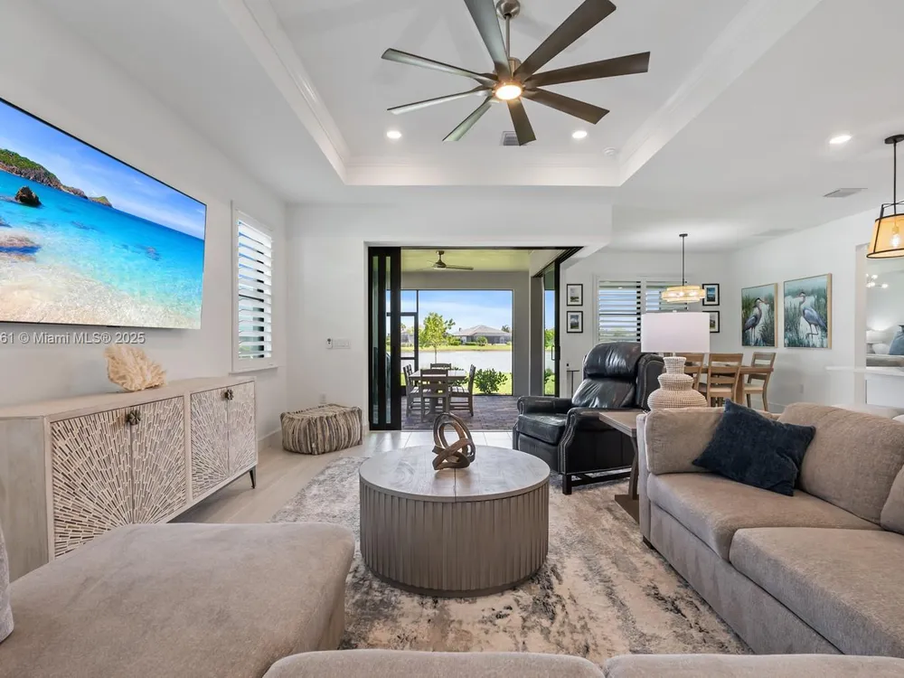 Move right into this nearly new Mystique model in Del Webb Naples...no delays, no builder waitlists. Set on one of the community’s largest lakefront lots, this 2-bedroom plus den, 2-bath home shines with $114,000 in upgrades including quartz countertops, stainless appliances, plantation shutters, and high-end tile throughout. Zero-corner sliders open to an extended screened lanai with sweeping water views and plenty of room for a pool. The oversized 2.5-car garage easily fits a golf cart plus storage, while impact windows, epoxy-coated floors, and custom lighting add style and peace of mind. Enjoy the resort lifestyle with golf, pickleball, tennis, pools, and two clubhouses just steps away...making this home an unbeatable opportunity in Del Webb.