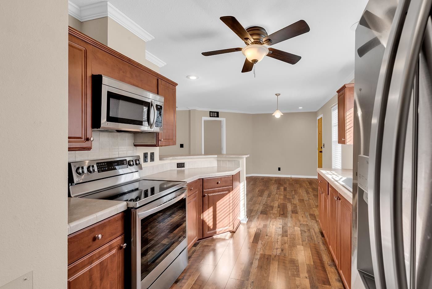- Ceiling Fan(s), Main Level Primary, Split Bedrooms, Separate Shower, Vanity, Window Treatments, Breakfast Bar, Bedroom on Main Level, Stainless Steel Appliances