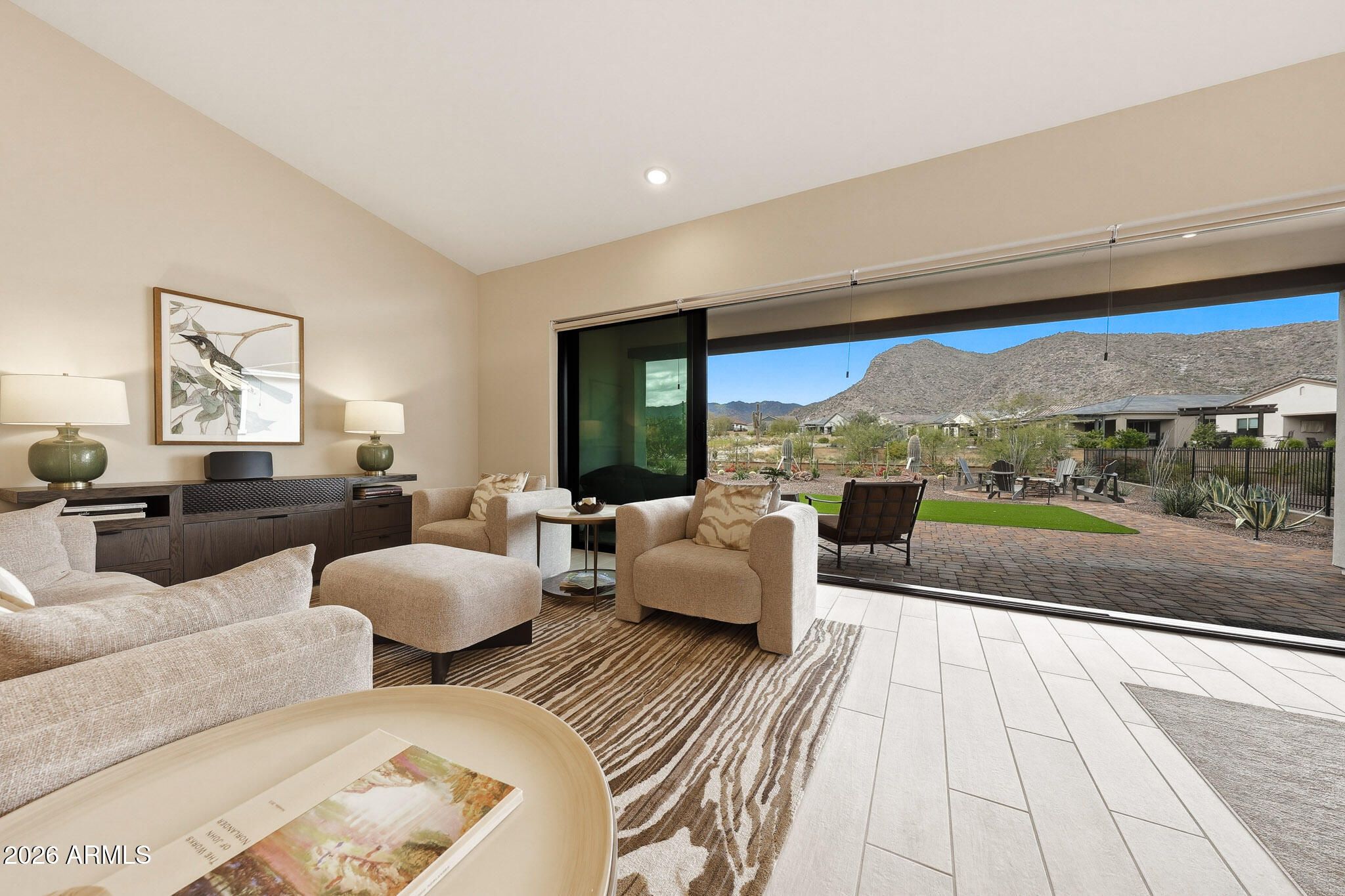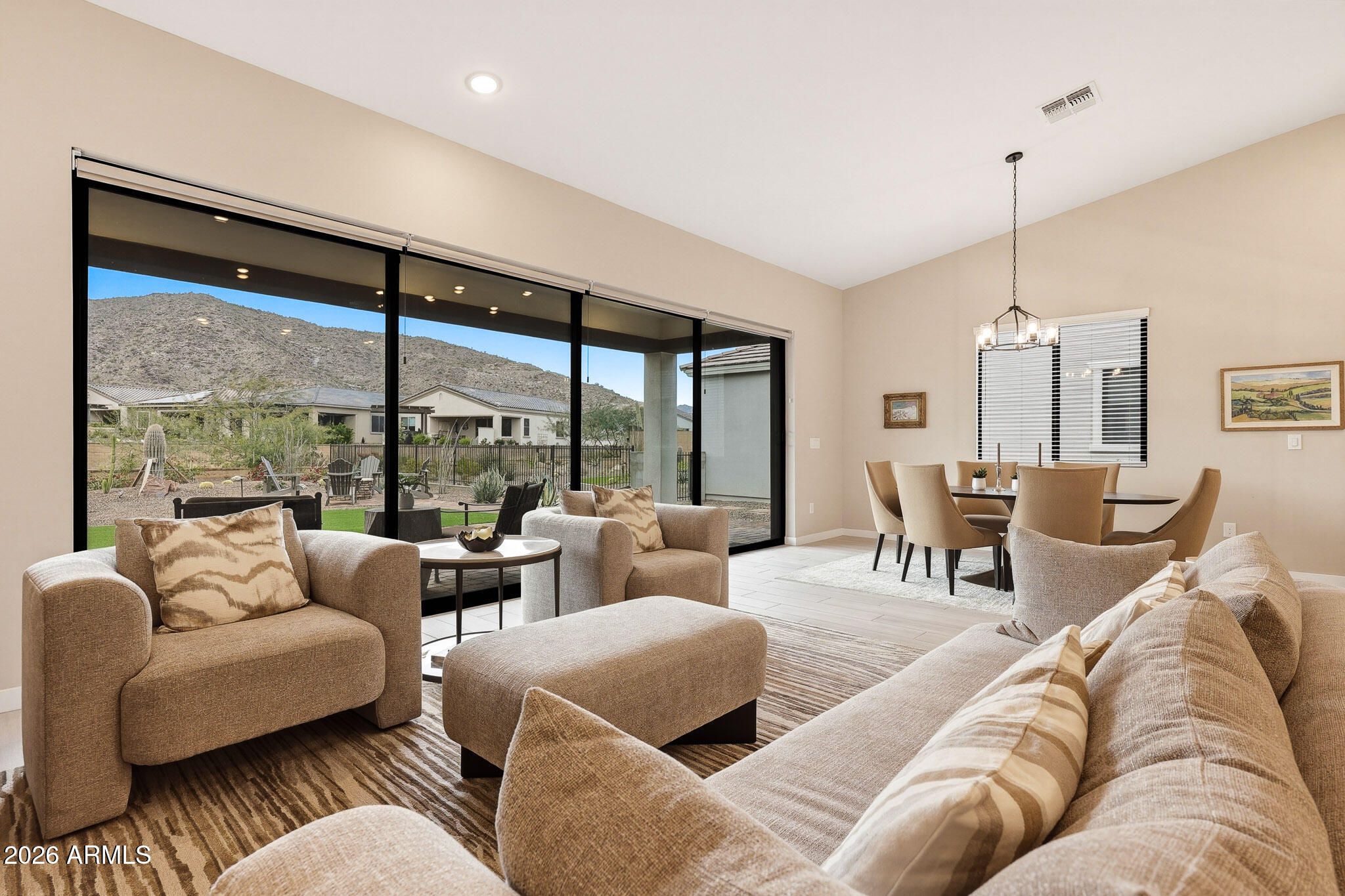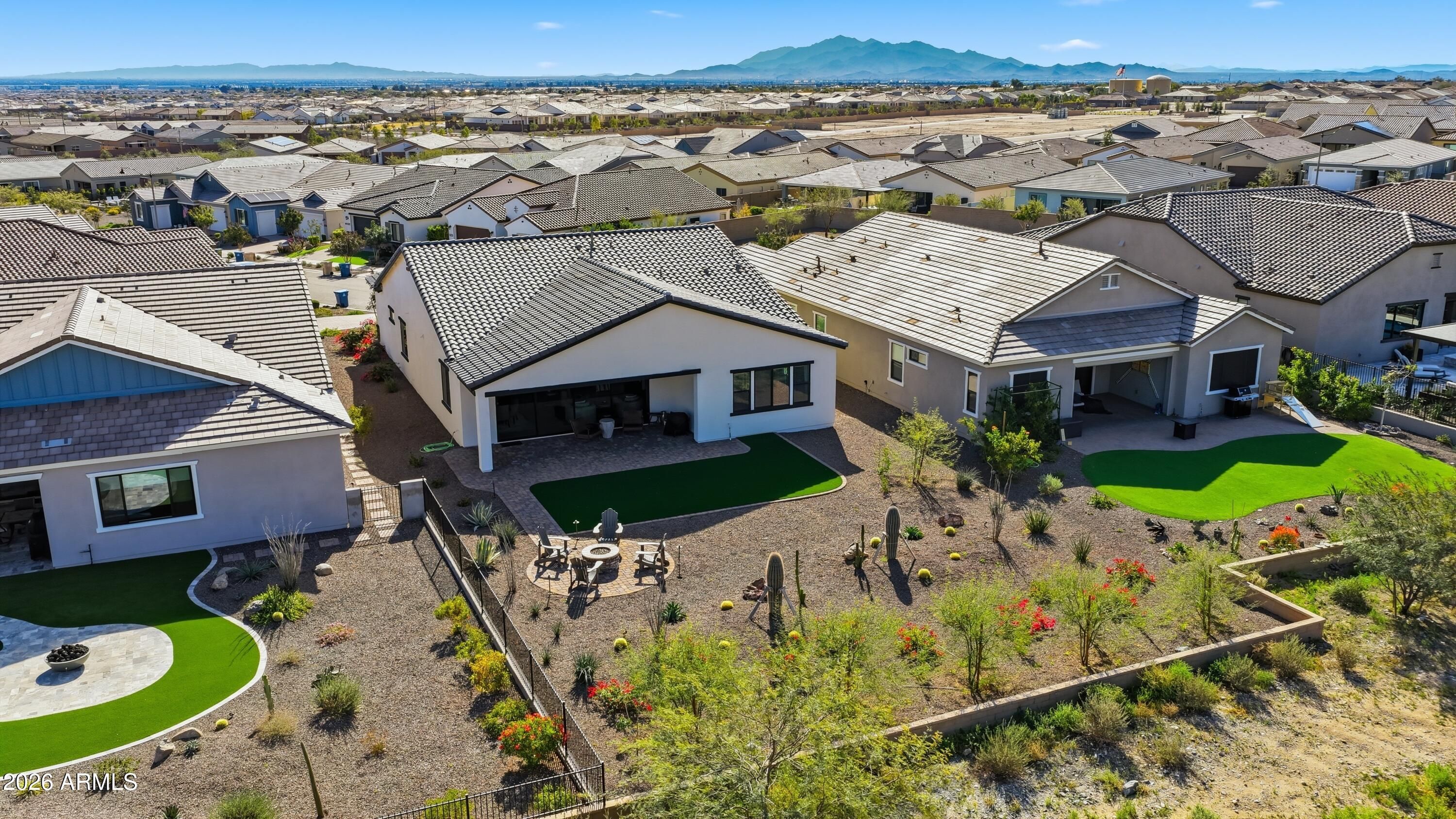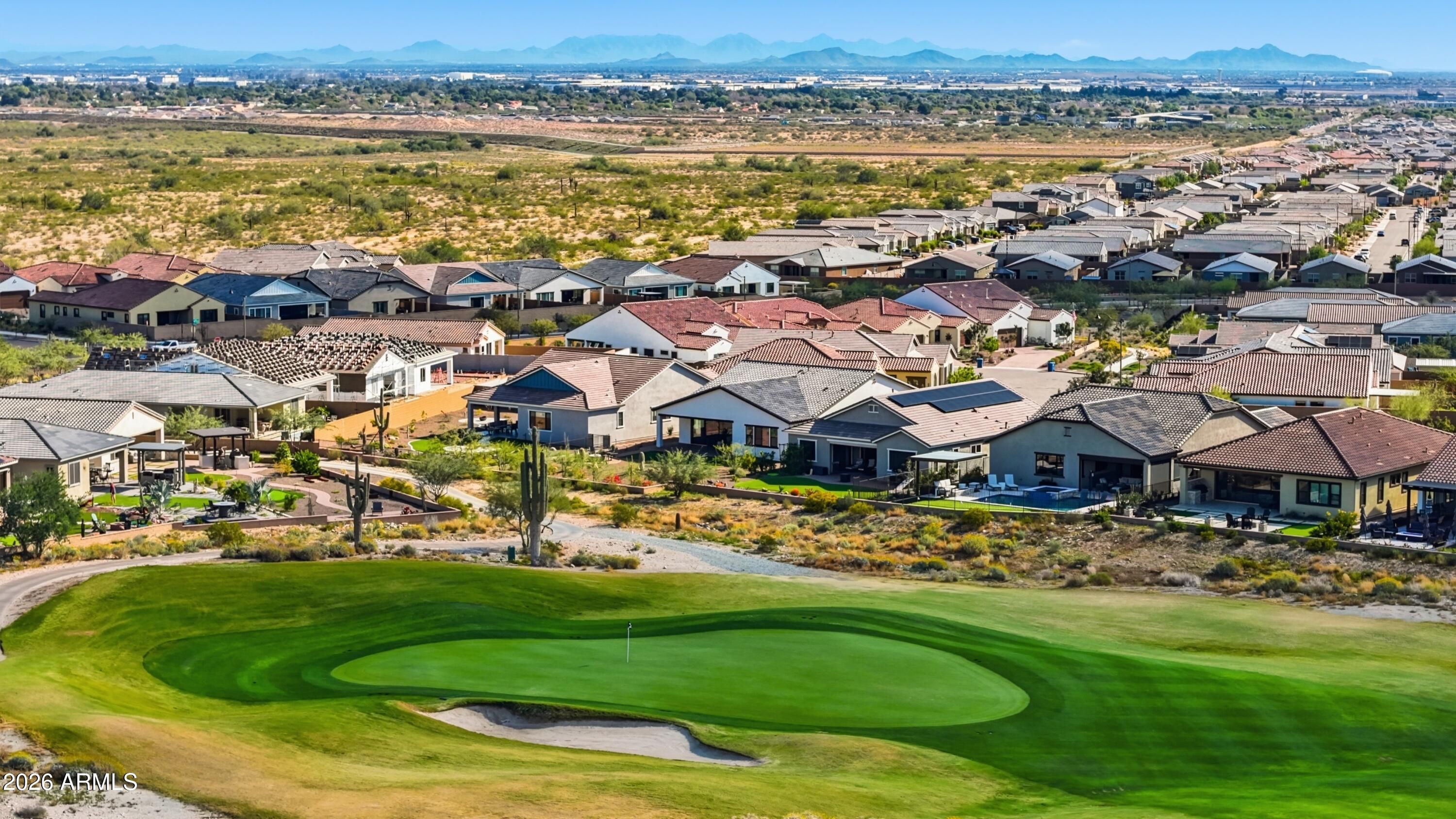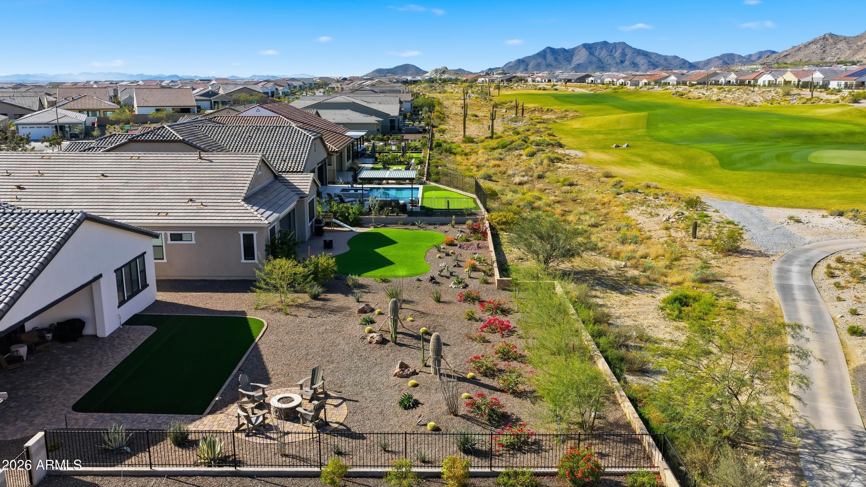 Massive panoramic golf course and mountain views set the stage for this exceptional K. Hovnanian Goldfinch floorplan, ideally positioned on an oversized homesite overlooking the 3rd green of the Victory Course and Tiger Mountain. Thoughtfully designed and beautifully appointed, this 2,235 sqft residence offers refined desert living in one of Arizona's most sought-after active adult communities, Victory at Verrado. The open, airy layout features two spacious bedrooms, two baths, and a versatile den, perfect for a home office or creative retreat. A dramatic 20-foot window wall anchors the great room, framing breathtaking vistas and flooding the space with natural light while creating seamless indoor-outdoor flow. Sleek finishes and elevated upgrades enhance the home's modern aesthetic. An oversized two-car garage with epoxy floors provides ample space for two vehicles plus a golf cart, ideal for embracing the Victory lifestyle in comfort and style. This is more than a home; it's a front-row seat to Arizona's most captivating scenery.