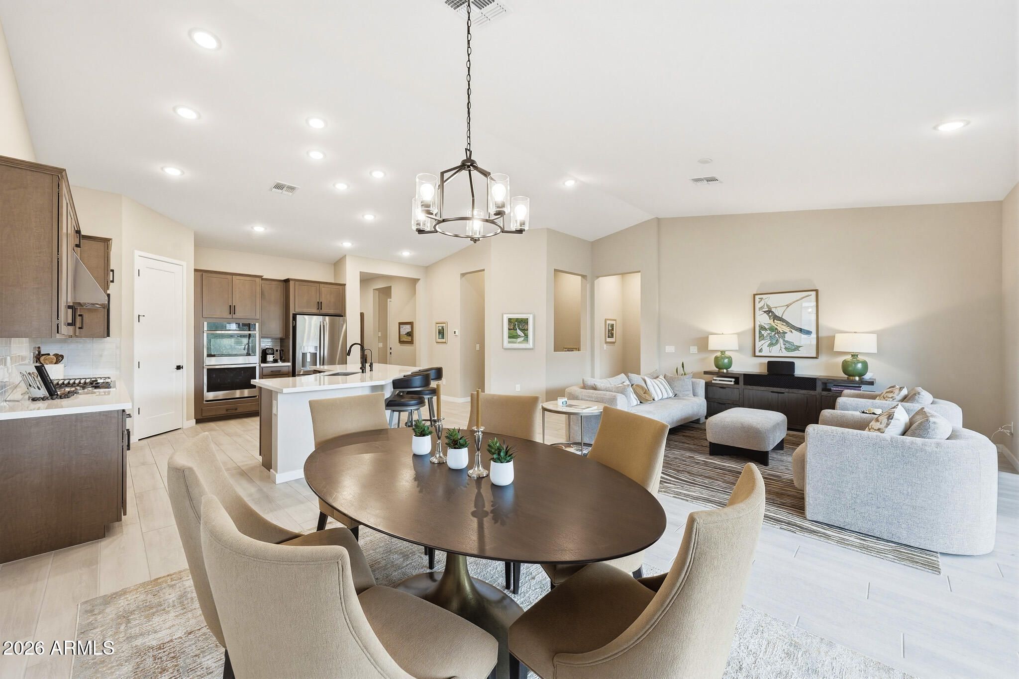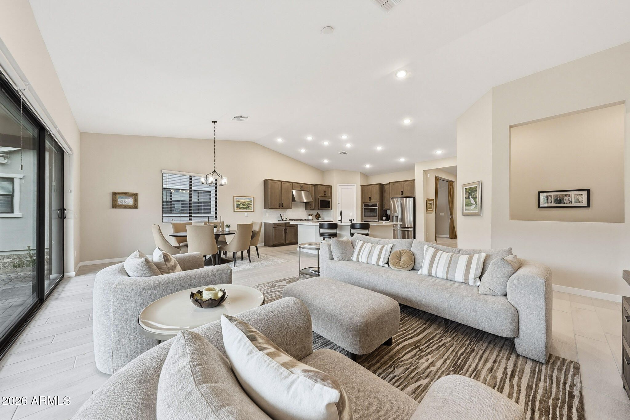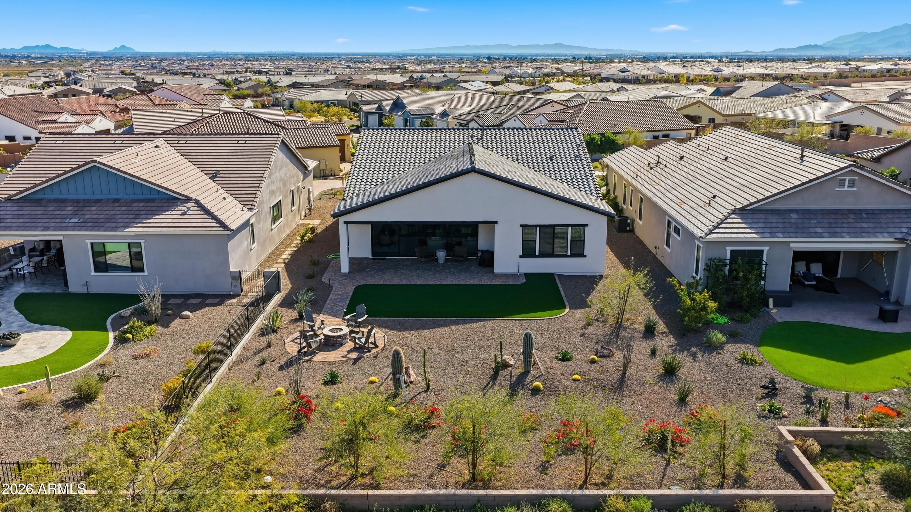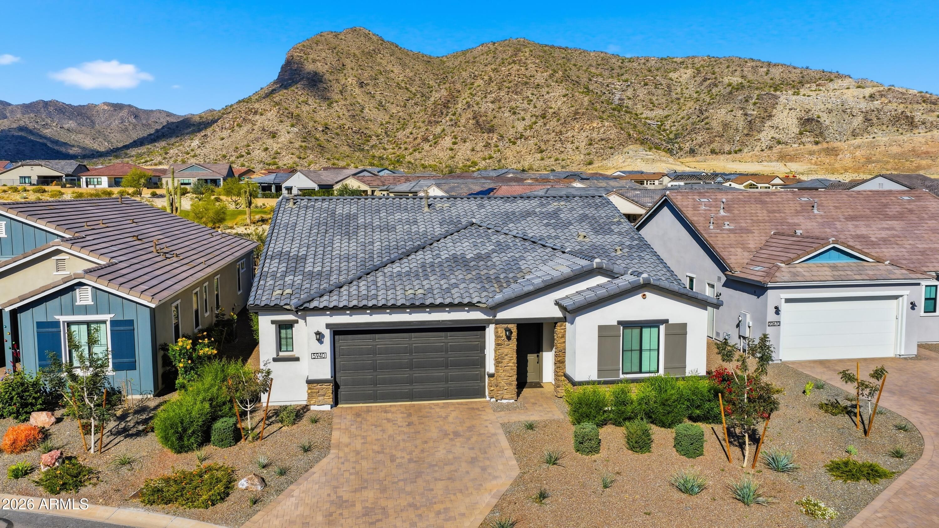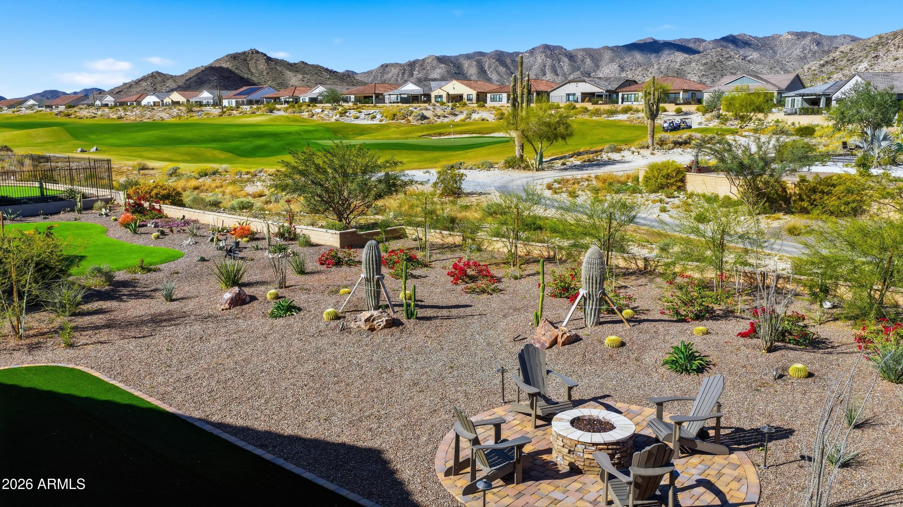 Massive panoramic golf course and mountain views set the stage for this exceptional K. Hovnanian Goldfinch floorplan, ideally positioned on an oversized homesite overlooking the 3rd green of the Victory Course and Tiger Mountain. Thoughtfully designed and beautifully appointed, this 2,235 sqft residence offers refined desert living in one of Arizona's most sought-after active adult communities, Victory at Verrado. The open, airy layout features two spacious bedrooms, two baths, and a versatile den, perfect for a home office or creative retreat. A dramatic 20-foot window wall anchors the great room, framing breathtaking vistas and flooding the space with natural light while creating seamless indoor-outdoor flow. Sleek finishes and elevated upgrades enhance the home's modern aesthetic. An oversized two-car garage with epoxy floors provides ample space for two vehicles plus a golf cart, ideal for embracing the Victory lifestyle in comfort and style. This is more than a home; it's a front-row seat to Arizona's most captivating scenery.