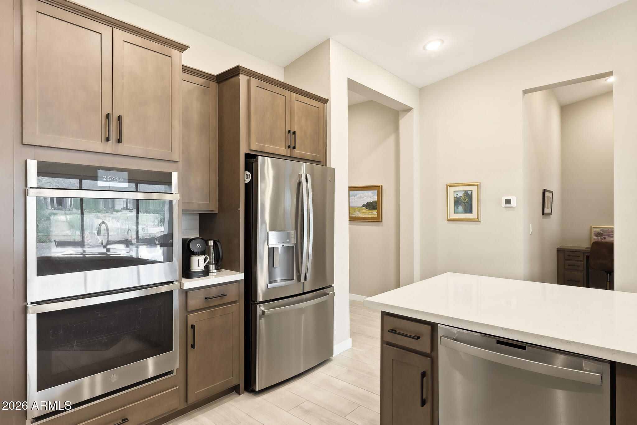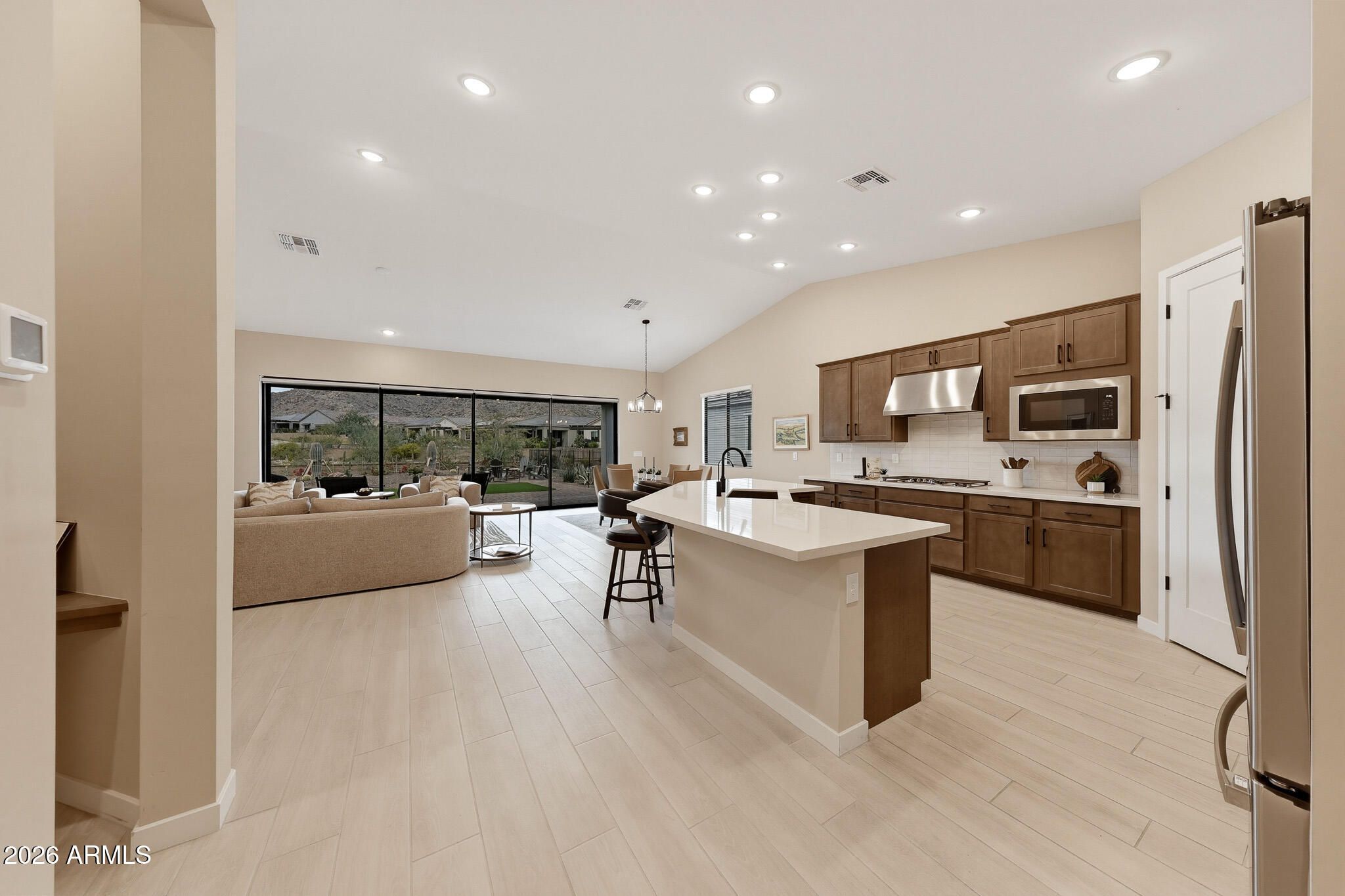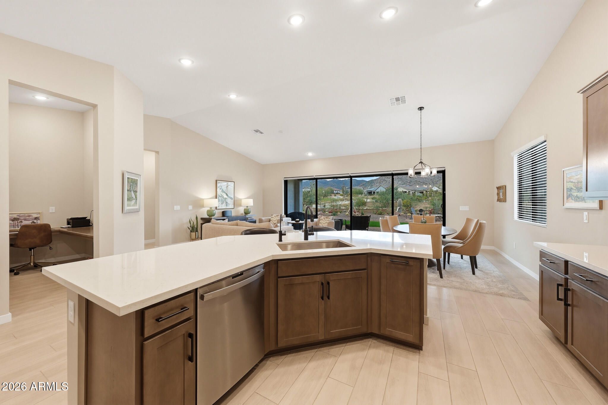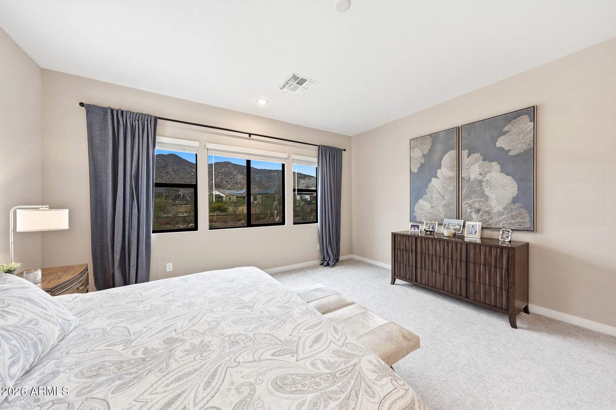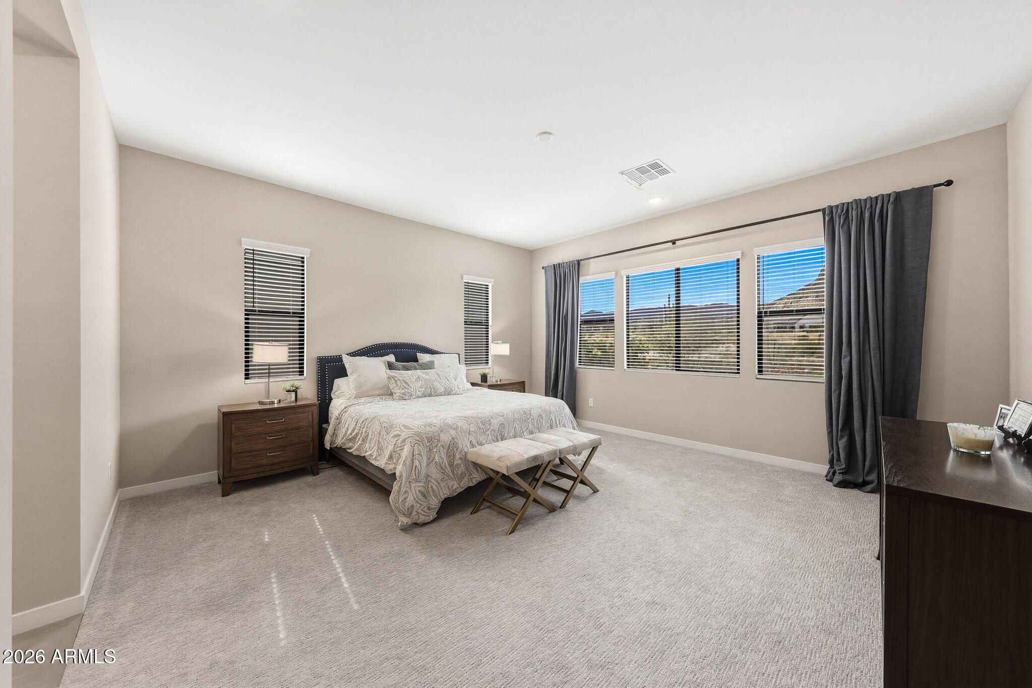 Massive panoramic golf course and mountain views set the stage for this exceptional K. Hovnanian Goldfinch floorplan, ideally positioned on an oversized homesite overlooking the 3rd green of the Victory Course and Tiger Mountain. Thoughtfully designed and beautifully appointed, this 2,235 sqft residence offers refined desert living in one of Arizona's most sought-after active adult communities, Victory at Verrado. The open, airy layout features two spacious bedrooms, two baths, and a versatile den, perfect for a home office or creative retreat. A dramatic 20-foot window wall anchors the great room, framing breathtaking vistas and flooding the space with natural light while creating seamless indoor-outdoor flow. Sleek finishes and elevated upgrades enhance the home's modern aesthetic. An oversized two-car garage with epoxy floors provides ample space for two vehicles plus a golf cart, ideal for embracing the Victory lifestyle in comfort and style. This is more than a home; it's a front-row seat to Arizona's most captivating scenery.