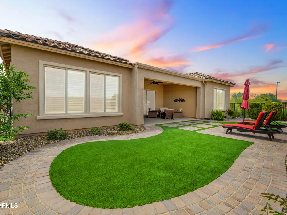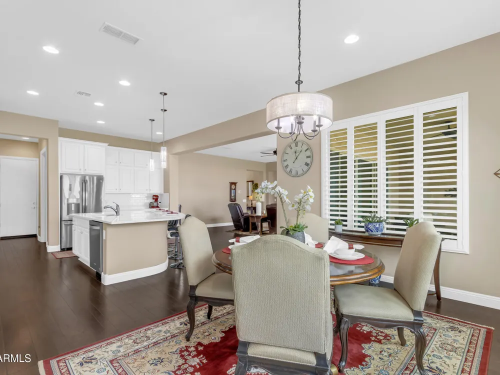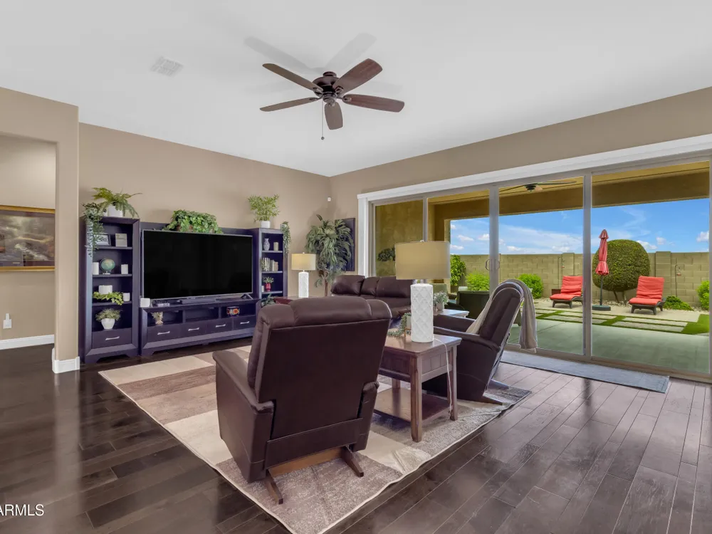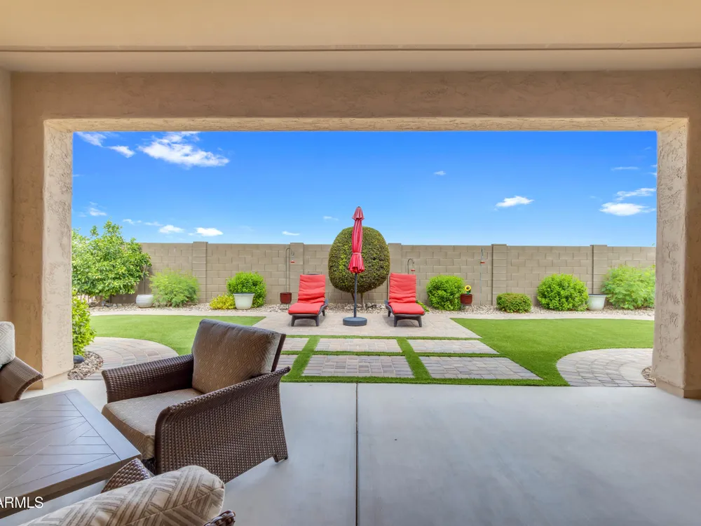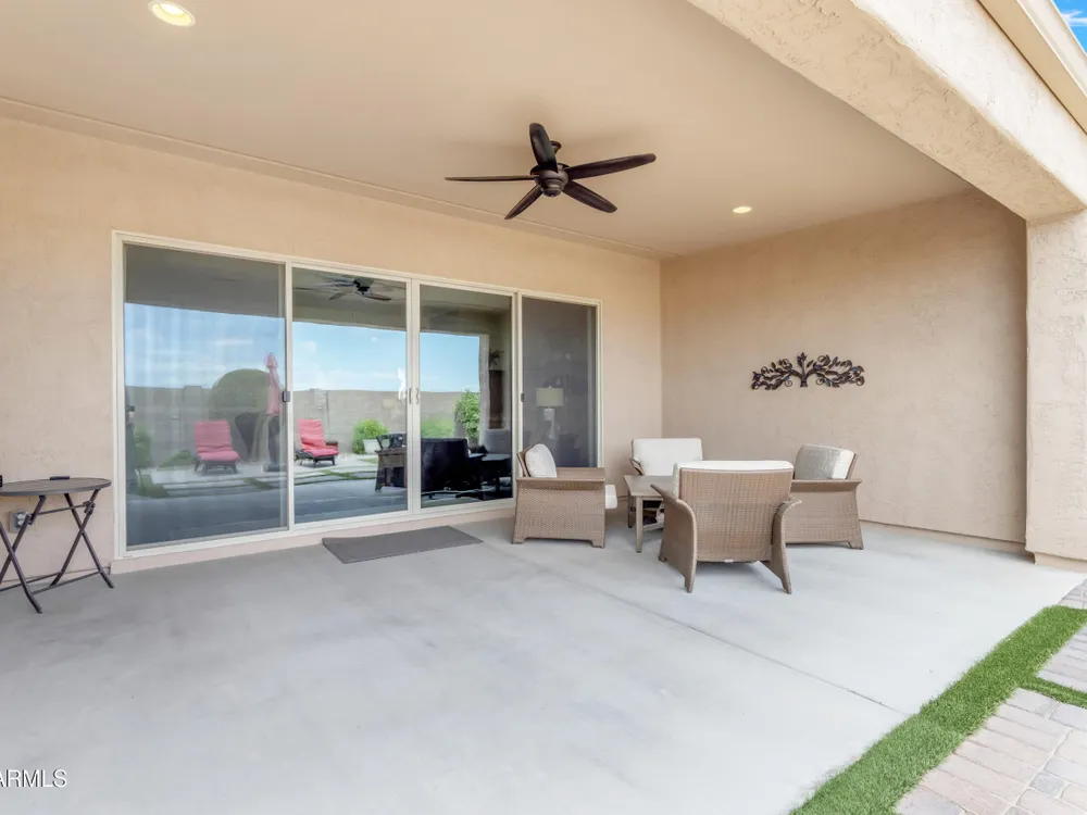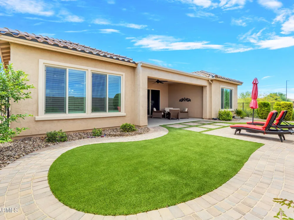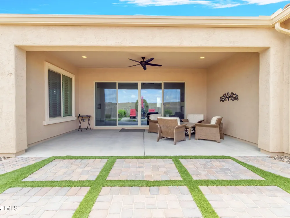 This beautifully maintained ENDEAVOR home on a CORNER LOT features a custom GLASS ENTRY DOOR, rich WOOD LOOK TILE flooring, PLANTATION SHUTTERS, and a CENTER SLIDING GLASS DOOR that opens to a private BACKYARD OASIS with TURF, extended paver seating area, and open space views—perfect for relaxing or entertaining. The GOURMET KITCHEN includes QUARTZ COUNTERTOPS, STAINLESS STEEL APPLIANCES, a glass cooktop, tiled backsplash, pots & pans drawers, and a spacious walk-in pantry. Flexible living includes a den with French doors and a bonus flex space ideal for crafts or an office. The luxurious primary suite offers DUAL VANITIES, a glass walk-in shower, and an oversized walk-in closet. Additional upgrades include a solar system to save on utilities, a whole-house H2O Concepts water system, and an OVERSIZED LAUNDRY ROOM with cabinets and counter space. Sun City Anthem at Merrill Ranch offers a 48,000 SF recreation center w/ craft rooms for quilting, pottery, glass works, and jewelry to name a few, spacious ballroom for dancing, theatre productions, concerts and more. Also includes a full gym, work out rooms, indoor lap pool & spa, walking track, cafe area, card rooms, poker tables, pool table, ping pong table, business center, class room for interesting seminars! Troon Poston Butte Golf Course is one of the nicest in the area. Sun City offers Pickleball, Tennis, Bocce Ball, Horseshoes, Shuffleboard, clubs for all activities. True resort-style living at its best!