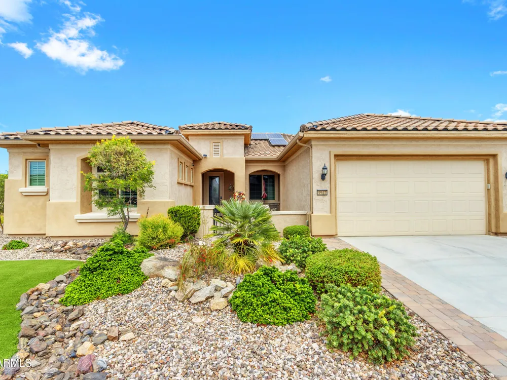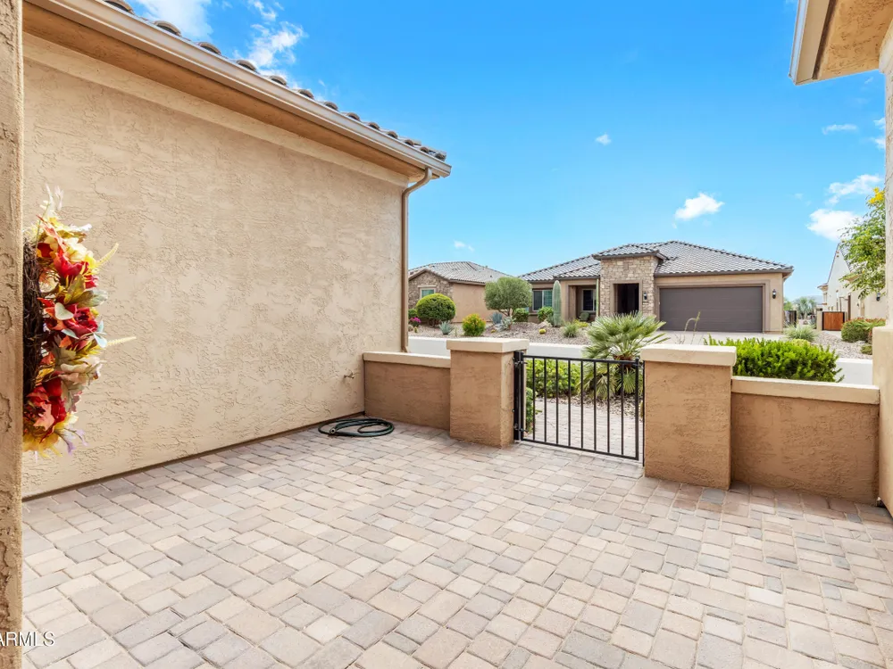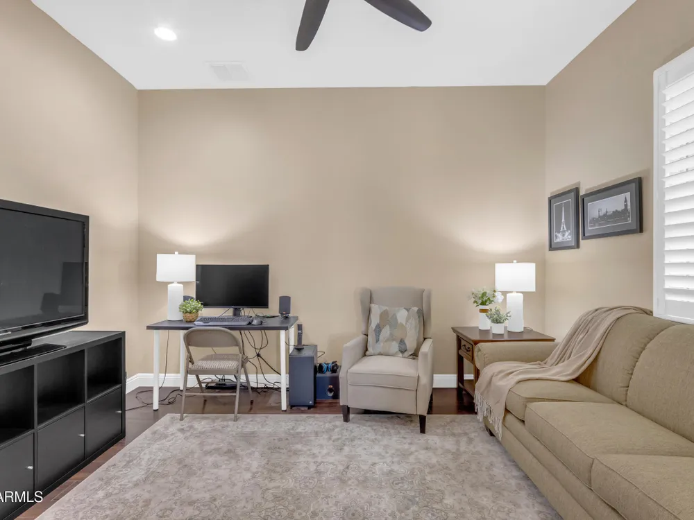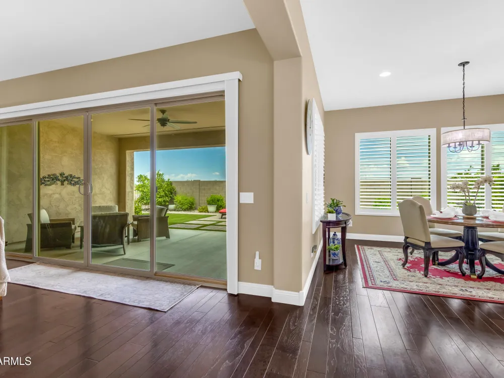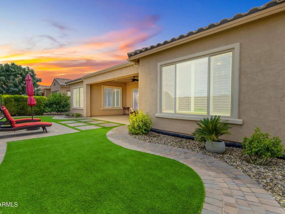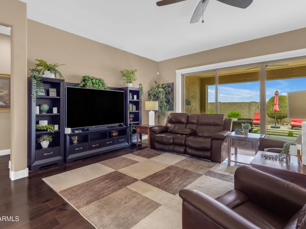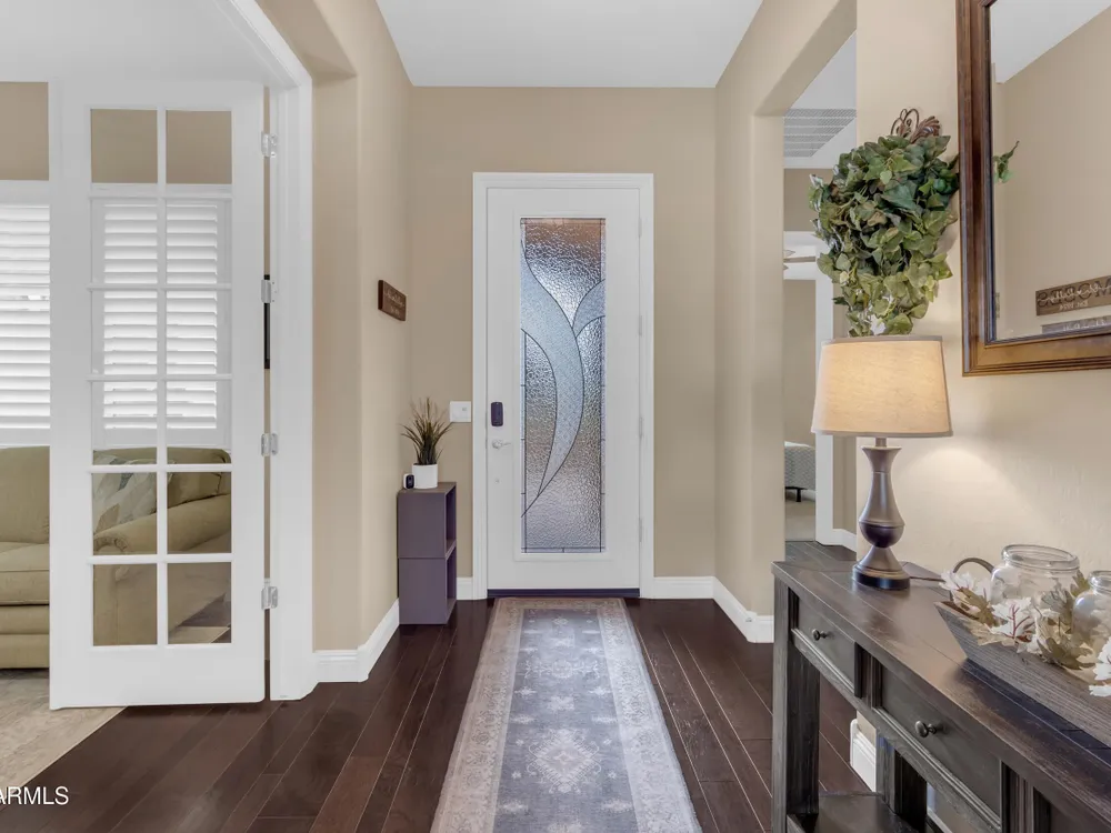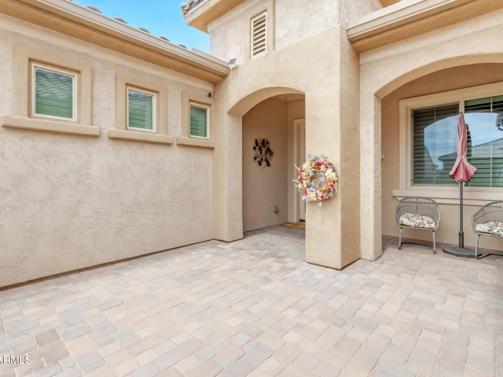 This beautifully maintained ENDEAVOR home on a CORNER LOT features a custom GLASS ENTRY DOOR, rich WOOD LOOK TILE flooring, PLANTATION SHUTTERS, and a CENTER SLIDING GLASS DOOR that opens to a private BACKYARD OASIS with TURF, extended paver seating area, and open space views—perfect for relaxing or entertaining. The GOURMET KITCHEN includes QUARTZ COUNTERTOPS, STAINLESS STEEL APPLIANCES, a glass cooktop, tiled backsplash, pots & pans drawers, and a spacious walk-in pantry. Flexible living includes a den with French doors and a bonus flex space ideal for crafts or an office. The luxurious primary suite offers DUAL VANITIES, a glass walk-in shower, and an oversized walk-in closet. Additional upgrades include a solar system to save on utilities, a whole-house H2O Concepts water system, and an OVERSIZED LAUNDRY ROOM with cabinets and counter space. Sun City Anthem at Merrill Ranch offers a 48,000 SF recreation center w/ craft rooms for quilting, pottery, glass works, and jewelry to name a few, spacious ballroom for dancing, theatre productions, concerts and more. Also includes a full gym, work out rooms, indoor lap pool & spa, walking track, cafe area, card rooms, poker tables, pool table, ping pong table, business center, class room for interesting seminars! Troon Poston Butte Golf Course is one of the nicest in the area. Sun City offers Pickleball, Tennis, Bocce Ball, Horseshoes, Shuffleboard, clubs for all activities. True resort-style living at its best!