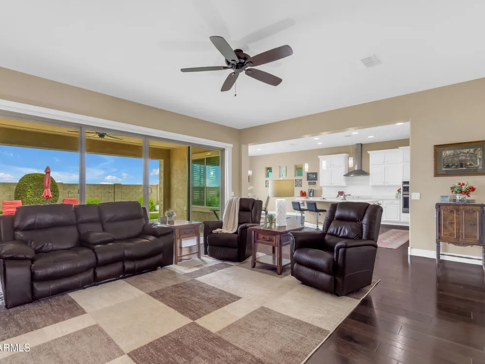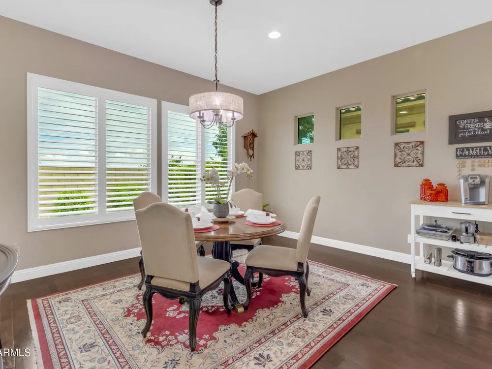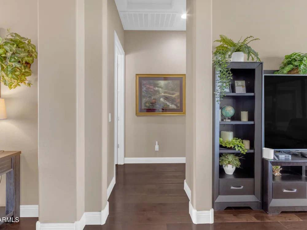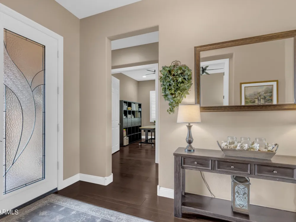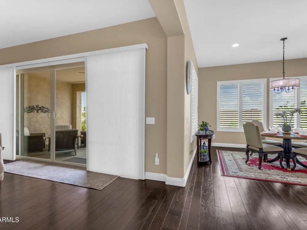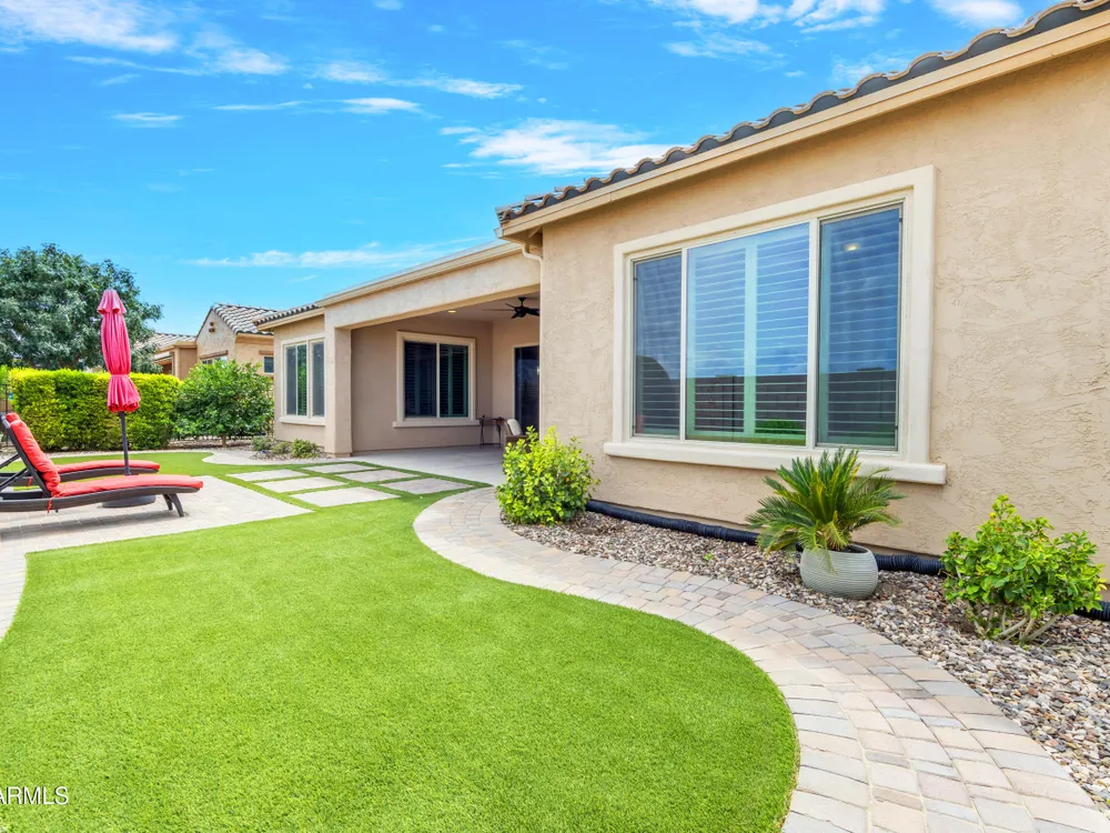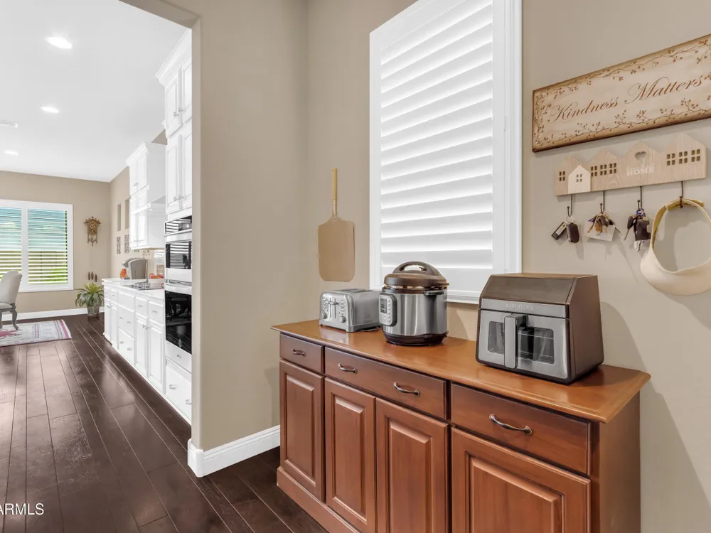 This beautifully maintained ENDEAVOR home on a CORNER LOT features a custom GLASS ENTRY DOOR, rich WOOD LOOK TILE flooring, PLANTATION SHUTTERS, and a CENTER SLIDING GLASS DOOR that opens to a private BACKYARD OASIS with TURF, extended paver seating area, and open space views—perfect for relaxing or entertaining. The GOURMET KITCHEN includes QUARTZ COUNTERTOPS, STAINLESS STEEL APPLIANCES, a glass cooktop, tiled backsplash, pots & pans drawers, and a spacious walk-in pantry. Flexible living includes a den with French doors and a bonus flex space ideal for crafts or an office. The luxurious primary suite offers DUAL VANITIES, a glass walk-in shower, and an oversized walk-in closet. Additional upgrades include a solar system to save on utilities, a whole-house H2O Concepts water system, and an OVERSIZED LAUNDRY ROOM with cabinets and counter space. Sun City Anthem at Merrill Ranch offers a 48,000 SF recreation center w/ craft rooms for quilting, pottery, glass works, and jewelry to name a few, spacious ballroom for dancing, theatre productions, concerts and more. Also includes a full gym, work out rooms, indoor lap pool & spa, walking track, cafe area, card rooms, poker tables, pool table, ping pong table, business center, class room for interesting seminars! Troon Poston Butte Golf Course is one of the nicest in the area. Sun City offers Pickleball, Tennis, Bocce Ball, Horseshoes, Shuffleboard, clubs for all activities. True resort-style living at its best!