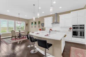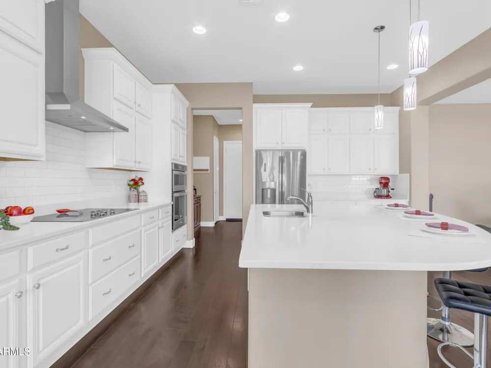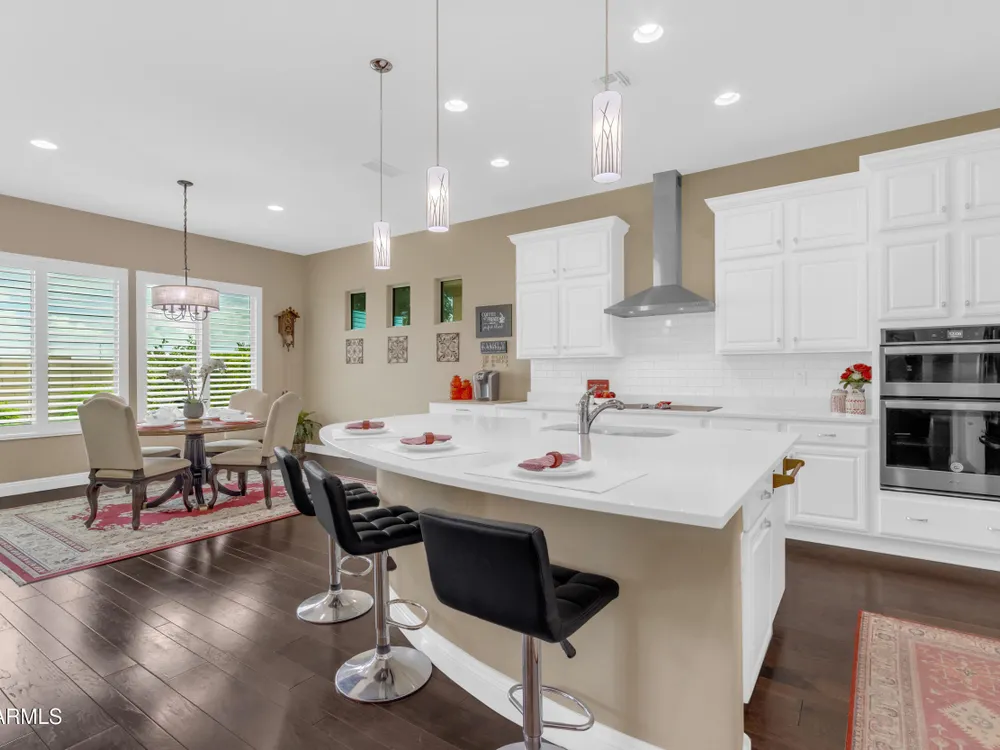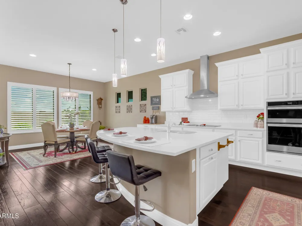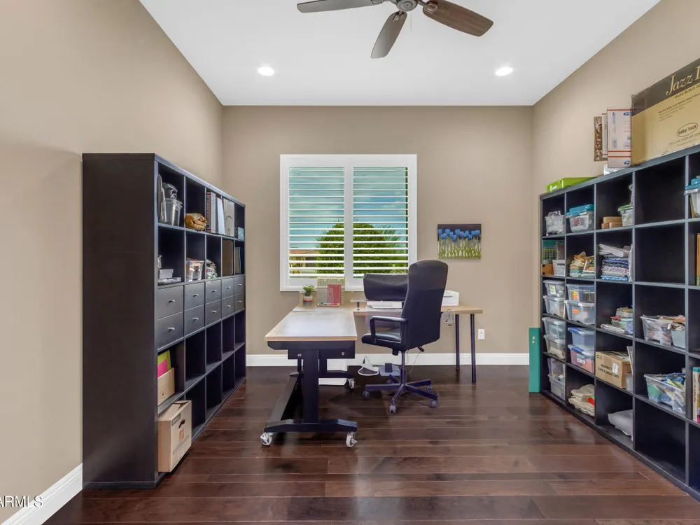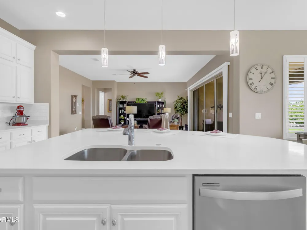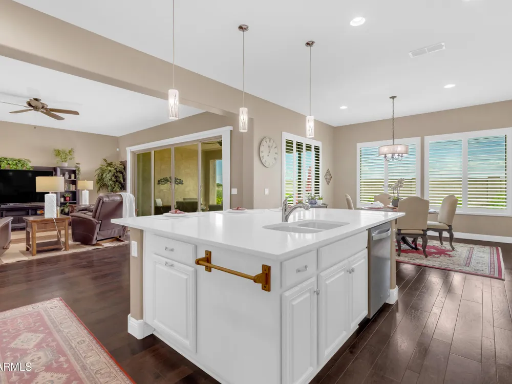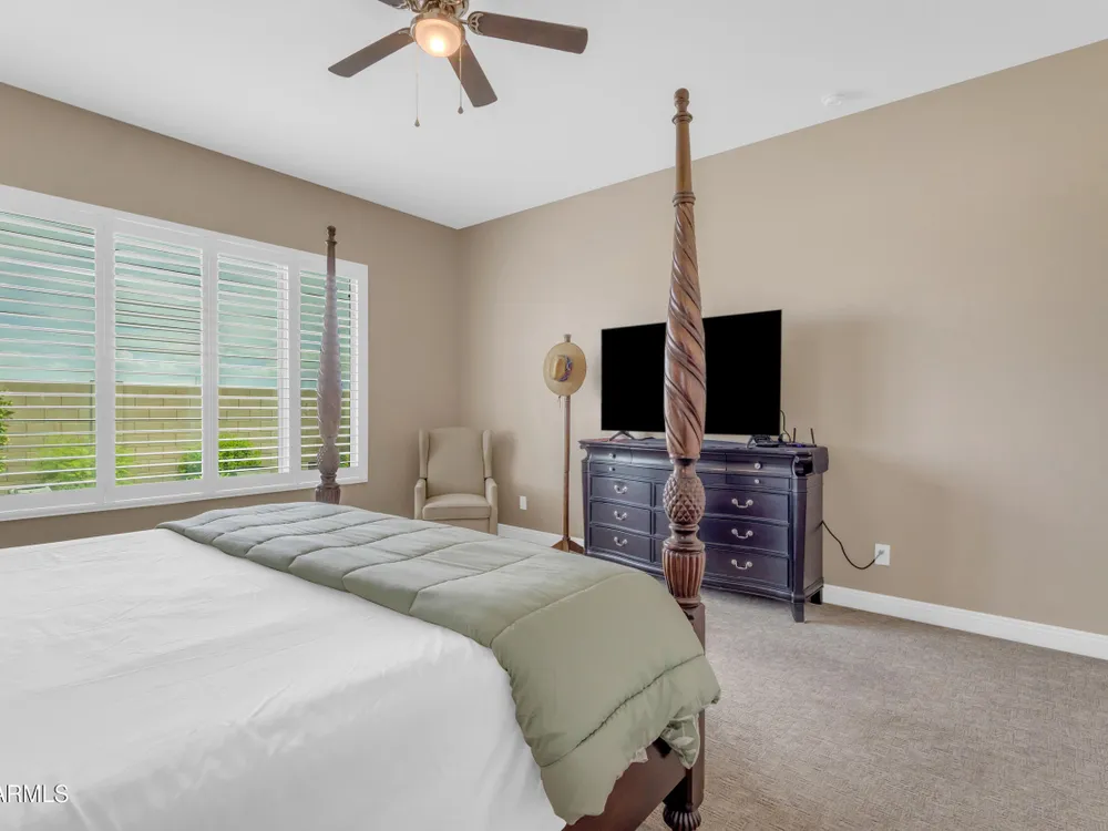 This beautifully maintained ENDEAVOR home on a CORNER LOT features a custom GLASS ENTRY DOOR, rich WOOD LOOK TILE flooring, PLANTATION SHUTTERS, and a CENTER SLIDING GLASS DOOR that opens to a private BACKYARD OASIS with TURF, extended paver seating area, and open space views—perfect for relaxing or entertaining. The GOURMET KITCHEN includes QUARTZ COUNTERTOPS, STAINLESS STEEL APPLIANCES, a glass cooktop, tiled backsplash, pots & pans drawers, and a spacious walk-in pantry. Flexible living includes a den with French doors and a bonus flex space ideal for crafts or an office. The luxurious primary suite offers DUAL VANITIES, a glass walk-in shower, and an oversized walk-in closet. Additional upgrades include a solar system to save on utilities, a whole-house H2O Concepts water system, and an OVERSIZED LAUNDRY ROOM with cabinets and counter space. Sun City Anthem at Merrill Ranch offers a 48,000 SF recreation center w/ craft rooms for quilting, pottery, glass works, and jewelry to name a few, spacious ballroom for dancing, theatre productions, concerts and more. Also includes a full gym, work out rooms, indoor lap pool & spa, walking track, cafe area, card rooms, poker tables, pool table, ping pong table, business center, class room for interesting seminars! Troon Poston Butte Golf Course is one of the nicest in the area. Sun City offers Pickleball, Tennis, Bocce Ball, Horseshoes, Shuffleboard, clubs for all activities. True resort-style living at its best!