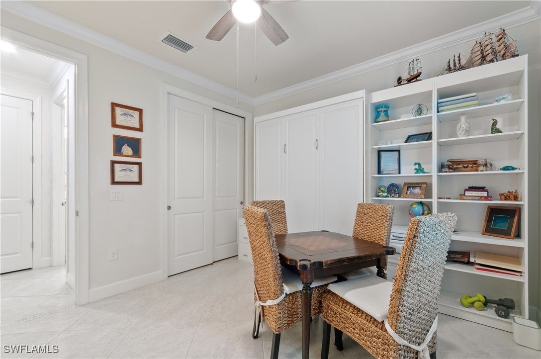 Enter this exceptional Summerwood model through the leaded-glass front door into a stunning wide foyer, where numerous upgrades create a light and airy atmosphere. Diagonally laid tile flows seamlessly throughout the entire home and is complemented by elegant crown molding in every room and hallway. The spacious living area features 90-degree pocketing sliders, offering true indoor-outdoor Florida living, and opens to an expansive lanai with peaceful pond views and a beautiful array of tropical birds. The upgraded kitchen is both stylish and functional, featuring a long island that seats four, cabinetry on both ends, a sleek slide-in stove, and ample storage with convenient pull-out lower drawers. The master suite boasts a designer tray ceiling and serene pond views, while the elegant en-suite bath includes double sinks and a large Roman shower. The front bedroom offers a built-in Murphy bed with two bookcases, a built-in laptop drawer, and two file drawers. The den is versatile and can easily be used as a bedroom or office, featuring elegant French doors. Additional highlights include impact-resistant doors and windows for security and energy efficiency, and a tandem garage that accommodates two cars and a golf cart or two vehicles and a workshop, with pull-down attic stairs for additional storage. This home is within walking distance to both clubhouses and the Rusty Putter Restaurant, and the community offers extensive amenities including 12 pickleball courts, two tennis courts, four bocce ball courts, a resort-style heated pool, lap pool, spa, fitness center, sauna, fitness classes, an 18-hole par-72 golf course, golf simulator, driving and putting range, garden plots, and numerous clubs and activities. Ave Maria also hosts seasonal festivals and a winter farmers’ market, making this an exceptional place to live and play. HOA cover high speed internet and cable with a lot of stations. The HOA also pays for your landscaping maintenance and sprinklers.