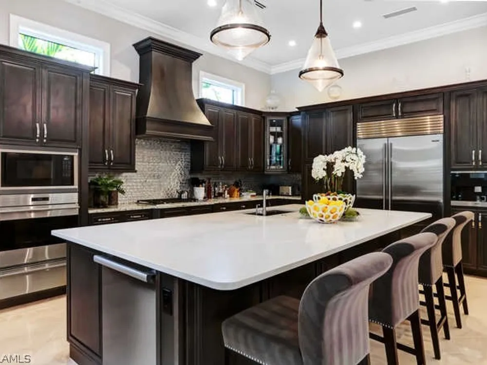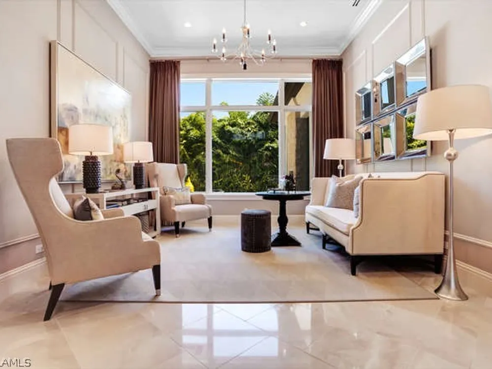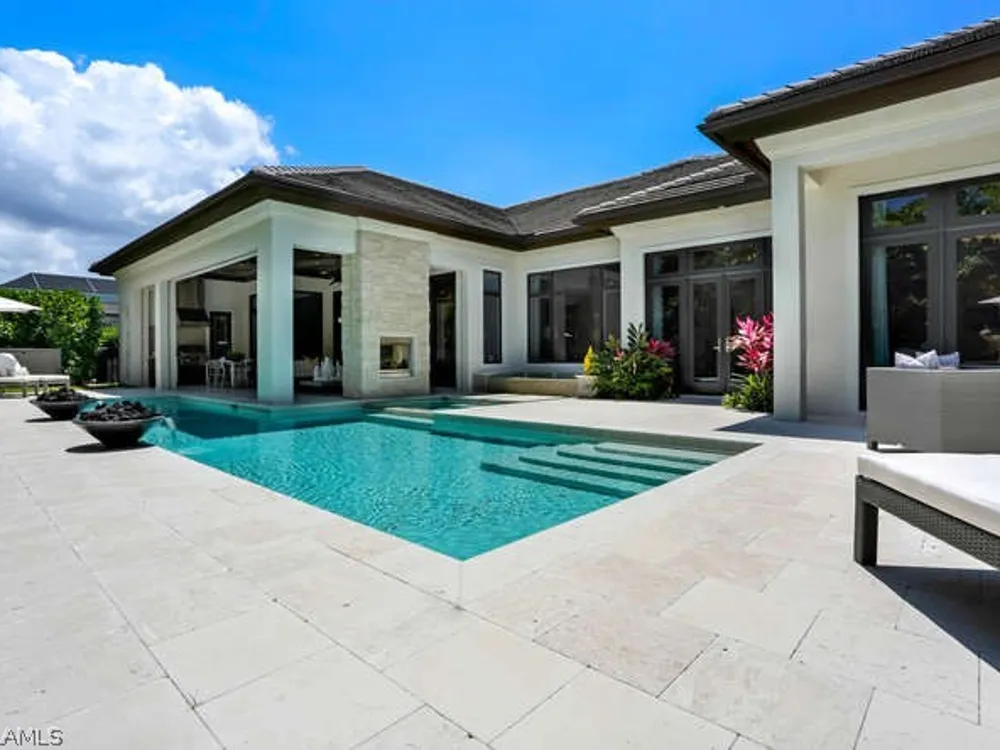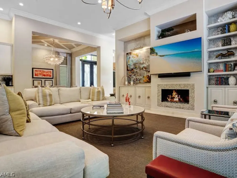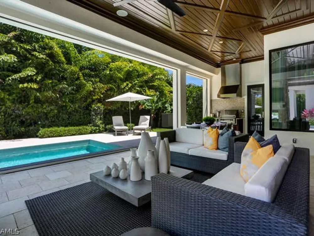 2015 Furnished former MODEL! Undeniably one of the most sought after neighborhoods is the Moorings located west of 41 between Park Shore and Old Naples. This 2015 model home has irresistible appeal, the upgrades dominates the trends for today’s buyer. Impressive curb appeal at first glance the facade revels West Indies architecture, gated walk way entrance and complete with outside multilevel water features with see- thru fireplace inside and out. One story residence that awakens you with a sense that you just found the perfect home. The great “ reveal “ in the kitchen is behind a door to gigantic walk-in pantry. Island kitchen bar , eat in breakfast area, 2 dish washers, refrigerator drawers, and gas cook top add to this dream kitchen. Seamless entertainment spaces and a balance of light, fine finishes and rich wood floors in all 4 bedrooms. and office. Wine room (refrigerated) and bar with sink its time to relax. 4 bedrooms, den/ library, 6 baths,(4 full) 2 1/2’s) 3 AC car garages, plus full house generator. High tech features includes HD TV’s with kaleidoscope, matrix rewind( view from any TV) Power screens and shutters, elective drapes and shades. Residents are eligible for membership to Mooring private beach park Proximity to myriad shopping, dining, and cultural offerings. You can quick golf cart ride away to many fun places.