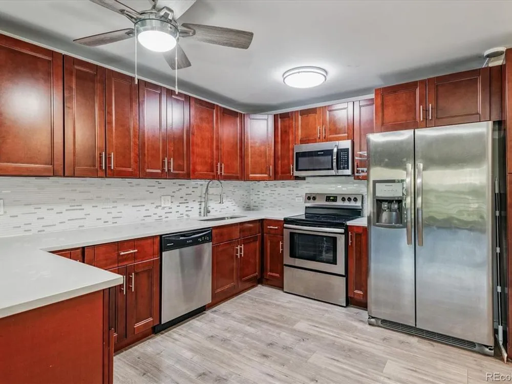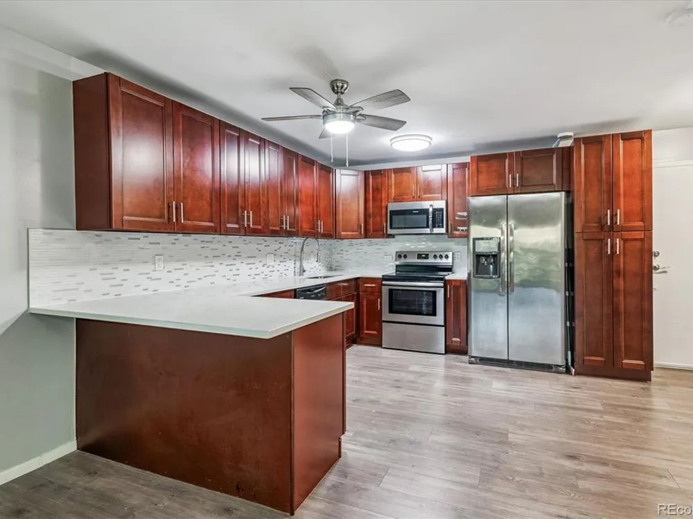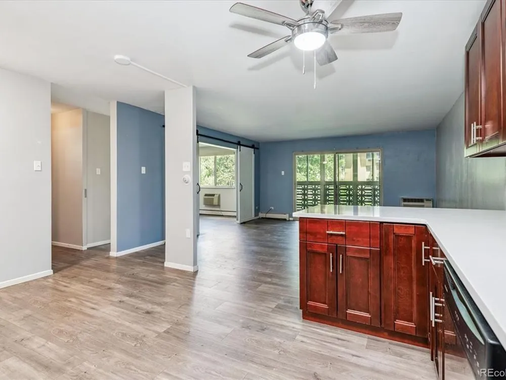 Beautifully Updated Condo in Windsor Gardens—Move-In Ready! Welcome to 595 S Alton Way #7B, a tastefully updated condo in the heart of Denver’s premier 55+ community—Windsor Gardens. This inviting home offers a perfect blend of comfort, style, and convenience, all within one of the city's most desirable active adult neighborhoods. Step inside and immediately notice the rich CoreTec Pro Plus luxury vinyl plank flooring that runs throughout the living areas, providing a sleek and durable foundation. The kitchen is a showstopper—featuring warm cherry cabinets, quartz countertops, a travertine tile backsplash, stainless steel appliances, and a bar-height counter perfect for casual meals or entertaining. Both bathrooms have been thoughtfully remodeled with modern quartz vanities, tiled floors, and stunning shower surrounds—subway tile in the main bath and river rock tile in the primary ensuite. A custom barn door adds style and function between the living area and second bedroom, while the primary suite features a spacious California Closet walk-in and brand-new plush carpet for added comfort. Additional perks include: Garage space #28 in Lot-15, conveniently located right next to the building entrance Just steps from the laundry room Fresh finishes and thoughtful updates throughout Enjoy all the incredible amenities Windsor Gardens has to offer—indoor/outdoor pools, a fitness center, golf course, restaurant, walking trails, and a community center with countless clubs and activities. Don’t miss your chance to live in a community where lifestyle, location, and low-maintenance living all come together. Schedule your showing today—this one won't last!