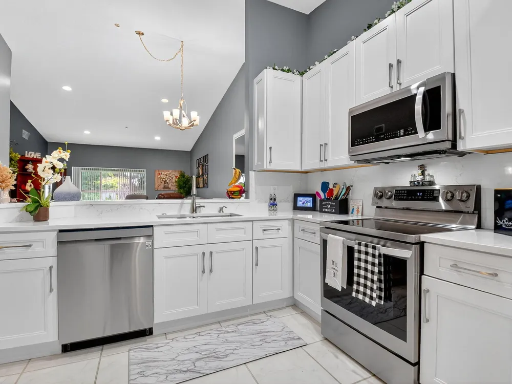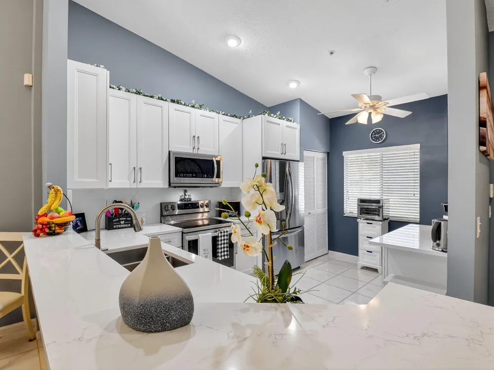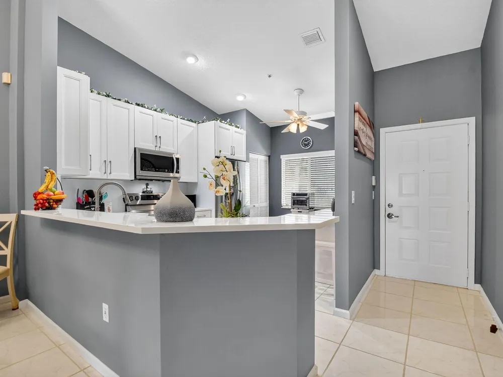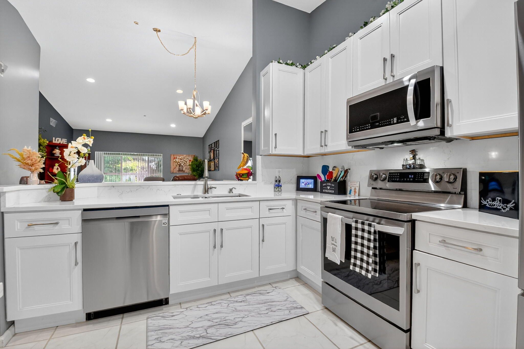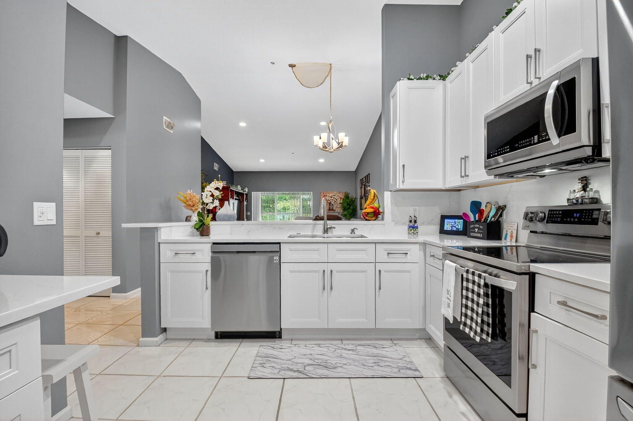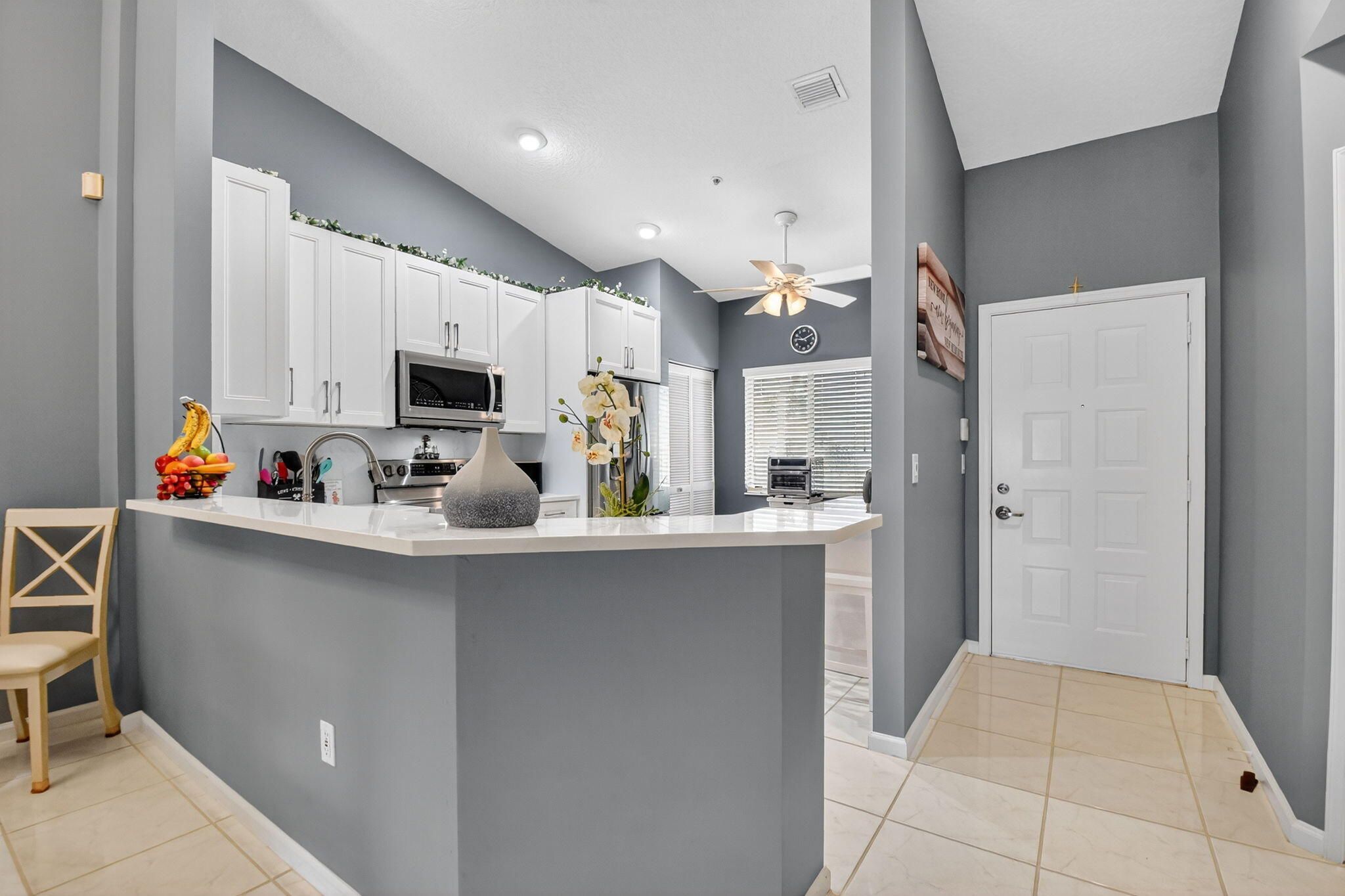 WOW! Step into Luxury and style with this beautifully updated 3BR/2BA corner unit offering 1,869 sq ft of beautiful and inviting living space. This top floor residence boasts vaulted ceilings and is Light and bright! Located in the highly desirable Coral Lakes community in Boynton Beach. This spacious unit features tile, an updated kitchen with white cabinetry, and a large living/dining area perfect for entertaining. The expansive primary suite offers tranquil views, a walk-in closet, and en-suite bath with dual vanities and walk-in shower. In-unit laundry, split floor plan, extra storage, and there's even an elevator for easy access! BRAND NEW ROOF!!!! Don't miss out on this one!