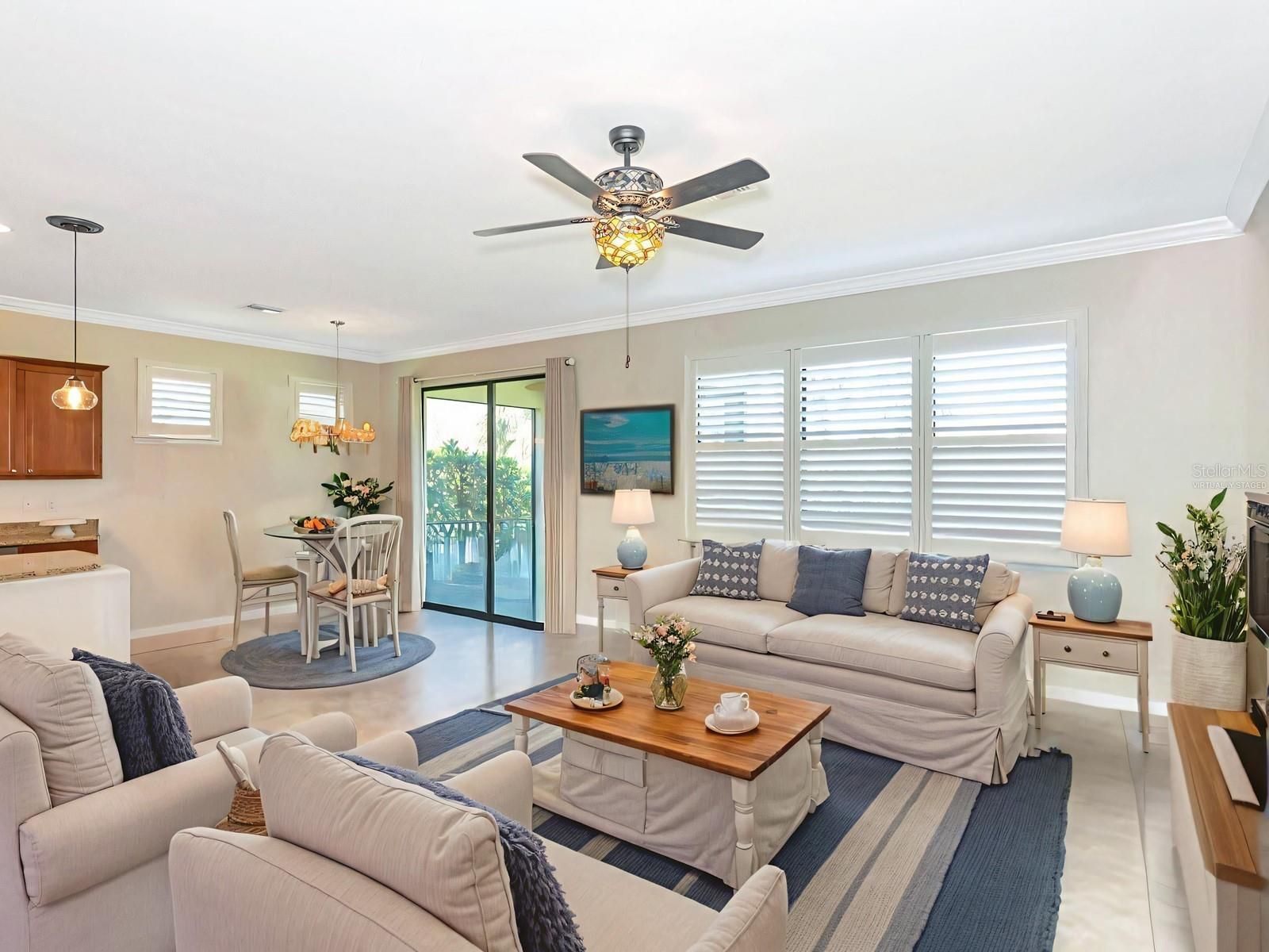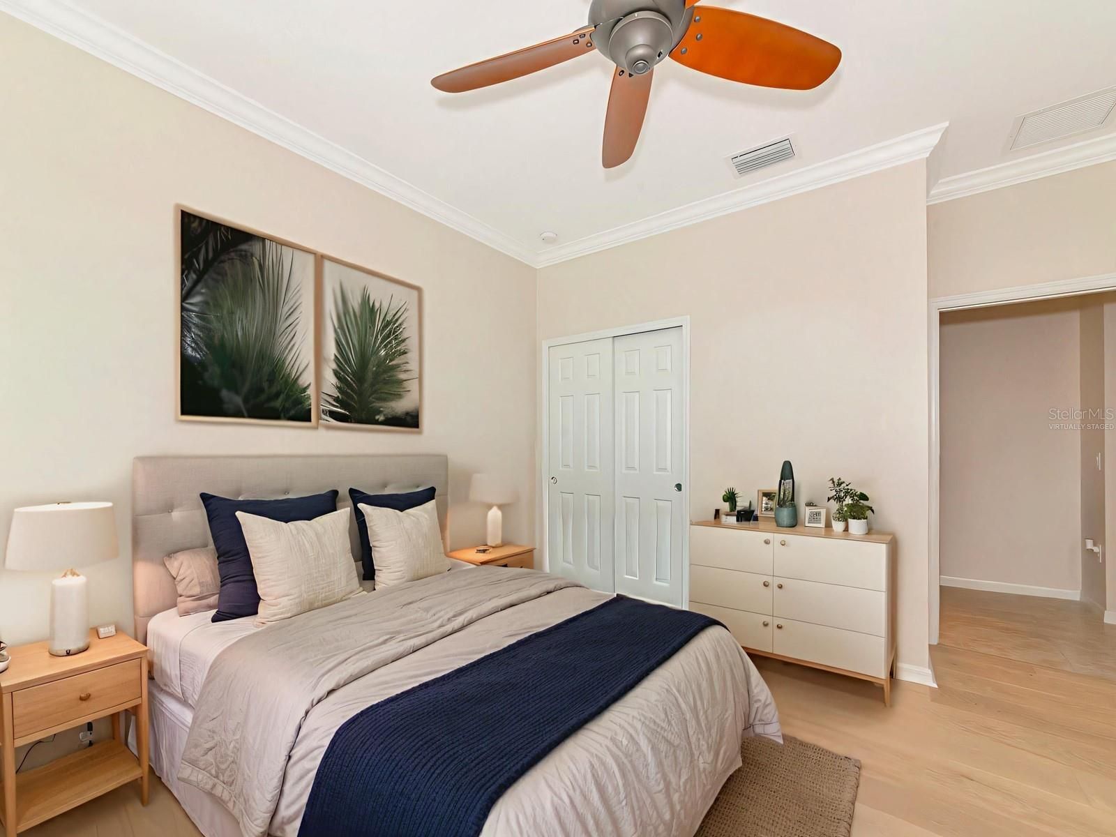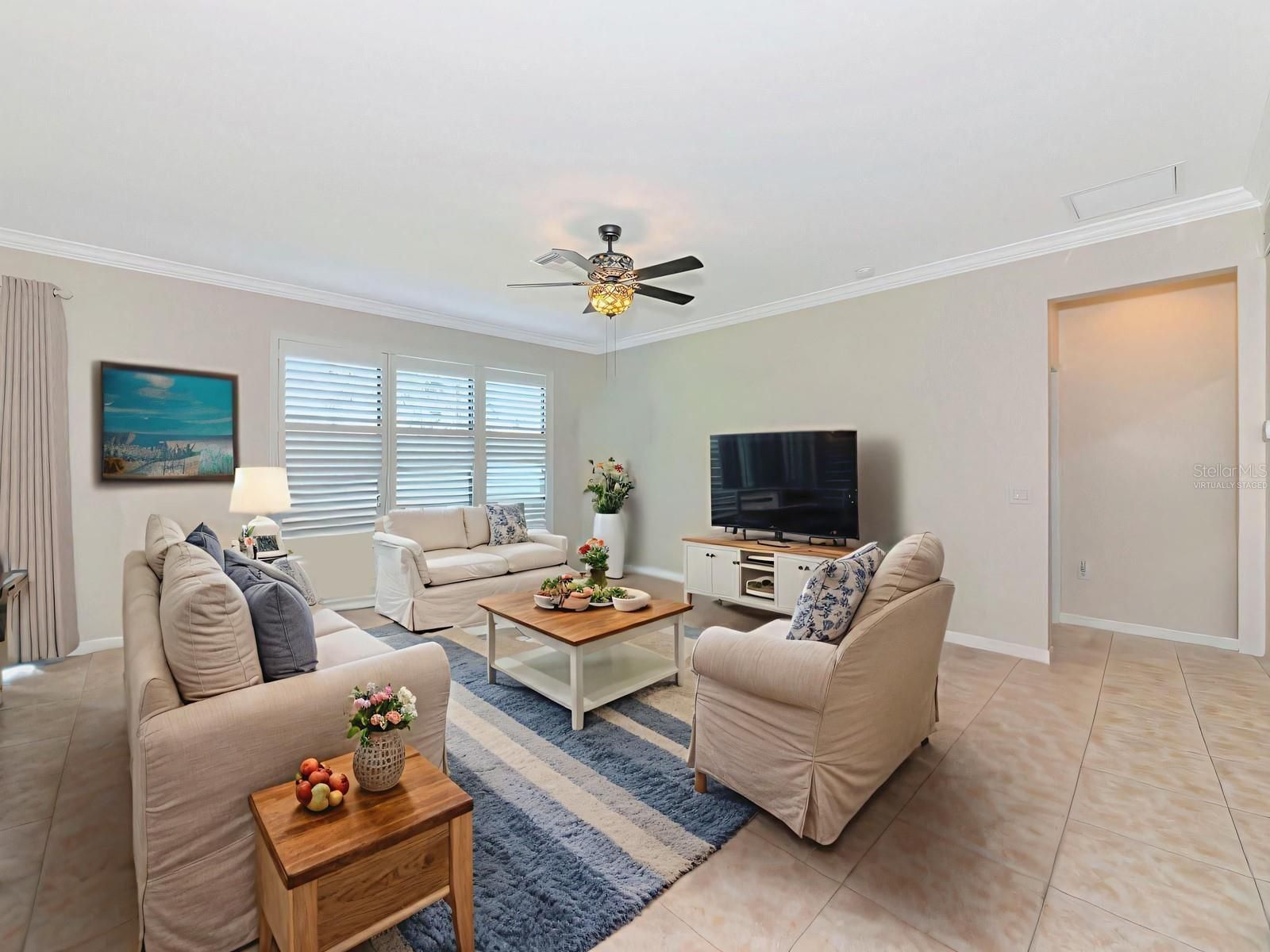 One or more photo(s) has been virtually staged. Experience ultimate comfort and convenience with this maintenance-free single-family home in a gated community. Built in 2016, it features the sought-after Pulte-Divosta Abbeyville FLEX floor plan with 2-3 bedrooms and 2 baths. Upgraded with a custom Crystalline front door, the foyer showcases hardwood flooring that flows seamlessly into the flex room, as well as the front bedroom and primary suite. Crown molding and plantation shutters are striking and enhance the elegance of nearly every room in the home. As you step through the arched entryway, you're welcomed into the great room, where tiled flooring adds a touch of sophistication to the space. At the heart of the open kitchen is a granite center island that not only offers ample storage but invites a gathering with bar seating. The essential appliances, along with a high-efficiency natural gas range, are included. This space also has wood cabinetry, a spacious built-in pantry, and stylish pendant lighting, all designed to elevate your culinary experience. Combined with the living and dining rooms featuring sliding glass doors that lead to a covered, and screened lanai with paver bricks. The primary suite serves as a private retreat located at the back of the home. It has a personal bathroom equipped with granite countertops, dual sinks, high-quality cabinetry, a water closet, and a walk-in shower adorned with tile and a glass door. The laundry room is conveniently located nearby and includes a walk-in storage area. Additional storage is available in the drop-zone ready entry from the two-car garage. Lovely curb appeal starts with a tile roof, a brick paver driveway, and a lush, maintenance-free lawn and landscape that invites you in. Discover Sandhill Preserve, where a stunning resort-style amenity center awaits you, complete with inviting sidewalks that wind through the beautifully designed grounds. Residents can enjoy a welcoming clubhouse, a fitness center, community spaces, ample patio seating, a firepit, barbecue areas, a spacious cabana, as well as a swimming pool and spa. The community also includes tennis courts and a central postal box. This is a gated community in Palmer Ranch with no CDD fees. Situated within an A-rated school district, in one of the best locations in Sarasota, with easy access to the Legacy Trail, top-notch golf courses, I-75, and a wide variety of shopping and dining choices. Plus, the gorgeous white sandy beaches of Siesta Key are just minutes away!