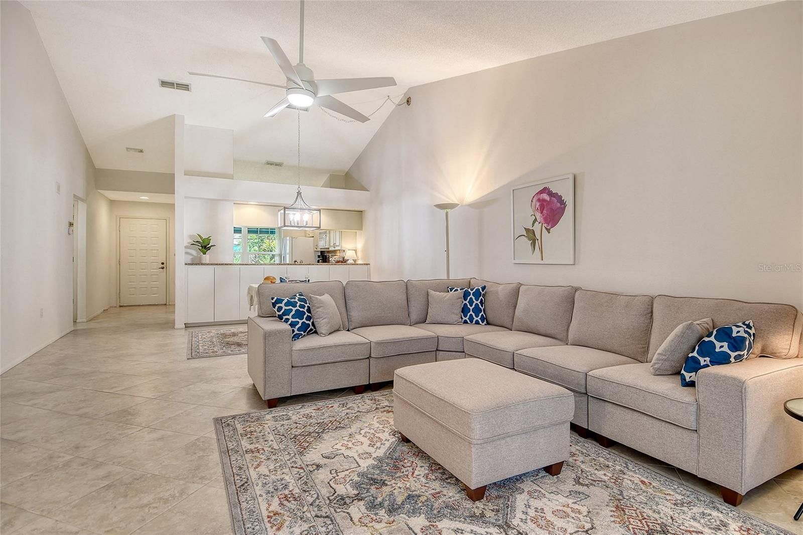 This 2-bedroom/2-bath villa lives like a single-family home with its oversized garage. The great room floor plan with vaulted ceilings is light and bright. New dining area light fixture, ceiling fan, new sectional sofa, rugs and flat screen TV have been added for the buyer. The kitchen has an eat-in space, granite counters, pantry closet and loads of storage with a breakfast bar open to the great room. The primary bedroom with walk-in closet and ensuite bath is located in the rear and the guest bedroom and bath are located in the front of the villa for maximum privacy. Both bedrooms have elegant luxury vinyl flooring. The updated primary bath has dual sinks and a glass enclosed shower. The year-round air-conditioned Florida room can be used for a den, office or 3rd bedroom. Impact glass windows were installed in the primary bedroom and kitchen for peace-of-mind. The garage has room for a car and a golf cart and has a new hot water heater and plenty of storage. The newly renovated community pool with spa is just a few steps away. Clubside is conveniently located close to UTC Mall with its shopping and restaurants and downtown Sarasota with its cultural venues. This small community features low monthly maintenance fees that include cable TV/internet, lawn maintenance, reserves for roof and exterior paint, trash and insurance. Benderson Park is nearby, and beaches are about 8 miles West. Enjoy the Florida lifestyle with an optional golf, tennis or social membership at Palm-Aire Country Club.
