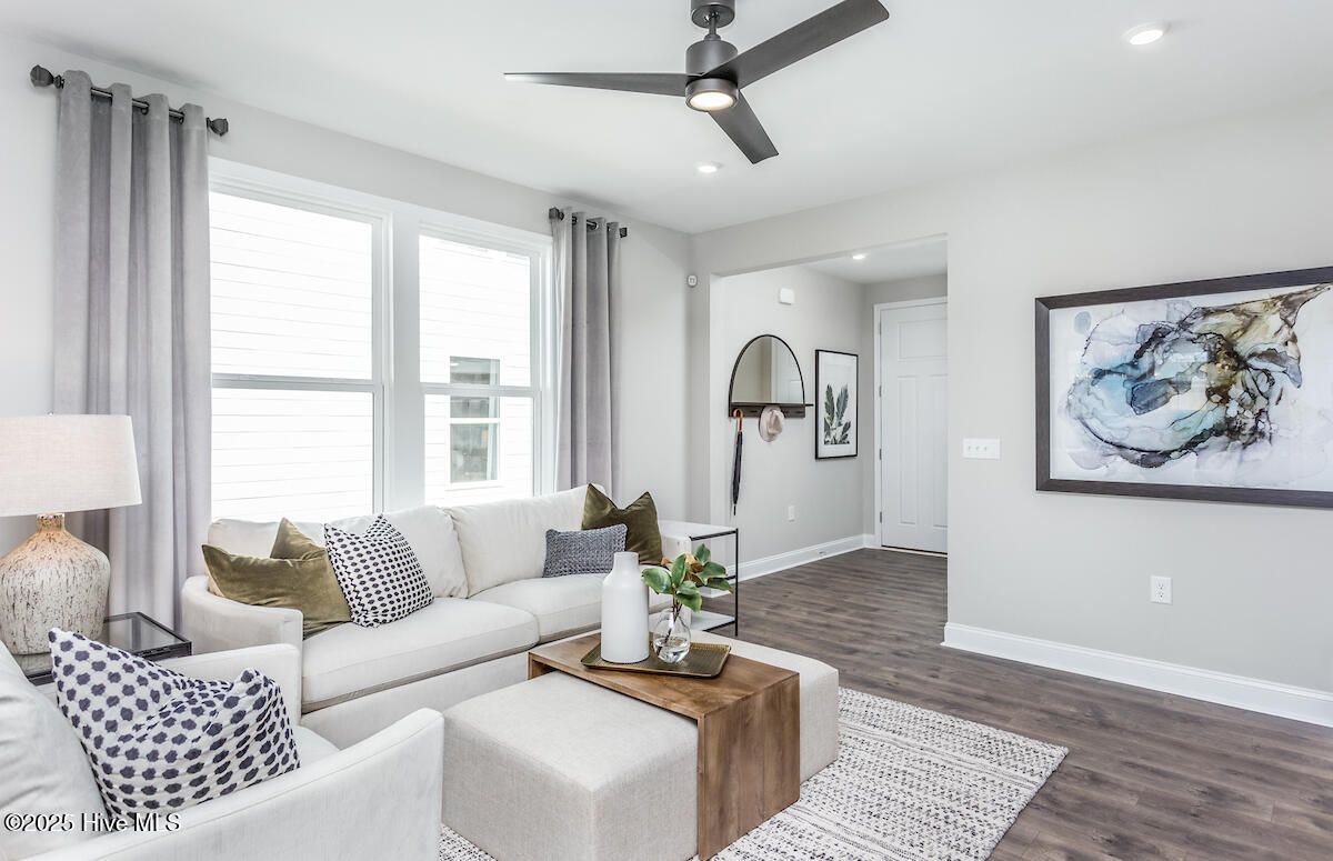 Discover refined coastal living at The Haven at Riverlights, where contemporary design and seaside charm come together! This thoughtfully designed Compass floor plan offers 1,403 square feet of inviting space, featuring two bedrooms, two full baths, and a flexible bonus room enclosed with elegant glass doors. Whether you need a private home office, creative studio, or guest retreat, this adaptable space is ready to fit your lifestyle. The heart of the home is a beautifully appointed kitchen that makes both everyday living and entertaining a pleasure. Upgraded quartz countertops pair perfectly with crisp white cabinetry, a classic white tile backsplash, warm bronze hardware, and stylish pendant lighting. A generous island provides ample room for meal preparation and casual gatherings, while the open layout keeps you connected to the main living area. From here, sliding glass doors lead to a screened covered patio and extended outdoor living space, creating a seamless indoor to outdoor flow that is ideal for relaxing evenings or hosting friends. The owner's suite offers a serene retreat, highlighted by a tray ceiling that adds architectural interest and dimension. The en suite bath features a dual sink vanity with quartz countertops, white cabinetry, and a beautifully tiled shower designed for comfort and style. At the front of the home, the secondary bedroom and full bath with a tiled tub surround provide privacy and convenience for guests or family members. Additional enhancements elevate both comfort and functionality, including upgraded flooring throughout, an extended two car garage, a utility sink, and pull-down attic stairs for extra storage. Smart Home technology adds modern convenience with a programmable thermostat and video doorbell, giving you greater control and peace of mind. Just eight miles from Carolina Beach, The Haven offers an exceptional coastal lifestyle. Visit today and discover the home you've been dreaming of!