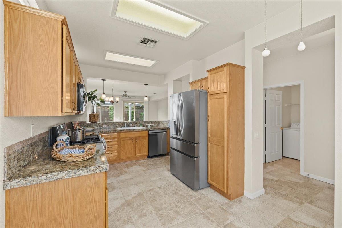 This inviting home in the heart of Sun City awaits its new owner, a home that is move in ready. The kitchen is a culinary dream, featuring classic cabinets that offer both style and functionality, a kitchen peninsula perfect for casual dining or meal preparation, and stone countertops that exude elegance and durability. All new kitchen appliances. New HVAC, water heater and garage opener. The bedroom is a private retreat, complete with an ensuite bathroom, offering convenience and comfort. The bathroom itself features a walk-in shower, designed for a spa-like experience within the comfort of your own home. Outside, the property offers an enchanting patio, ideal for entertaining or simply enjoying the California sunshine, along with an extended patio that provides a shaded oasis for relaxation. The fenced backyard creates a secure and private space for outdoor activities, while the concrete tiled roof adds a touch of timeless charm. Additional features include a laundry room, providing convenience for household tasks, and a walk-in closet, offering ample storage space for your wardrobe. This is a residence where comfort meets style, creating a place you'll be proud to call home. Based on year built, this home does not have Kitec plumbing. Don't miss the linked video tour!