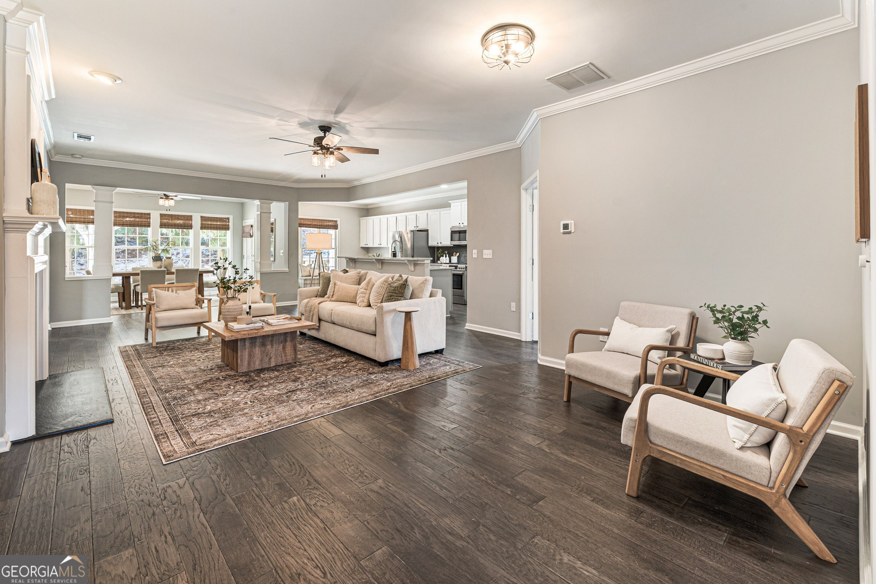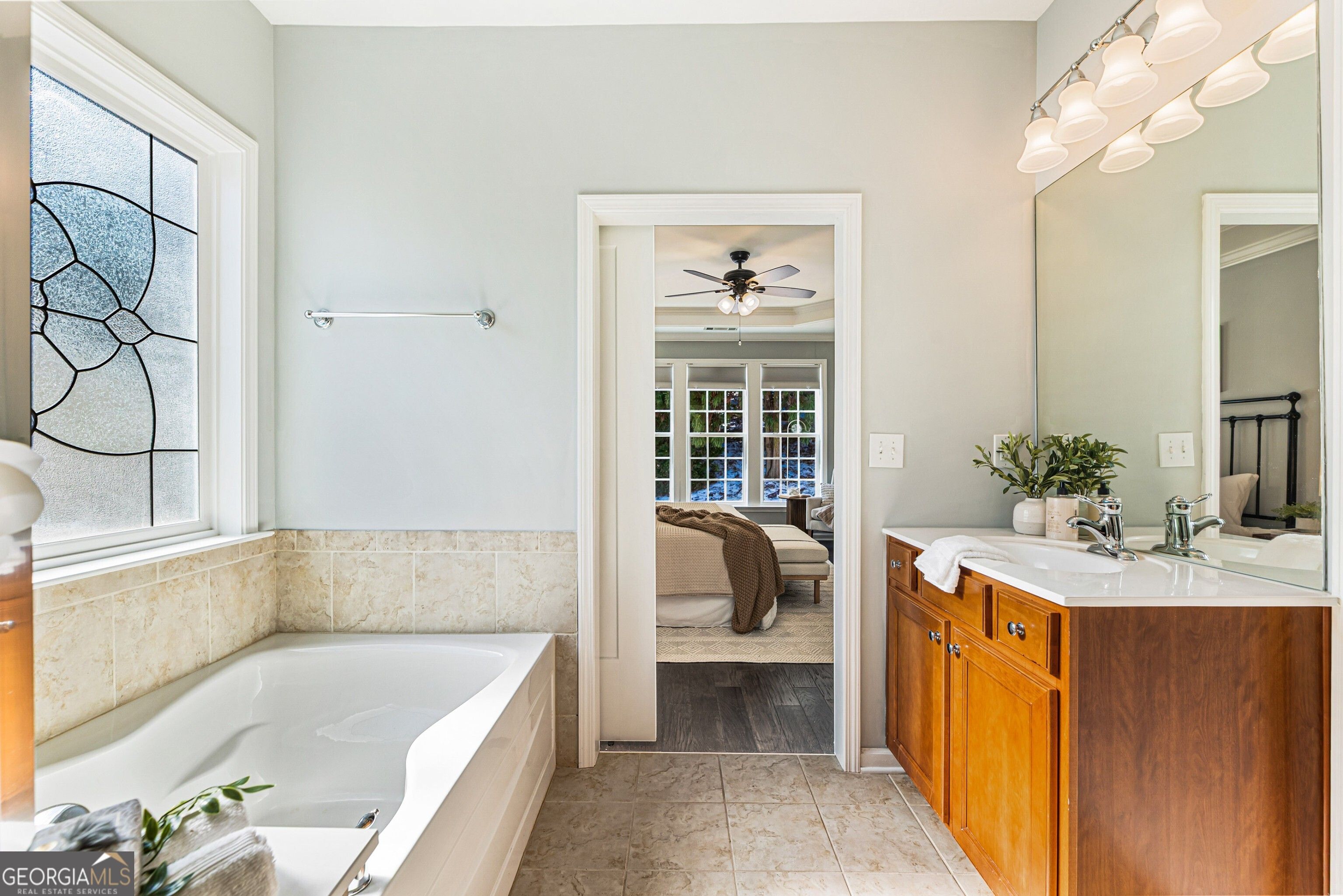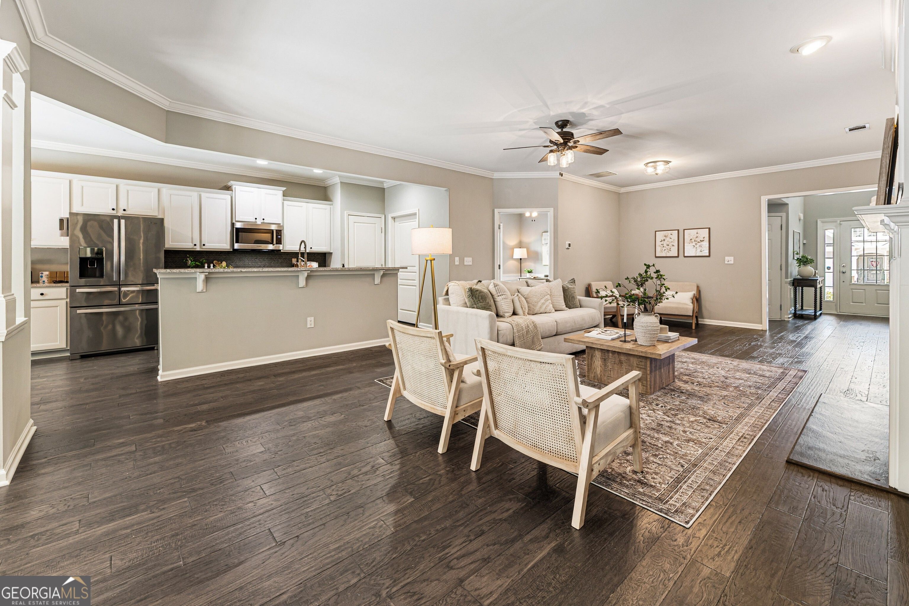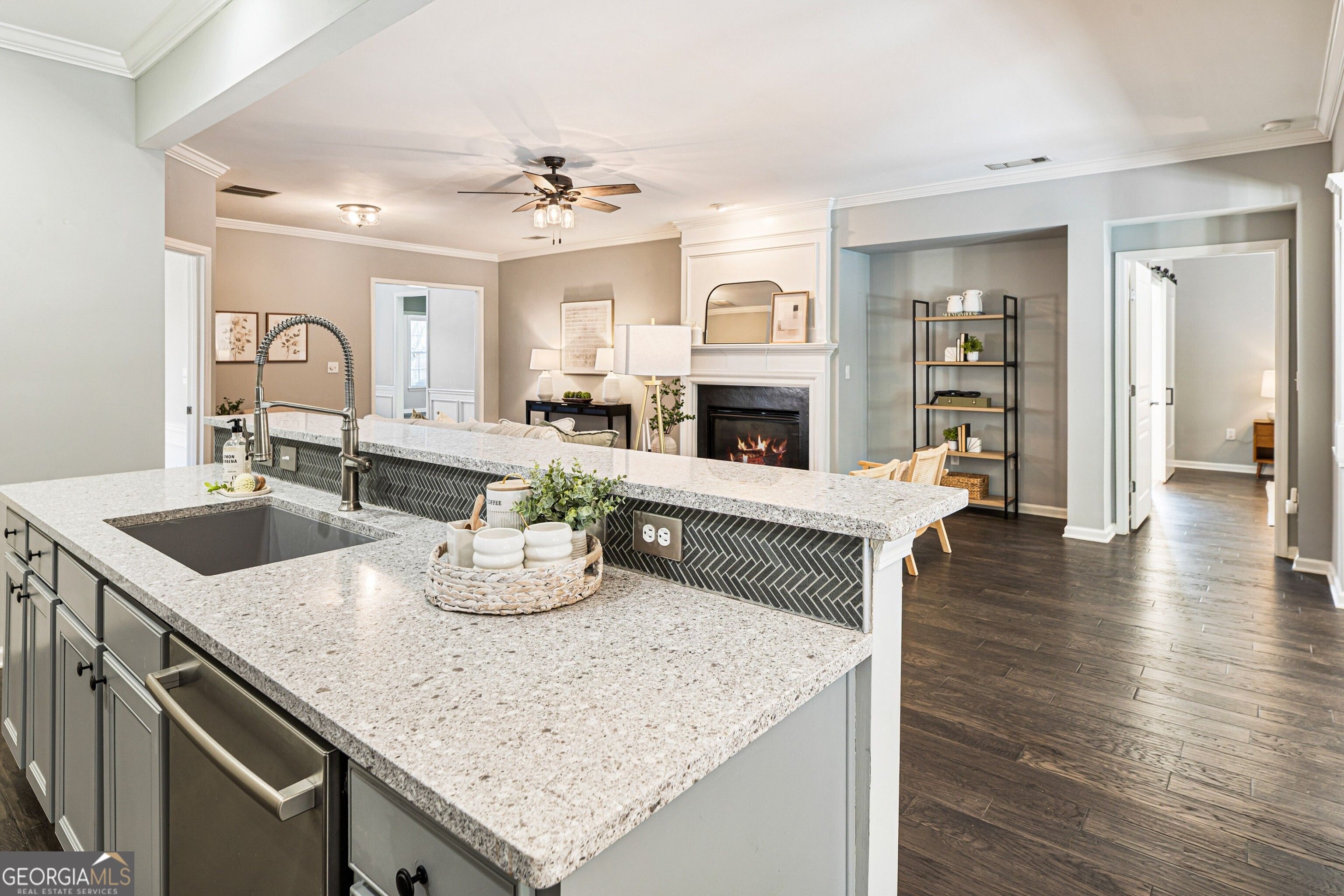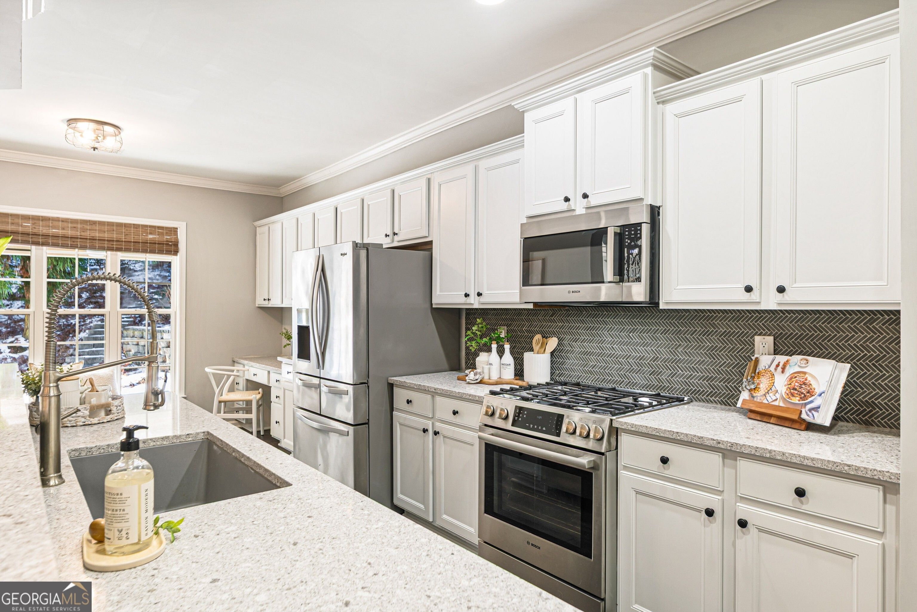 There's something immediately comforting about 5960 Chimney Rock Dr a home that feels thoughtfully cared for and ready to be enjoyed from the moment you arrive. Located within the sought-after Village at Deaton Creek, this beautifully updated ranch home offers an easy, relaxed way of living in one of North Georgia's most established 55+ communities. The Vernon Hill floor plan is designed with everyday comfort in mind, offering three bedrooms, two full baths, a dedicated office, and a dining room that invites you to linger over meals and meaningful conversations. The entrance foyer warmly welcomes guests and opens to the living room, which is centered around a fireplace, making the space feel like home year-round perfect for quiet evenings or casual gatherings with friends. The heart of the home is the kitchen, thoughtfully renovated in 2022 to be both timeless and functional. White cabinetry, quartz countertops, a classic herringbone backsplash, a farmhouse sink, and Bosch stainless steel appliances create a space that feels fresh, bright, and easy to enjoy. A breakfast bar opens to the living area, making everyday meals simple and entertaining effortless. Just off the main living space, the dining room offers a gracious setting for hosting while enjoying views of the backyard an ideal backdrop for dinner parties, holidays, or relaxed Sunday meals. Step outside to the rear patio, where mornings begin with coffee and evenings wind down in a peaceful outdoor setting that extends the living space beyond the walls of the home. Privately positioned with peaceful views of the backyard, the primary suite offers a quiet retreat. The bathroom features dual vanities, a separate tub and zero entry shower, and a generous walk-in closet. Two additional bedrooms offer comfortable accommodations for guests or hobbies, while the dedicated office provides flexibility for organization, creativity, or quiet moments of focus. The home has been carefully updated with new flooring and a new roof in 2022, along with a new HVAC system in 2024 that includes an upgraded air purification system, adding comfort and peace of mind. Life at Village at Deaton Creek is about more than just a beautiful home it's about staying connected, active, and engaged. Residents enjoy access to an expansive clubhouse filled with spaces designed for both activity and relaxation, including indoor and outdoor pools, tennis and pickleball courts, a softball field, fitness and dance studios, a ballroom, card and game rooms, and welcoming social areas. With a full calendar of clubs and activities each month, it's easy to find opportunities to stay social, explore new interests, and enjoy each day at your own pace. Golf-cart friendly and pet friendly, the community is professionally managed with on-site staff and a staffed guard-gated entrance, offering both convenience and peace of mind. Whether you're drawn to the lifestyle, the community, or the comfort of one-level living, 5960 Chimney Rock offers a place where you can truly settle in and enjoy what's next.