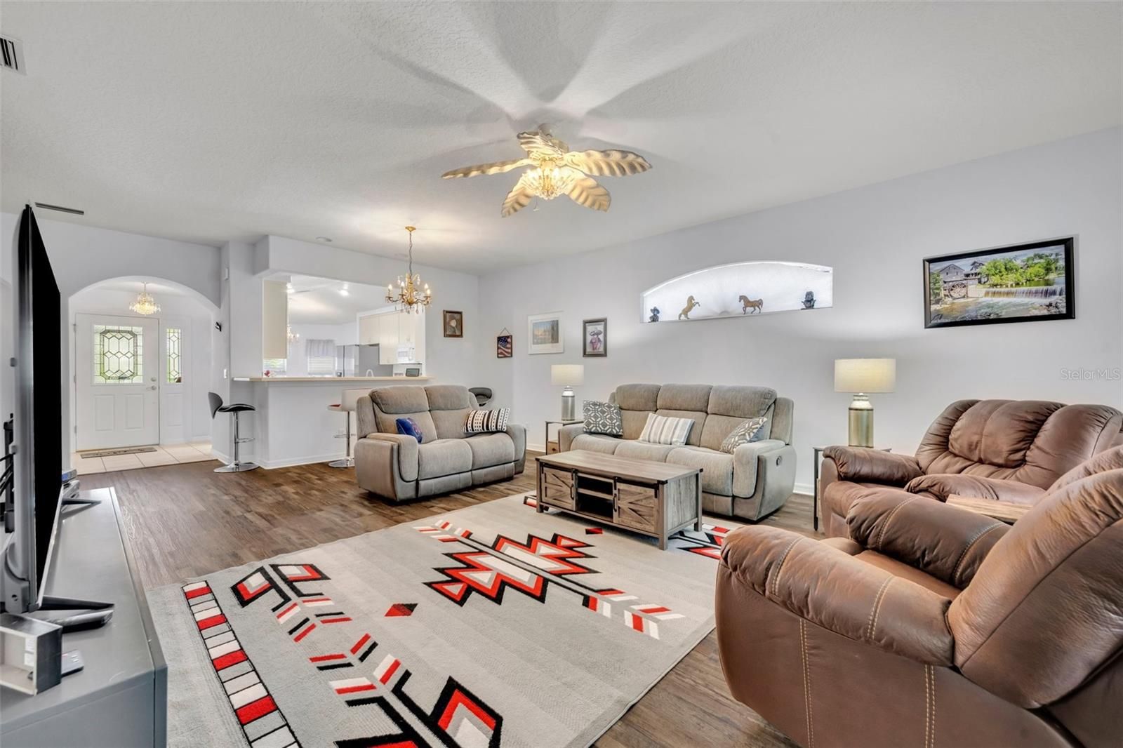 - Ceiling Fan(s), Eat-in Kitchen, High Ceilings, Living/Dining Room, Open Floorplan, Split Bedrooms, Thermostat, Walk-In Closet(s)