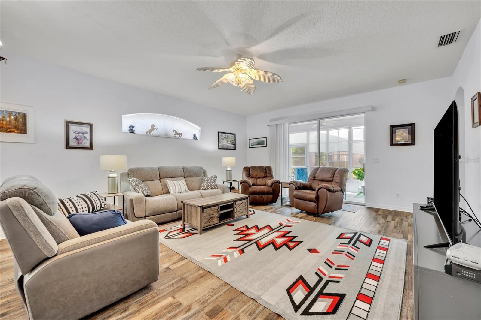Spacious, Move-In Ready Home with Modern Updates in the Resort-Style 55+ Community of Royal Harbor in beautiful Tavares, Florida! This 2-bedroom, 2.5-bath home offers over 2,000 square feet of living space, featuring luxury vinyl and tile flooring throughout. The home features a 2024 ROOF, a WHOLE-HOUSE GENERATOR, and a HOME WARRANTY valid through April 2026 for added piece of mind. The kitchen includes a cozy eat-in nook, perfect for casual meals or morning coffee. The large second-floor bonus room complete with a half bath, beverage fridge, and sink that offers flexible space for a home office, media room, hobby area, or guest accommodations. The primary suite includes an oversized walk-in closet, ideal for storage and organization. A spacious laundry room adds convenience and functionality to everyday living. Enjoy outdoor living on the screened-in lanai with no direct view of neighboring lanais, providing added privacy and a peaceful setting. Royal Harbor offers a wide range of amenities, including a junior Olympic-sized heated pool, fitness center, library, and a clubhouse with scheduled activities such as billiards, crafts, and card games. Residents also enjoy access to the Harris Chain of Lakes via a private community dock, along with boat and RV storage. Additional amenities include tennis, pickleball, bocce, and shuffleboard courts, as well as walking trails throughout the neighborhood. Schedule your showing today!