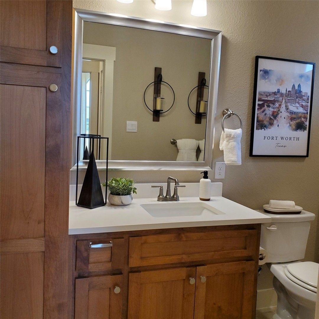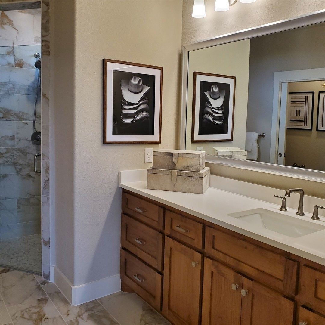 MLS# 21116088 - Built by Ladera Living - Ready Now! ~ Luxury awaits in this stunning Builder’s Model Home in Fort Worth’s premier 55+ gated community! Offered fully furnished—including appliances, furniture & décor—this home provides a true turn-key living experience. The Torino plan features an open layout with upgraded laminate flooring, quartz countertops, oversized island with breakfast bar, 5-burner gas cooktop, under-cabinet lighting, pantry & mudroom. Light-filled living area with stained ceiling beams, gas log fireplace & access to large covered patio. Private owner’s suite with dual vanities, walk-in shower, large walk-in closet & utility room with built-ins. Guest suite & home office located separately for privacy. HOA maintains front & back yards for easy lock-and-leave lifestyle. Enjoy resort-style amenities: clubhouse, fitness center, pickleball, pool, putting greens, grilling area, fire pit, dog park & walking trails. Excellent investment—builder requires lease-back under great terms!