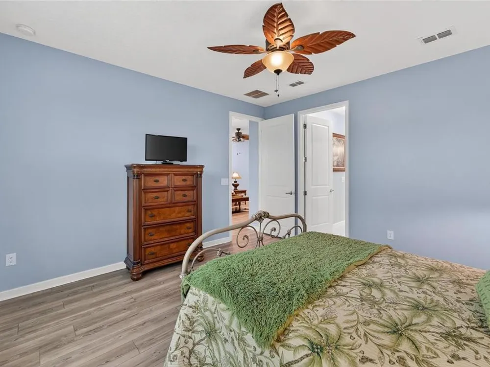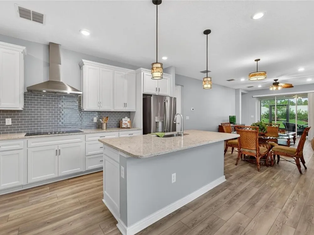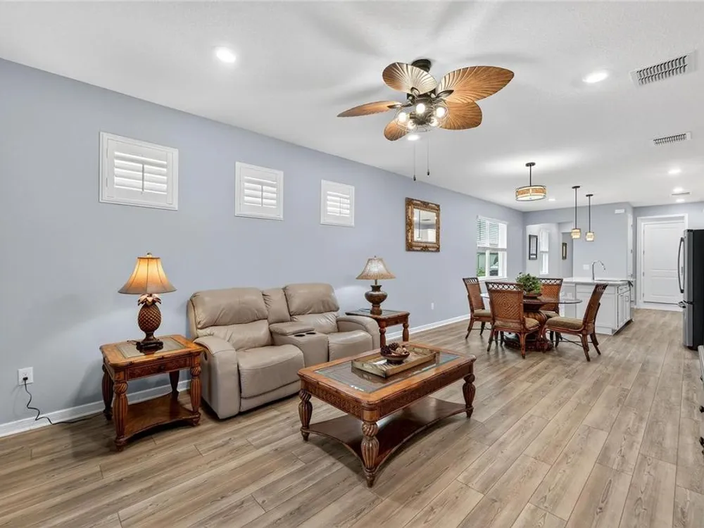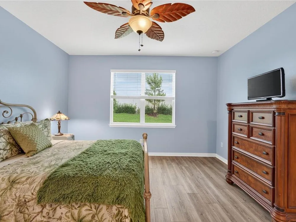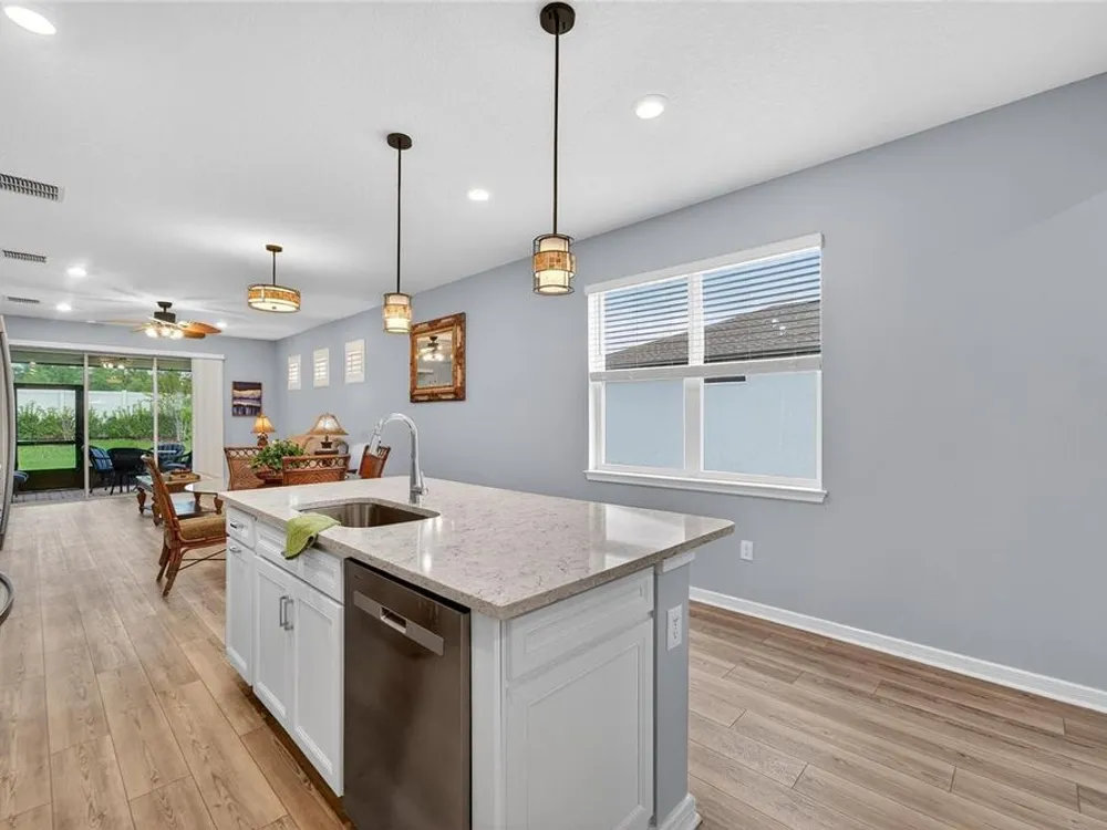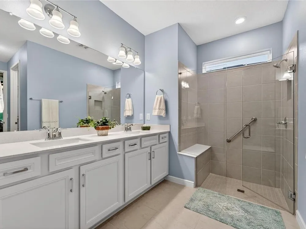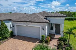 Welcome to your new home in the secluded gated 55+ community of Del Webb Bexley! Discover the beauty and tranquility of this Modern 3 bedroom 1600+ SF home. Curb appeal is evident with the paver driveway and walkway, stone façade, custom landscaping and covered entranceway. This “Hallmark” model is adorned with LVP Wood Plank Flooring, an open concept including the kitchen, dining area and family room. The GOURMET Kitchen features 42” shaker style soft close cabinets and drawers. Additionally, all lower cabinets have rollout trays in the kitchen, laundry room and bathrooms. Countertops are white QUARTZ with a gray glossy tile backsplash. Pendant lighting illuminates the breakfast island with a coordinating light for the dining table. Kitchen appliances are Stainless Steel and include a GE “Profile” refrigerator, built in oven and microwave, dishwasher, hood vent and electric cooktop. A spacious pantry provides space to accommodate all of your supplies. A screened outdoor lanai, which is stubbed for a gas grill hookup, is the perfect place to relax and enjoy the serenity of nature. This property features an oversized distance between neighbors and ample space for gardening. The primary bedroom, located in the rear of the house, provides privacy, peace and quiet. The En-suite Bathroom features frameless shower enclosure with a custom niche, shower bench and grab bar for safety. Additionally, there is a QUARTZ Countertop with double square sinks, roll out drawers, a generous walk in closet and separate linen closet. Laundry time is a breeze with the included washer and dryer. There is a hanging rack for clothes and storage above for extra items. The painted two car garage features epoxy flooring, a whole house water filter, as well as a salt based water softener. Additional upgrades include 8 foot tall doors, five ceiling fans with LED lighting, window tinting on the east west windows, window blinds, a premium Flex room electrical/HDMI package, R-11 insulated interior walls and an over the air attic antenna. The low monthly HOA fee gives you access to the 19,000 sq. ft. clubhouse with a fitness center, bistro, ballroom, multi-purpose room, clubs and planned activities. Outdoor amenities include a zero entry heated pool, resistance pool, pickle ball courts, bocce ball, tennis courts, amphitheater, a community garden and a dog park. Del Webb Bexley is located just a short distance from shopping, restaurants, Premium Outlet Mall and Tampa’s International airport.