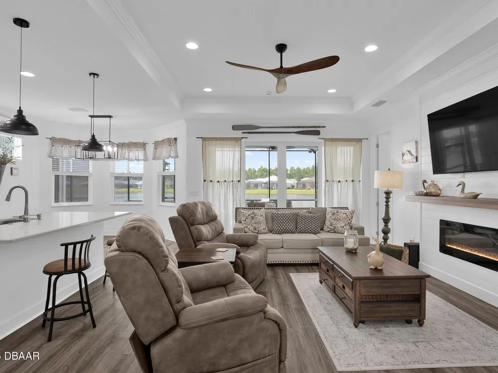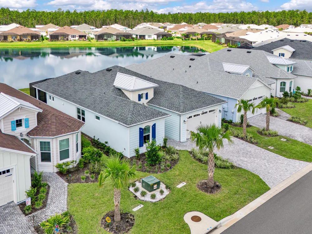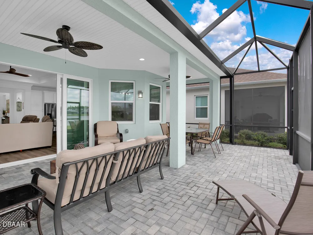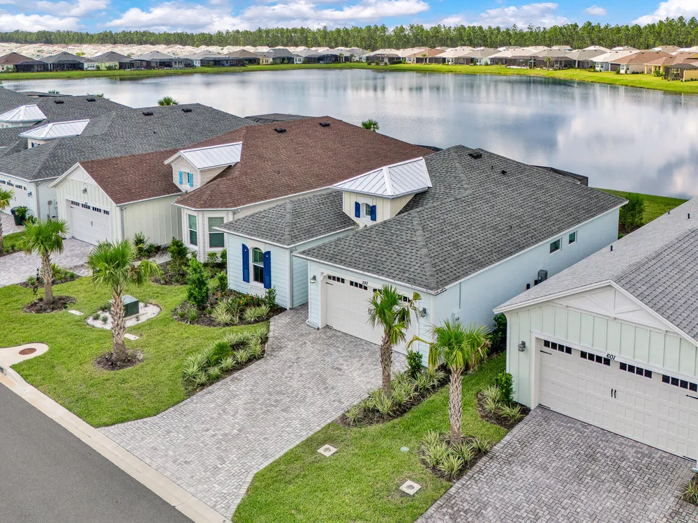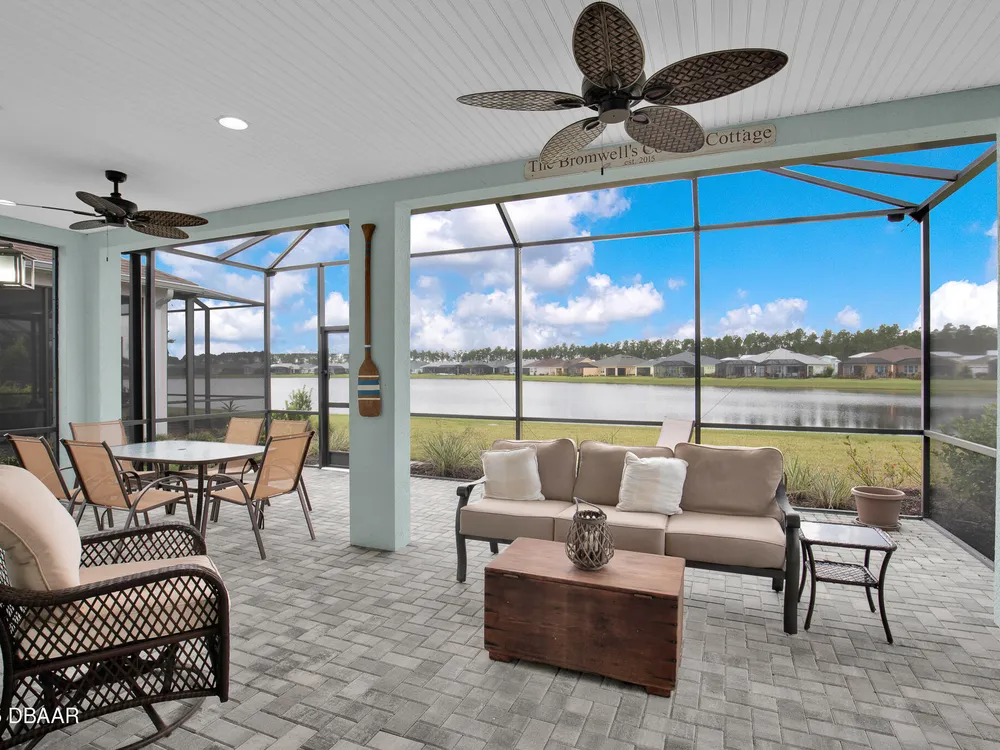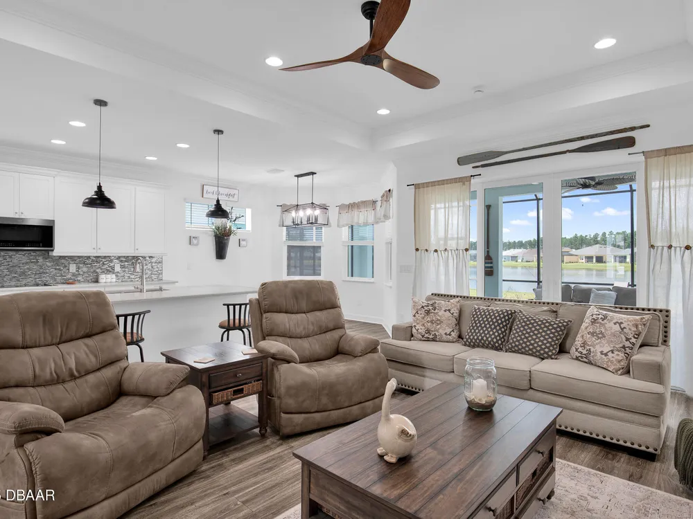 Spectacular Lakefront Coconut with extended screened lanai! Lots of upgrades to include crown molding throughout and a custom built shiplap fireplace wall with mantle in the Living Room! Neutral colors give this home a peaceful coastal vibe with laminate flooring in the main areas and tile in the bathrooms and laundry room. Kitchen boasts white 42'' upper cabinets with crown molding, tasteful backsplash and quartz countertops with pull-out shelving. Laundry Room has additional refrigerator and cabinets over washer and dryer. Master Suite cabinets have double drawer stacks for maximum organization and an oversized tile shower. All rooms are illuminated with recessed lighting. The doors are 8' tall and all windows are treated with blinds. Garage floor has epoxy coating and there are pull-down attic stairs. Enjoy the extensive amenities like the Beach Club in Ormond Beach w/ pool, full time restaurant/bar, expansive resort pool, fitness center, and more. Call today to see it all!