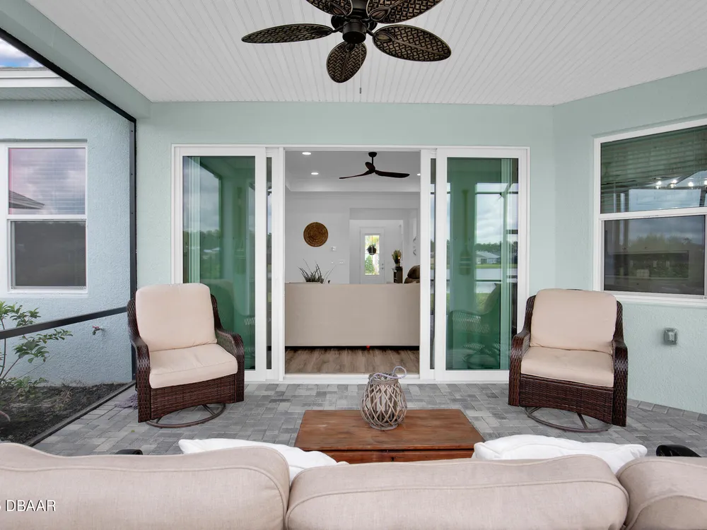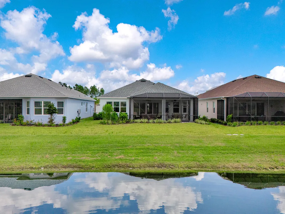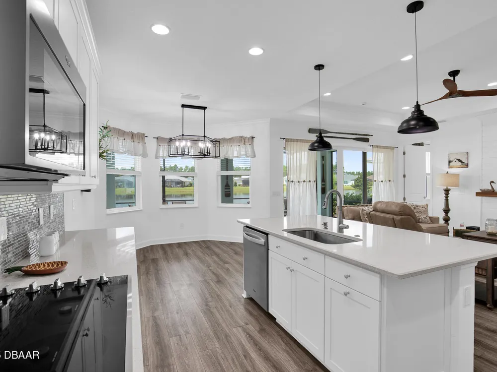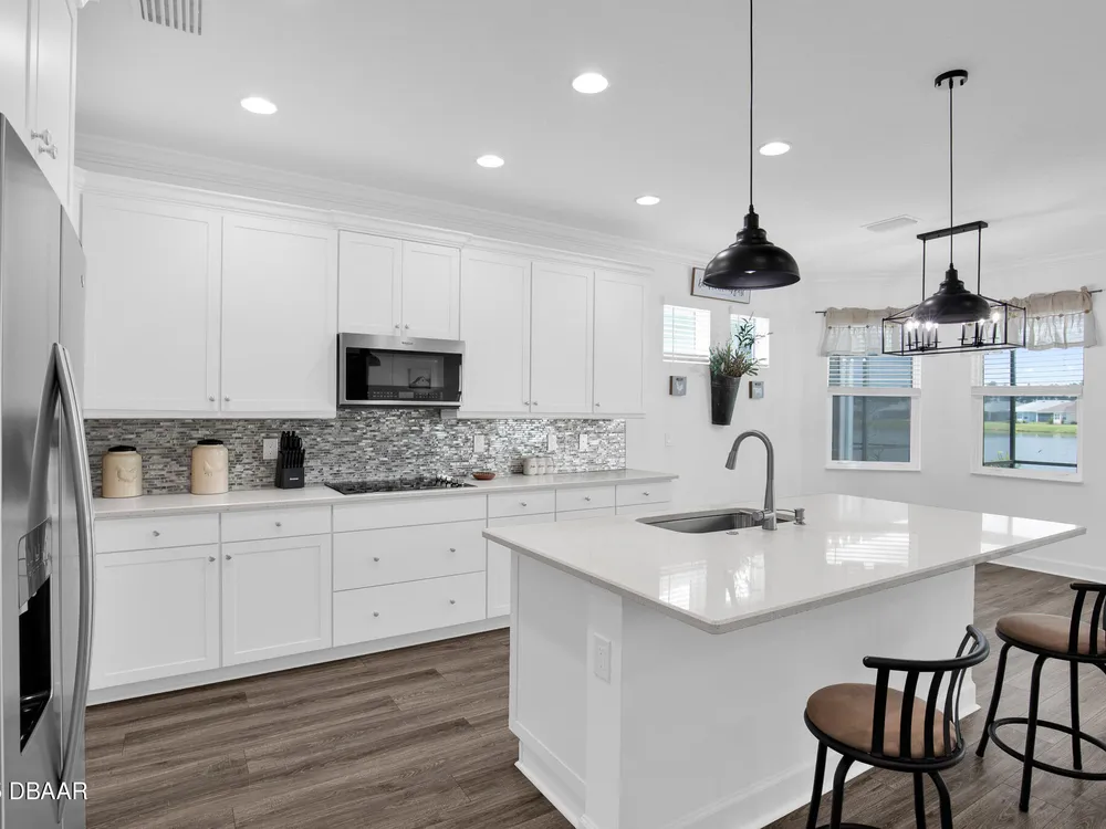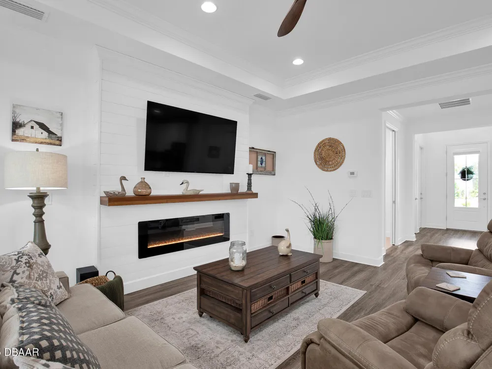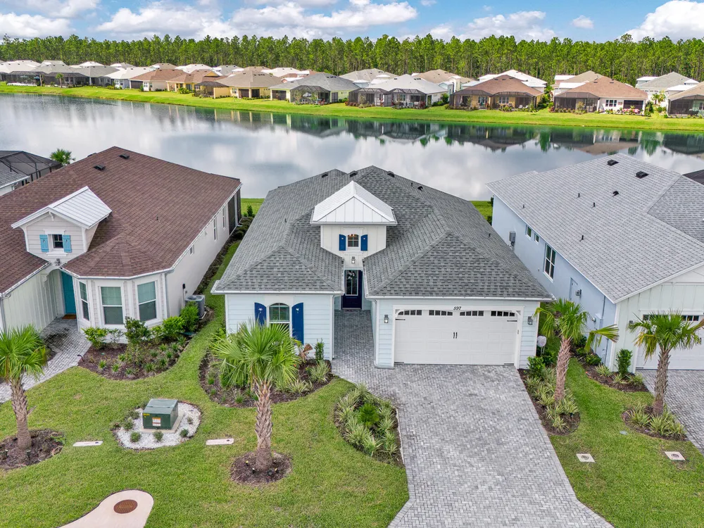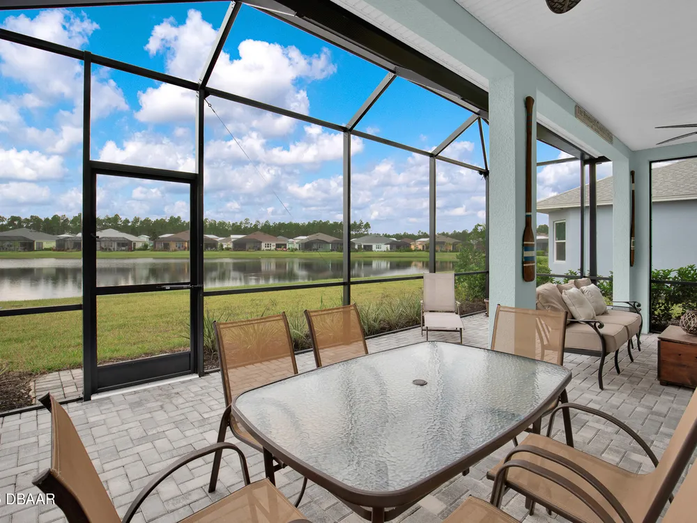 Spectacular Lakefront Coconut with extended screened lanai! Lots of upgrades to include crown molding throughout and a custom built shiplap fireplace wall with mantle in the Living Room! Neutral colors give this home a peaceful coastal vibe with laminate flooring in the main areas and tile in the bathrooms and laundry room. Kitchen boasts white 42'' upper cabinets with crown molding, tasteful backsplash and quartz countertops with pull-out shelving. Laundry Room has additional refrigerator and cabinets over washer and dryer. Master Suite cabinets have double drawer stacks for maximum organization and an oversized tile shower. All rooms are illuminated with recessed lighting. The doors are 8' tall and all windows are treated with blinds. Garage floor has epoxy coating and there are pull-down attic stairs. Enjoy the extensive amenities like the Beach Club in Ormond Beach w/ pool, full time restaurant/bar, expansive resort pool, fitness center, and more. Call today to see it all!