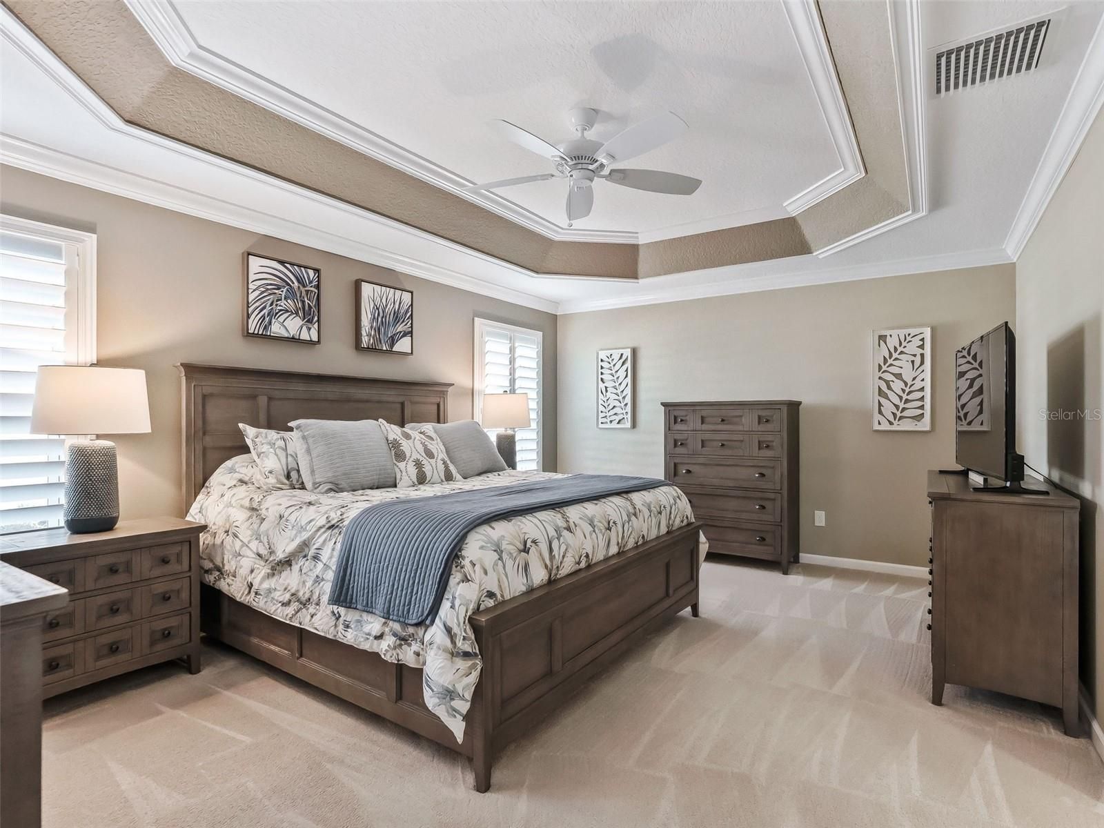 - Crown Molding, High Ceilings, Open Floorplan, Main Level Primary, Smart Home, Solid Surface Counters, Solid-Wood Cabinets, Thermostat, Tray Ceiling(s), Walk-In Closet(s), Window Treatments