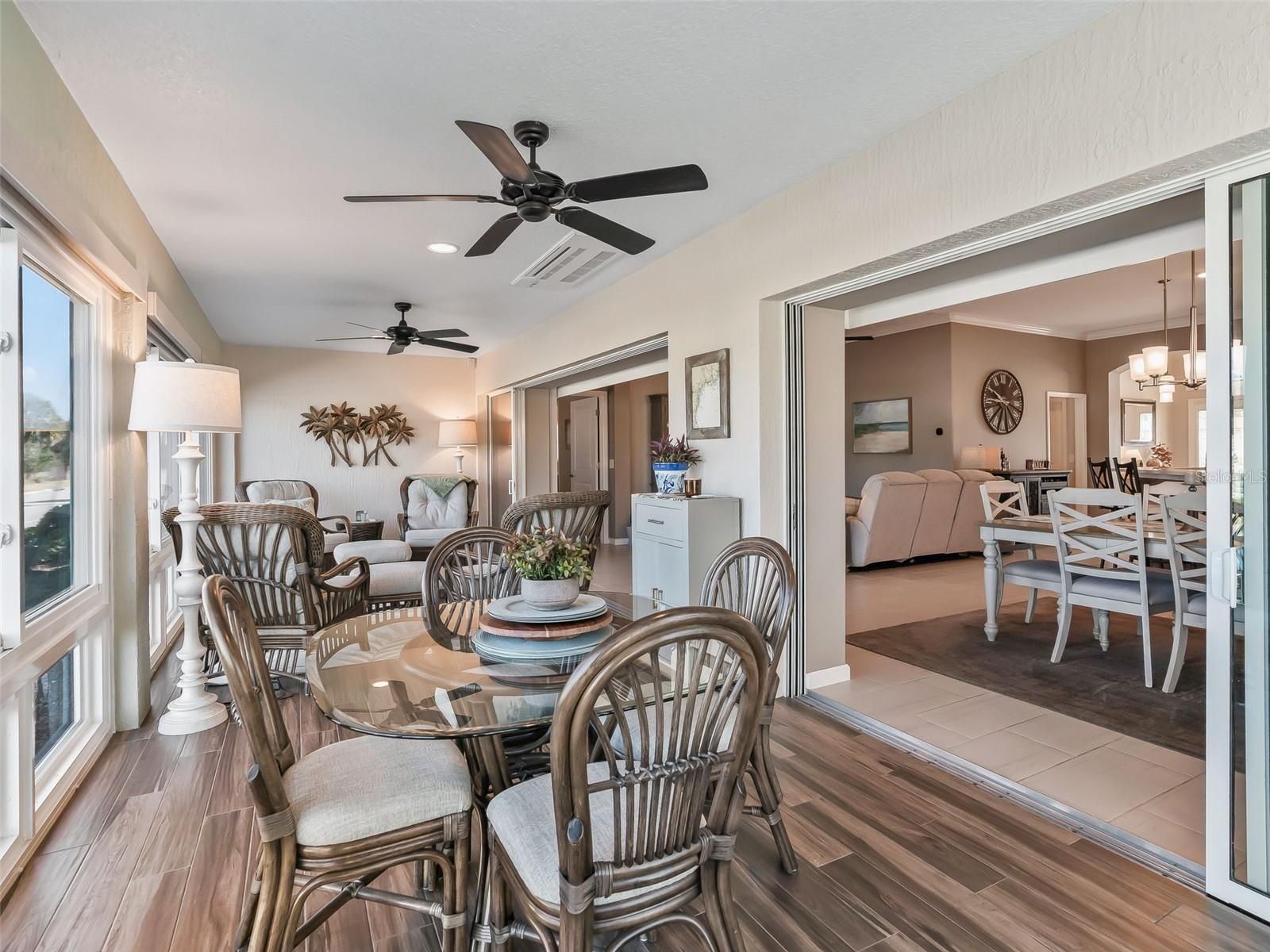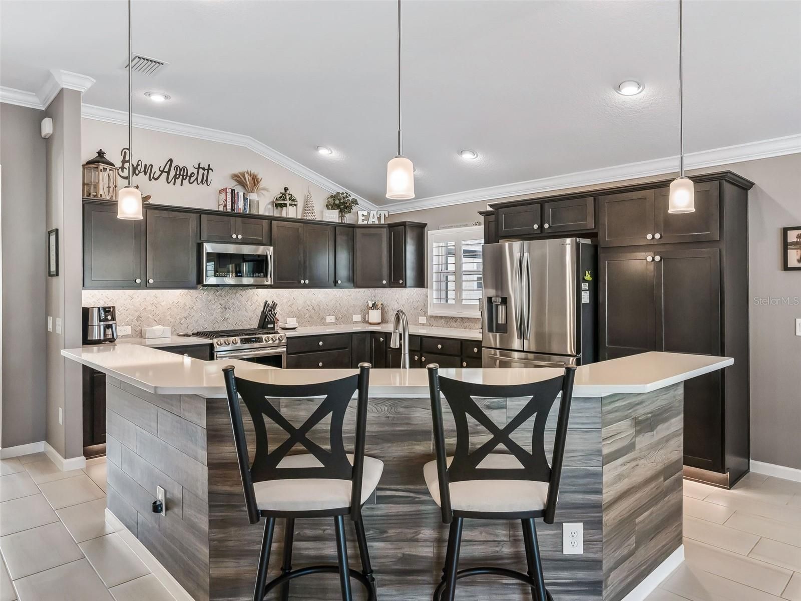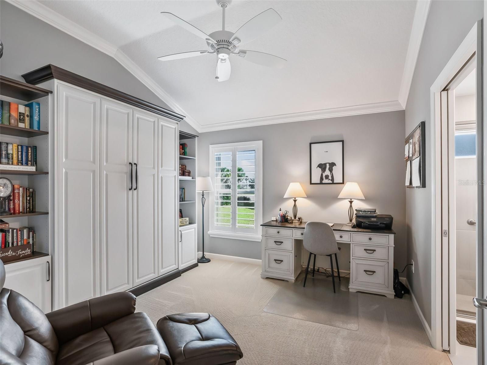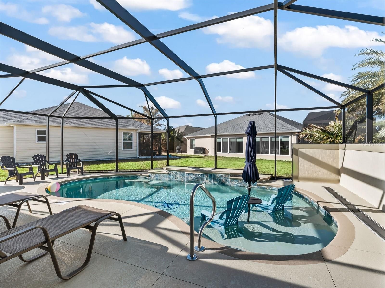 FABULOUS POOL HOME! - Stunning, meticulously maintained 3/3 MOSSY OAK. Comfort, style and location all come together effortlessly in this Designer Home located on a cul-de-sac lot. Great curb appeal, custom landscaping and a painted driveway welcome you home. This home offers many upgrades and high end finishes. As you enter the home you will notice the crown molding and plantation shutters that create a finished look throughout the living space. An open concept layout of the living, dining and kitchen flows seamlessly, creating an inviting space for entertainment and everyday living. The large kitchen is a dream featuring quartz countertops, stainless appliances and upgraded backsplash. Through the living space you will find stacked sliding doors that lead to a beautiful enclosed lanai featuring tile floors, a mini-split for year round living and remote control privacy blinds. Adjacent to the enclosed lanai is a heated, saltwater pool with a sundeck and a waterfall feature. The spacious Primary Suite offers cozy carpeting, a Tray Ceiling, a large walk in closet with a "California" type closet system, and an ensuite bathroom with double sinks and a Roman Shower. The second bedroom faces the front of the home and is a perfect, relaxing bedroom for guests and is adjacent to a second bathroom. The third bedroom has a walk in closet and an ensuite bathroom with a walk in shower. This bedroom also features a gorgeous murphy bed with bookshelves. The two car plus golf cart garage features an epoxy floor, built in cabinets for plenty of storage, a motorized garage screen and attic pool down stairs. This move-in ready home is nestled in the highly desirable Village of Monarch Grove, just minutes from Eastport, Sawgrass and Brownwood. Whether it's golf, recreation, shopping, live music or dining that you desire, it is all available within a short golf cart ride! Some furniture is negotiable.