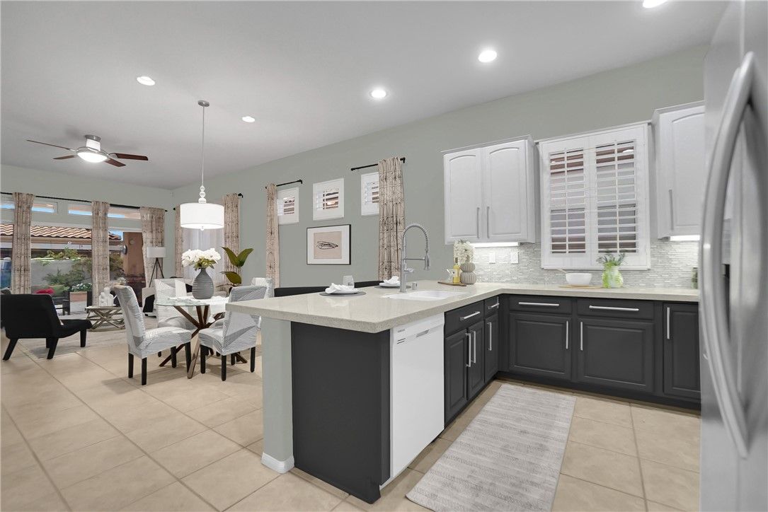 PULTE HOME - PAVE MODEL - PAID OFF SOLAR. TURN KEY & READY TO MOVE IN CONDITION. ONE-STORY 2 BR + 2 BA + Office/Den - 1,471 Sq Ft in Sun Lakes Country Club - amazing resort style amenities. This home is located on a great interior tract location and is elegant and beautifully upgraded. The open-concept floorplan allows for easy entertaining and conversations with your guests whether dining or lounging. There are lots of windows and natural light. The "PAVE" model is a highly sought after floorplan with the bedrooms and bathrooms on opposite sides of the house, perfect when having overnight guests! The den is located in the middle of the two bedrooms and makes a great office or TV room. Kitchen has been remodeled with shaker style cabinets, custom backsplash and quartz countertops. The laundry room is large and has a separate sink - conveniently located off kitchen. Kitchen opens into the spacious dining room and great room with entertainment center and view of the backyard. Master bath has large walk-in shower and clear shower doors. Guest bath has been remodeled with a "Walk-in Tub" a wonderful upgrade for safety and comfort. The backyard is low maintenance with vinyl fencing, grassy area, planters, and covered patio. All of the landscaping is with drought resistant plants and hardscape. Price INCUDES washer, dryer & refrigerator. Sun Lakes offers a premier Southern California location, with gorgeous views! The over 55+ community includes two 18-hole golf courses spread across 1,000 gently rolling acres. The resort setting also features three different clubhouses, fitness centers, two libraries, a grand ballroom, billiards room and a card room. There are tennis courts to enjoy and bocce ball courts as well. Just a short drive east to Palm Springs and lots of shopping. Fruit trees and little gardening area side of the back yard.. CABLE TV & INTERNET included in Dues - Walking distance to South club house. close to the gate 6 enter and exit. You will NOT be disappointed!