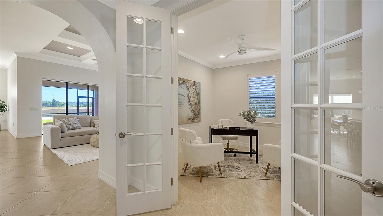 Impeccably maintained maintenance free home located on a private lakefront the end of a cul de sac. This popular Summerwood floor plan features a very open floor plan with 3 bedrooms, office, 2 baths & hurricane shutters for all windows & doors. Living area has upgraded tiles on the diagonal with real wood floors in all bedrooms. RO filtration system included. Kitchen features light cabinets with quartz counters & stainless appliances. Spacious master suite, master bath features a custom floor to ceiling steam shower with blue tooth technology providing the feeling of a private spa. Plantation shutters. This gated community features Olympic size heated pool, spa, fitness, tennis, fire pit, clubhouse with full time activity director* Located on Popular Palmer Ranch near world famous Siesta Key Beach, shopping, golf, restaurants, Legacy Bike Trail, YMCA & easy access to I-75