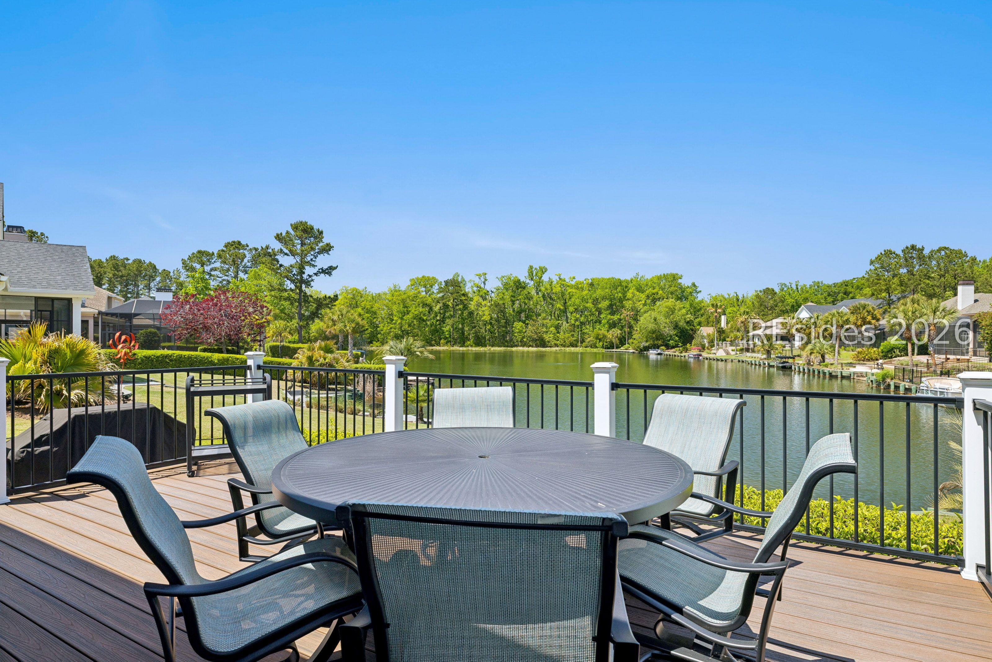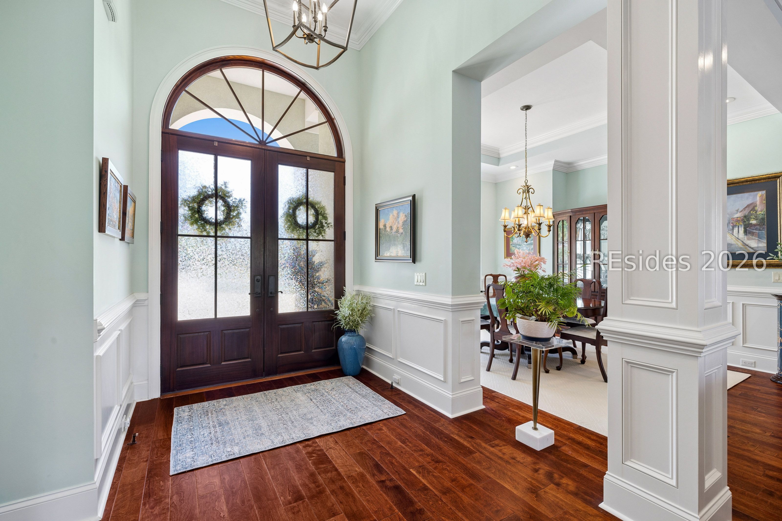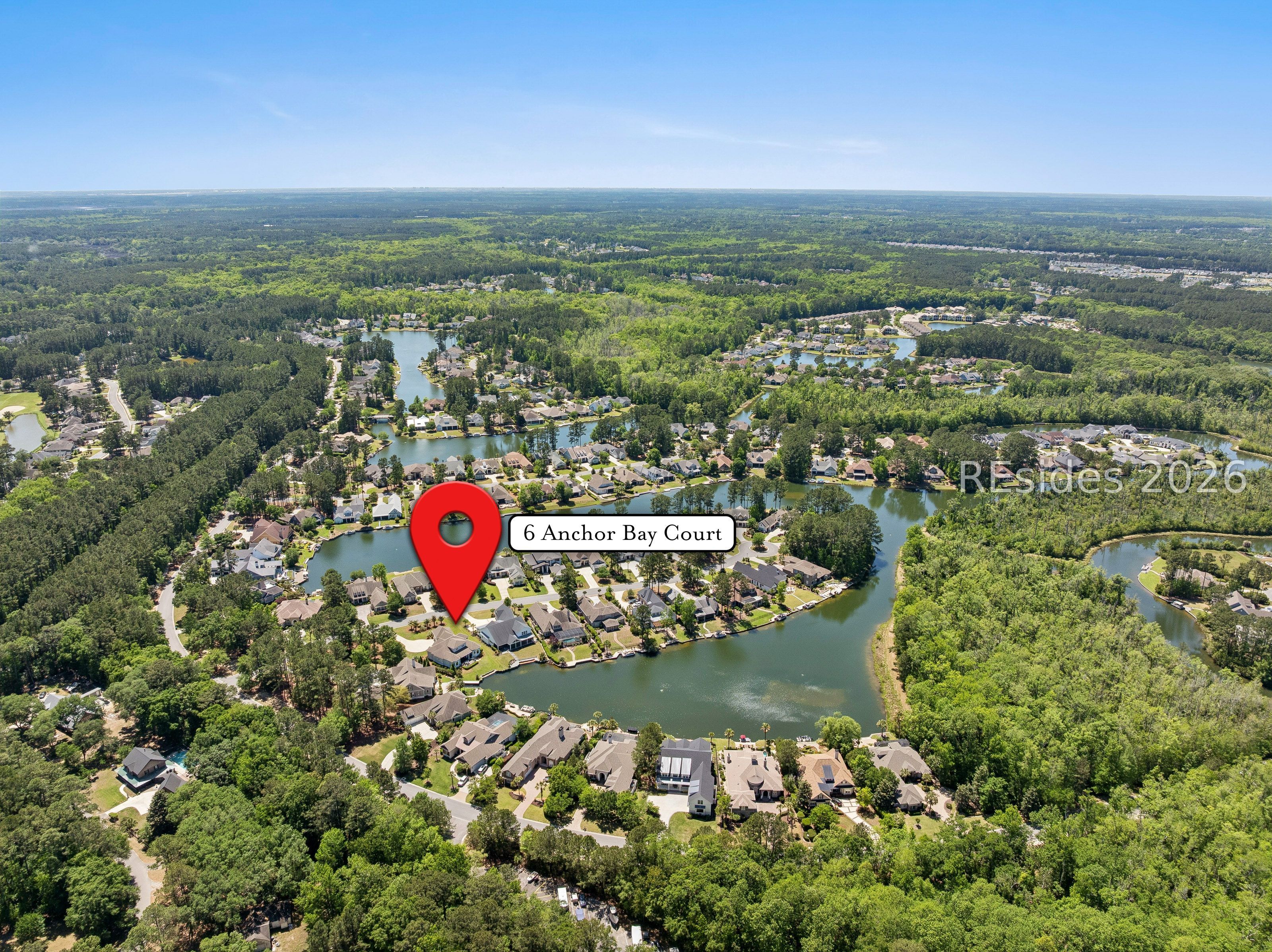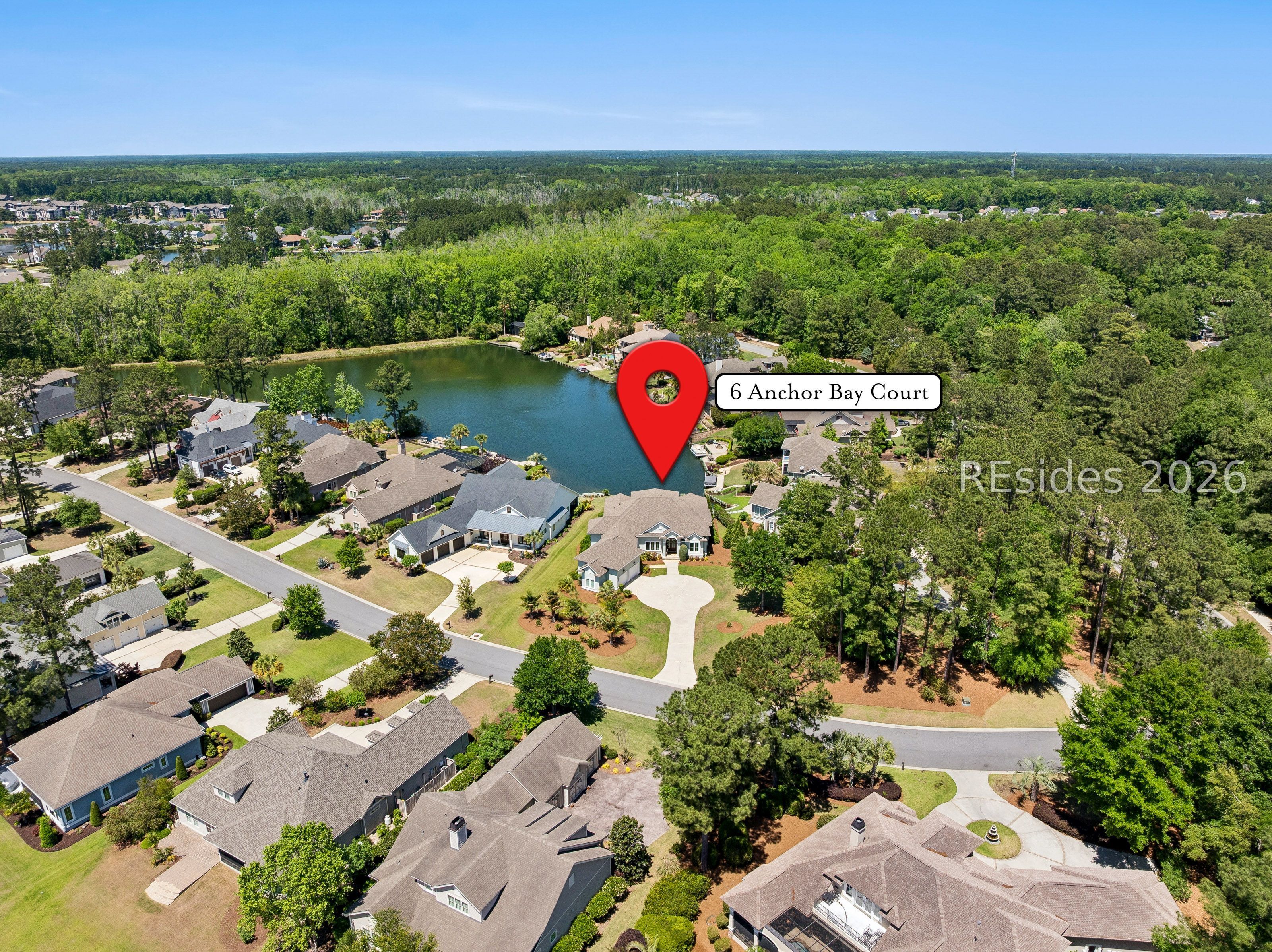 Welcome tο 6 Anсhοr Bay, a stunning сustom-built home by H2 Βuildеrs offering 5 bedrooms, 3.5 bathrooms, plus a dedicated office, all thoughtfully designed for comfort and function. Situated on nearly 2/3 of an acre, this rare property delivers an exceptional level of privacy and craftsmanship that's hard to find. From the moment you step into the grand foyer, your eyes are immediately drawn to the breathtaking long lake views framed by natural preserves in the distance. The chef's kitchen is truly the heart of the home, featuring double ovens, a large butler's pantry with an additional refrigerator, and beautiful cabinetry paired with quartz countertops, perfect for hosting gatherings of any size. The first-floor primary suite is a private retreat, complete with a luxurious bathroom and an expansive, thoughtfully designed closet. Two additional bedrooms, one complete with an incredible ensuite bathroom and a dedicated office on the main level. Upstairs offers the perfect guest getaway with two spacious bedrooms, a full bathroom, and a large walk-in attic. Collapsible sliders seamlessly blend indoor and outdoor living, opening up to let you fully embrace the serene setting. Step outside onto a spacious deck overlooking the lake. You'll enjoy peaceful water views, a forest preserve backdrop, and your own private dock, ideal for embracing the full waterfront lifestyle. Additional upgrades include electric blinds, spray foam insulation, a phantom screen porch, epoxy-coated garage floors, and an instant hot water heater. Oversize 2 car garage with plenty of storage space or room for golf cart. Located within the award-winning, gated community of Hampton Lake, residents enjoy world-class amenities.