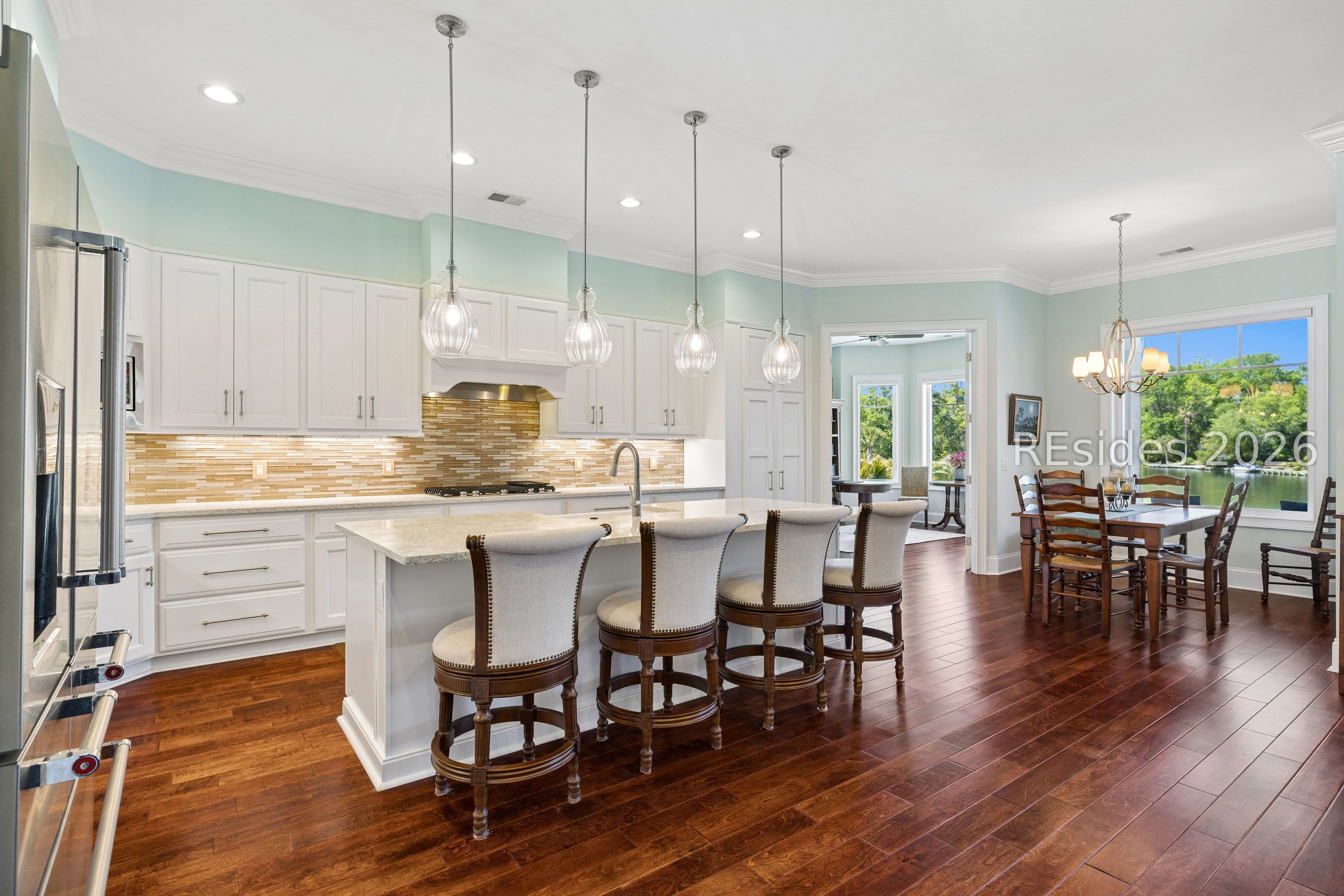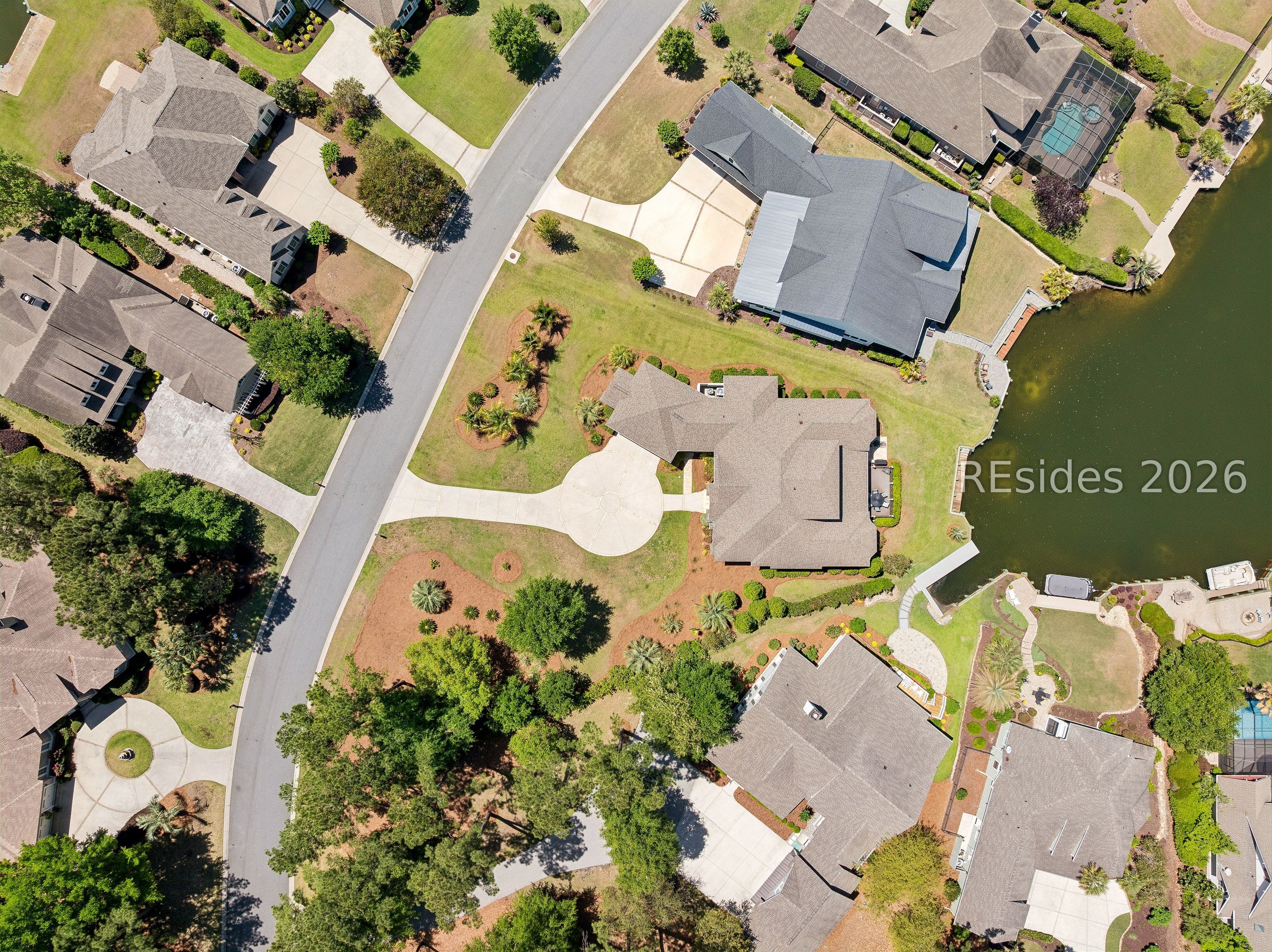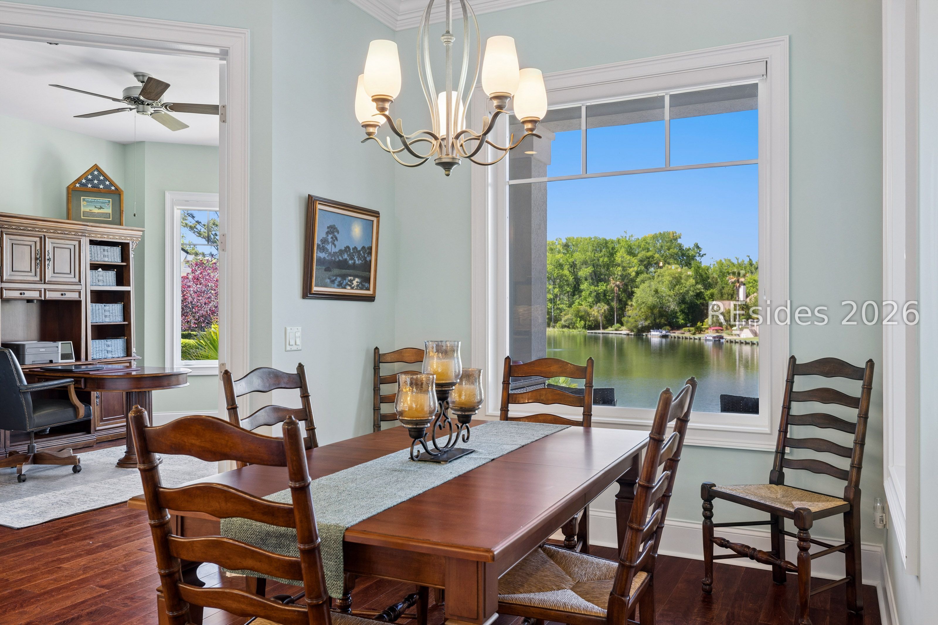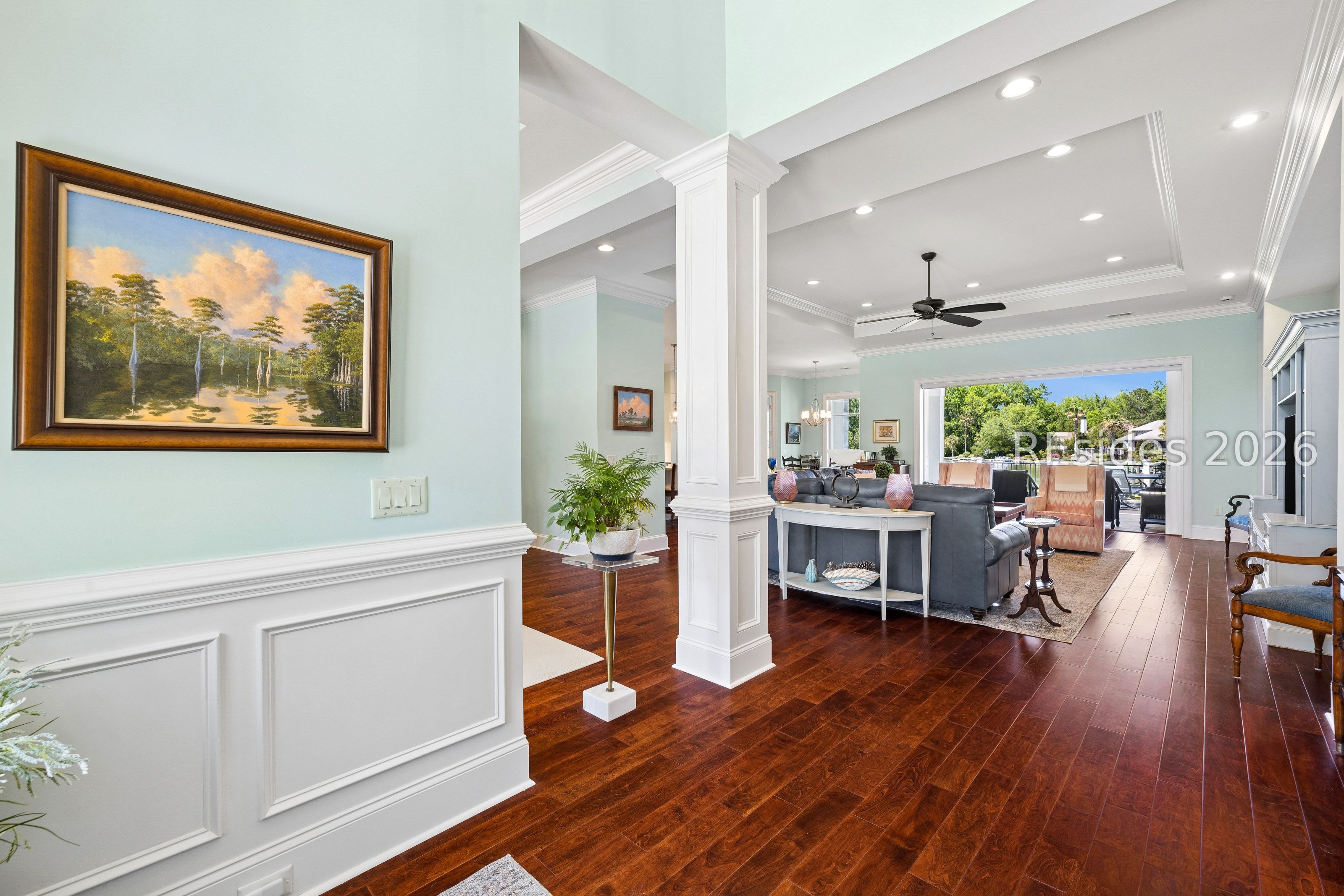 Welcome tο 6 Anсhοr Bay, a stunning сustom-built home by H2 Βuildеrs offering 5 bedrooms, 3.5 bathrooms, plus a dedicated office, all thoughtfully designed for comfort and function. Situated on nearly 2/3 of an acre, this rare property delivers an exceptional level of privacy and craftsmanship that's hard to find. From the moment you step into the grand foyer, your eyes are immediately drawn to the breathtaking long lake views framed by natural preserves in the distance. The chef's kitchen is truly the heart of the home, featuring double ovens, a large butler's pantry with an additional refrigerator, and beautiful cabinetry paired with quartz countertops, perfect for hosting gatherings of any size. The first-floor primary suite is a private retreat, complete with a luxurious bathroom and an expansive, thoughtfully designed closet. Two additional bedrooms, one complete with an incredible ensuite bathroom and a dedicated office on the main level. Upstairs offers the perfect guest getaway with two spacious bedrooms, a full bathroom, and a large walk-in attic. Collapsible sliders seamlessly blend indoor and outdoor living, opening up to let you fully embrace the serene setting. Step outside onto a spacious deck overlooking the lake. You'll enjoy peaceful water views, a forest preserve backdrop, and your own private dock, ideal for embracing the full waterfront lifestyle. Additional upgrades include electric blinds, spray foam insulation, a phantom screen porch, epoxy-coated garage floors, and an instant hot water heater. Oversize 2 car garage with plenty of storage space or room for golf cart. Located within the award-winning, gated community of Hampton Lake, residents enjoy world-class amenities.