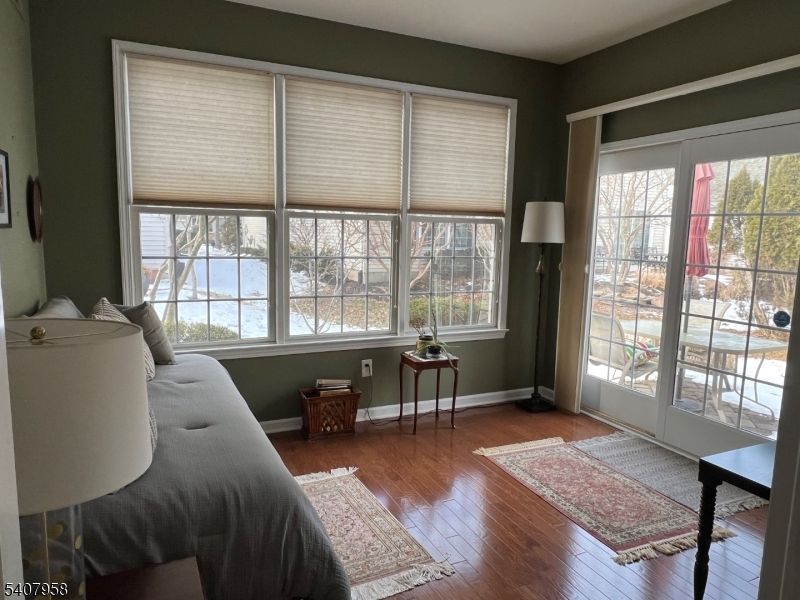 Berkeley Model with French doors to added sunroom. Beautifully maintained home, gleaming hardwood floors in most rooms. Formal Living Room/Dining Room. Large eat in kitchen with and extended center island, pantry closet, refrigerator-2023, disposal "as is". Primary bedroom has a tray ceiling, walk in closets, and a full bath with double sinks, and soaking tub. Second bedroom/office with full bath nearby, with built in linen closet. Stackable washer/dryer in Laundry Room. Rear paver patio. Water Heater March 2024