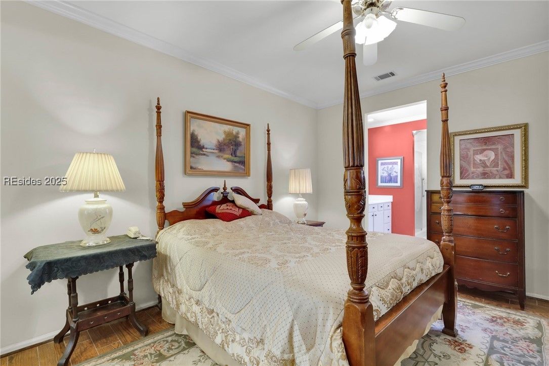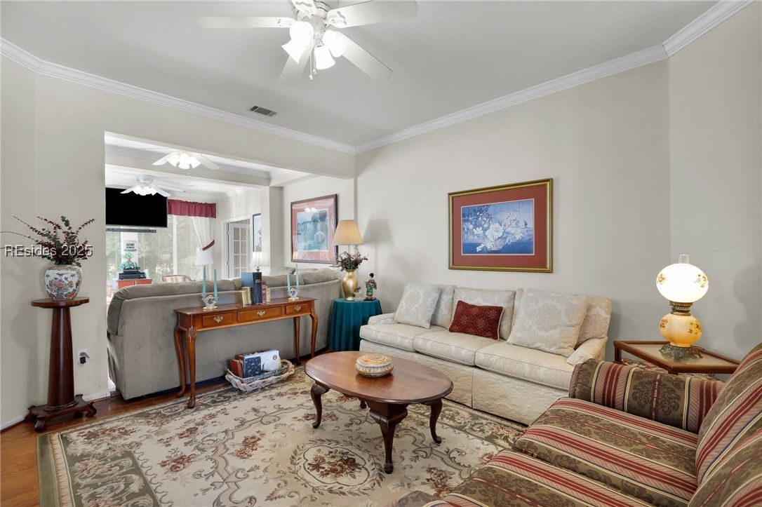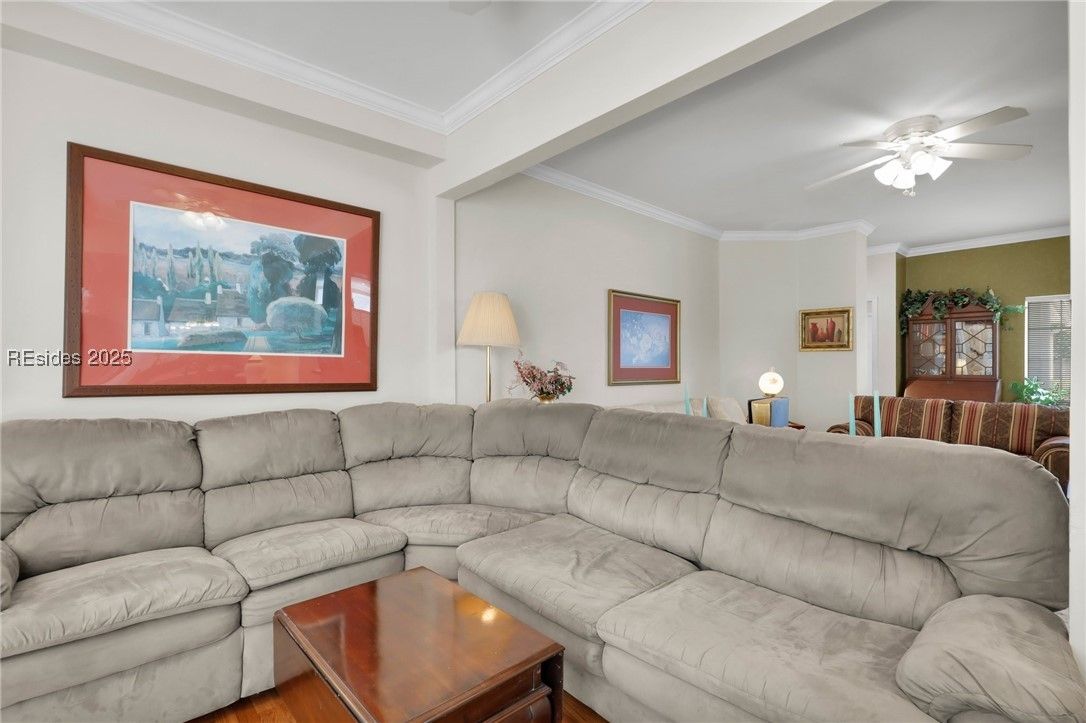 Expanded Barton/Saratoga conveniently located to Town Square. Great to be able to walk out your door & walk to Town Square fitness center, pools, tennis, pickleball, theatre, Okatie Creek restaurant, etc. This home, located on cul-de-sac court, has Hardiplank exterior, extended Great Room adjoining den/office/sleeping area; kitchen with granite countertops & breakfast bar; primary extended bedroom w/desk area & bath w/walk in shower & walk in closet. Split floor plan for guest privacy. Wood & tile floors, ceiling fans & crown molding throughout. Extended back patio for relaxing after a hard day at play.