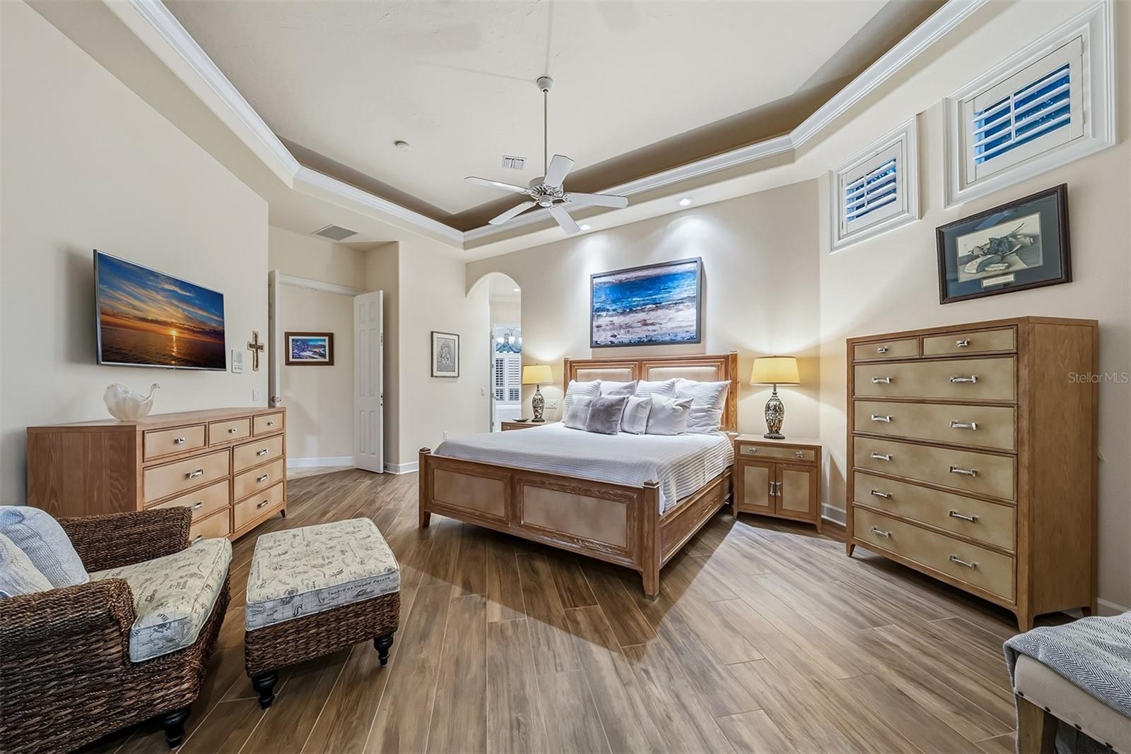 - Ceiling Fan(s), Chair Rail, Crown Molding, Eat-in Kitchen, High Ceilings, Kitchen/Family Room Combo, Main Level Primary, Solid-Wood Cabinets, Split Bedrooms, Stone Counters, Tray Ceiling(s), Walk-In Closet(s), Window Treatments