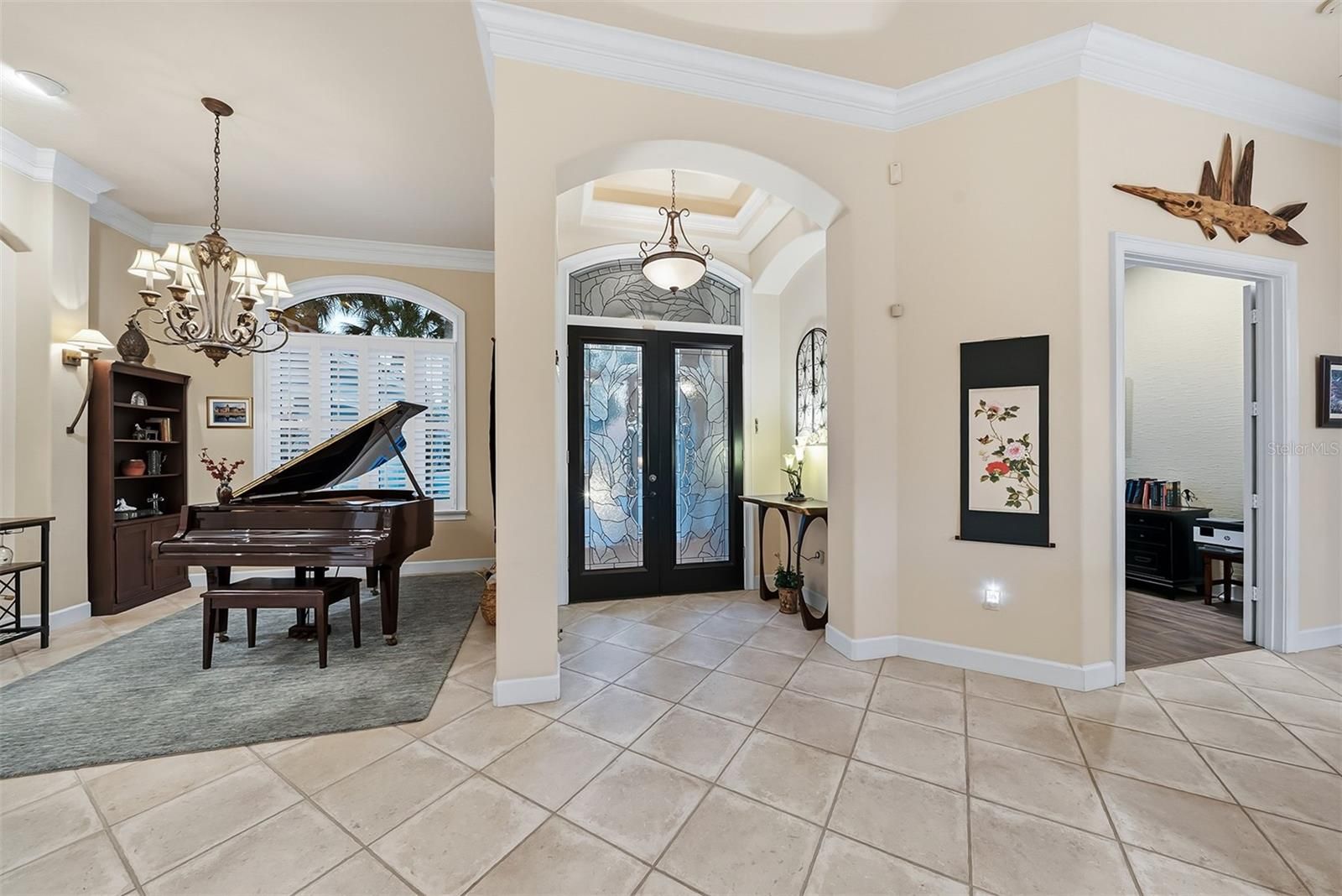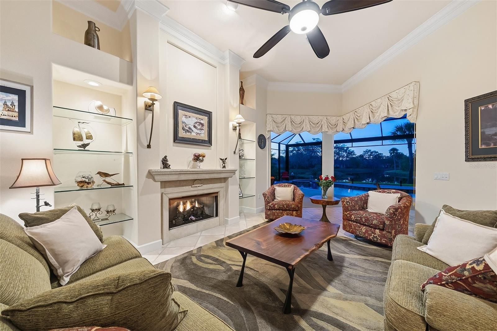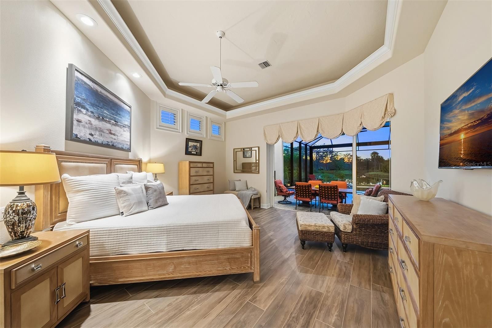 This family compound sits on over a half-acre with 170 feet of lake front, 3,100 square foot main house and 500 square foot guest house! Canopies of trees line the streets and drive approaching this home, framing its magnificent architecture. Entering through its leaded glass doors, you look through the vanishing angular glass walls to the expansive pool and lake views onto an Island Preserve filled with wildlife. The architecture features 12 foot waffled and tray ceilings, archways, stone appointments and decadent moldings. This home was built for entertaining with a formal dining room and living room with stone appointed gas fireplace. An archway opens to the grand kitchen/great room and breakfast nook which also features a vanishing angular glass wall. The gourmet kitchen with 42 inch cherry cabinetry and granite is fitted with proper professional appliances, which one would expect in a home of this caliper. The private primary suite also opens to the lanai, with spa-like bath with dual vanities, Jacuzzi tub, and large Roman shower. The guest wing features 2 bedrooms and 2 bathrooms, one of which opens to the pool area. The large sprawling lanai with summer kitchen and caged pool/spa area connects the main house with the guest house that has its own kitchenette and bath. The design of this home makes it hard to discern if you are inside or outside of this home. Get in your golf cart (with its separate garage) and head to state of the art country club for lunch or dinner! Golf, tennis, pickleball, fitness and soon Boca Royale’s gates will open in Wellen Park for dining, shopping and the ballpark! No, I haven’t forgotten your best friend, it is close to the large and small dog parks a few blocks away! Is this the beach home where you should continue, or start making family memories?