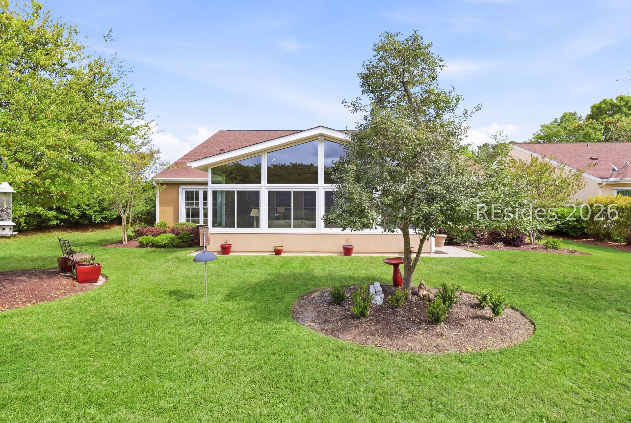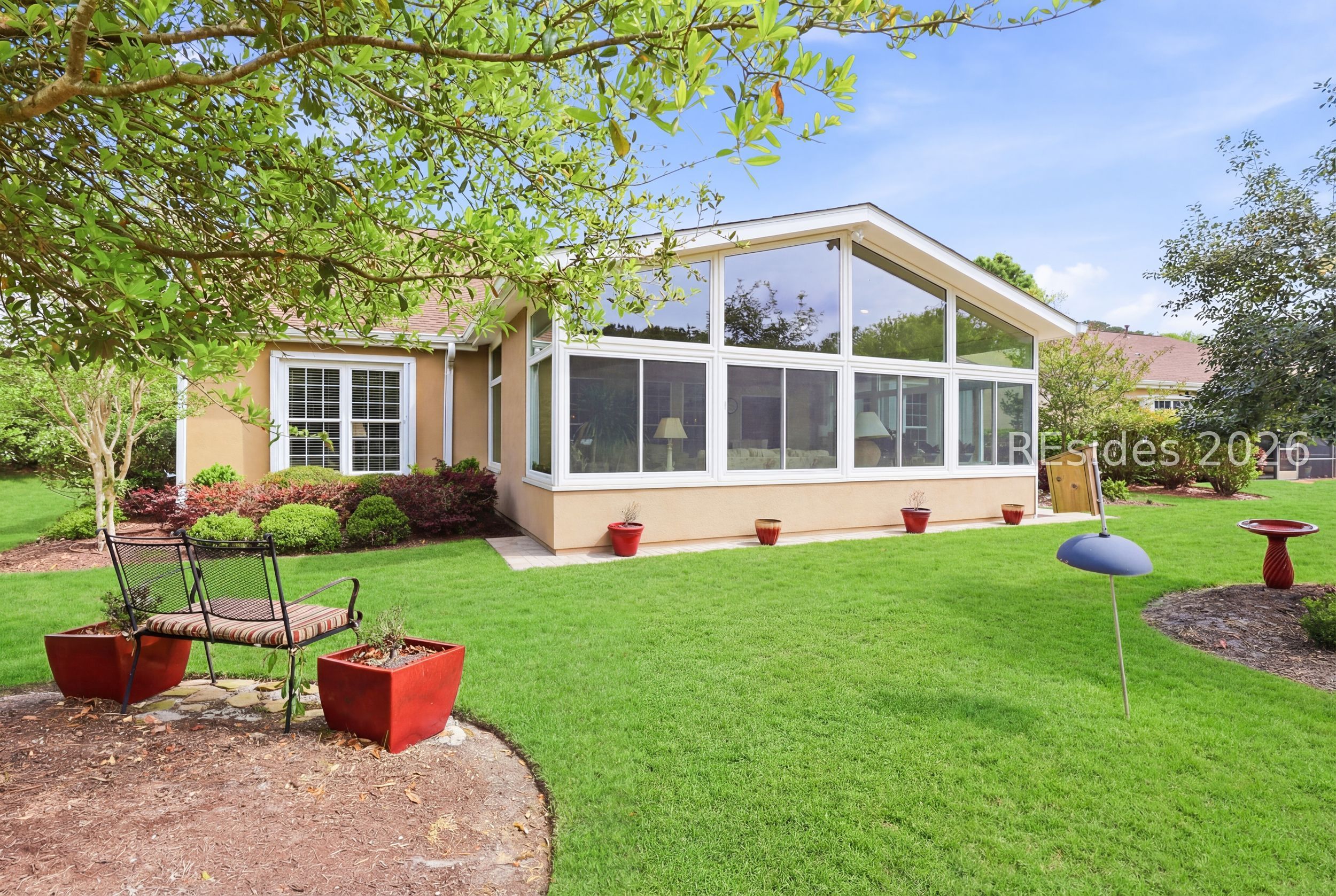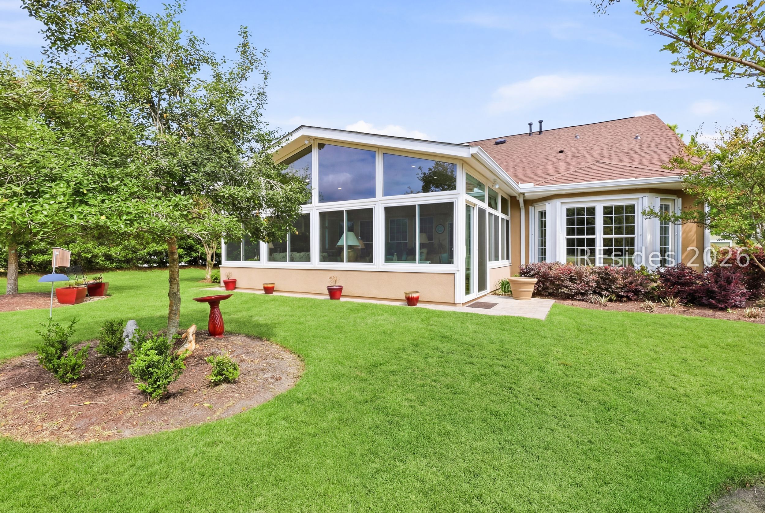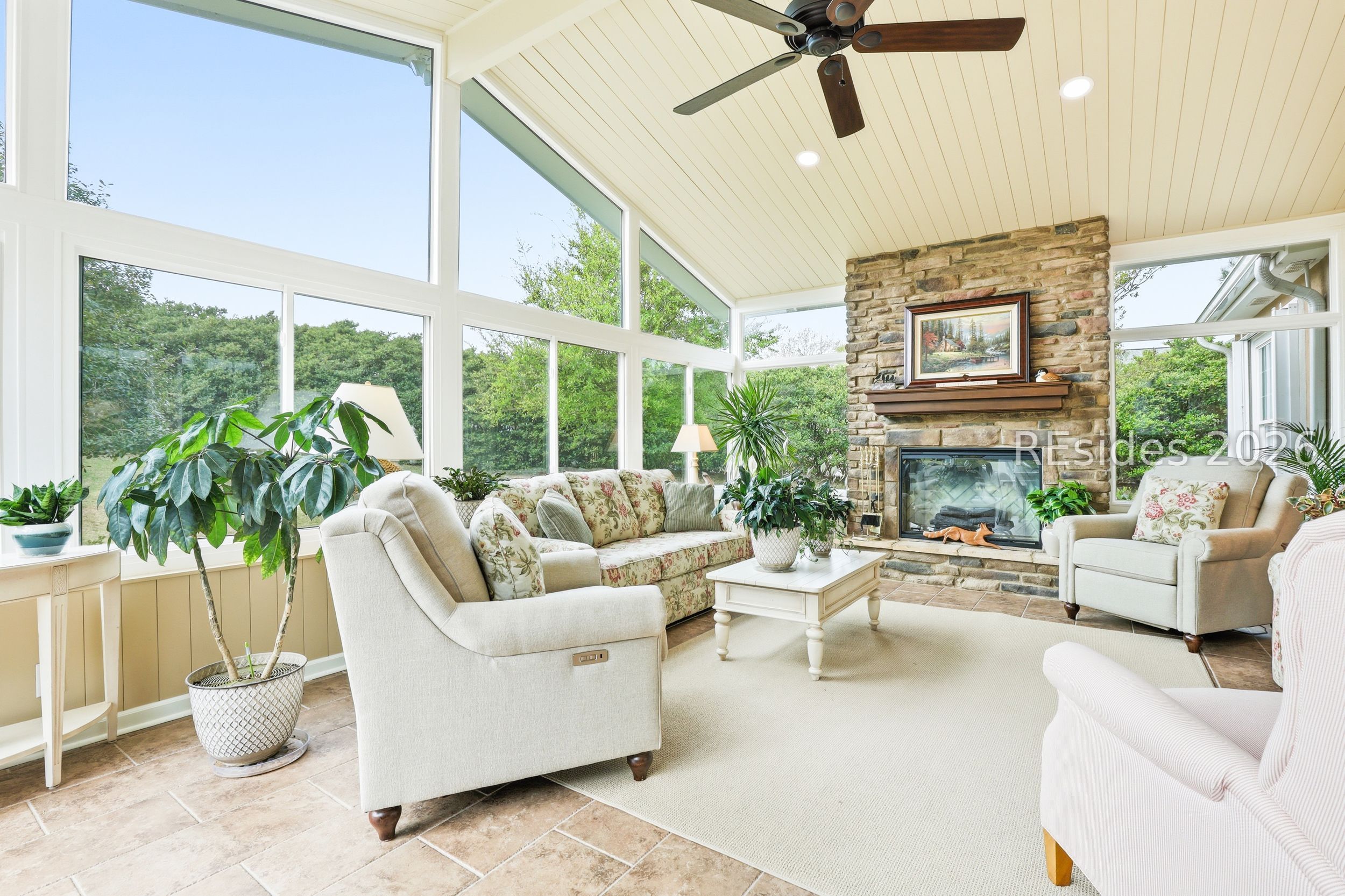 Move-in-ready Sycamore model with over $150,000 in upgrades, including the entire home being re-stuccoed. Located on the south side of Sun City with low Beaufort County taxes, this home offers gorgeous curb appeal with an updated landscaping package featuring shrubs, sod, and a newer irrigation system. Major updates include a newer roof, HVAC, water heater, and interior paint. The rare 2.5-car garage, beautiful landscaping, and covered front porch make a striking first impression.With over 3,000 square feet, this home offers 3 bedrooms, each with its own private bathroom, including one with a step-in Kohler Jacuzzi tub, plus a convenient powder room for guests. There is no carpet throughout. The layout includes a formal dining room, flex space, and an open-concept design perfect for entertaining. The kitchen features ample cabinetry, granite countertops, a center island, double ovens, a gas stove, and a Viking refrigerator. The living room is enhanced by built-in bookshelves and a gas fireplace.The owner's suite includes a large walk-in closet with custom organization system and a remodeled en suite bath. A standout feature is the expansive 16x24 four-season sunroom with a private wooded view and an additional fireplace. Other features include walk-up attic access with ample storage, washer and dryer conveying, laundry room with utility sink, smooth ceilings, skylight, recessed lighting, ceiling fans, crown molding, gutters, hurricane shutters on all windows and doors, surround sound, central vacuum, and a tankless water heater.