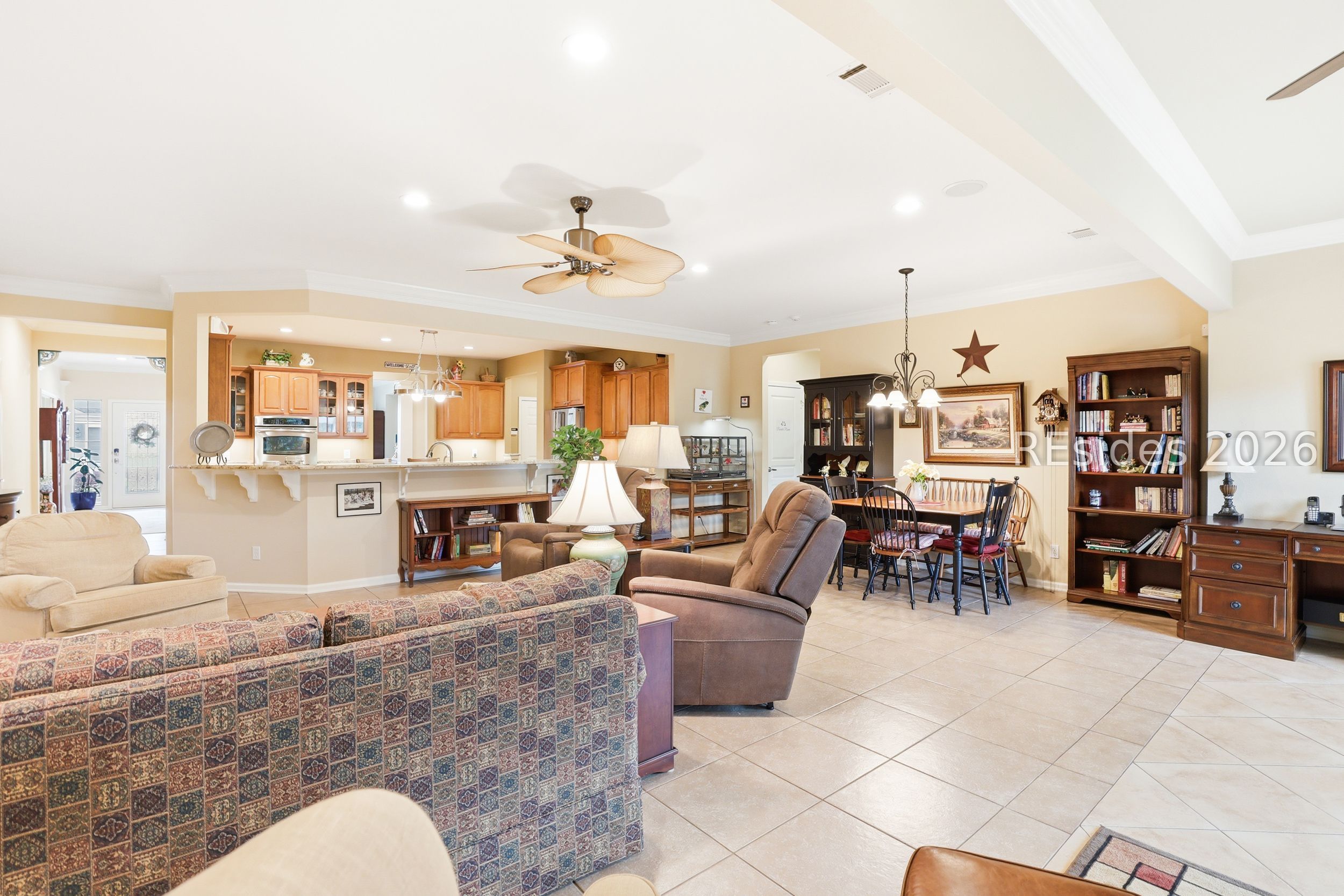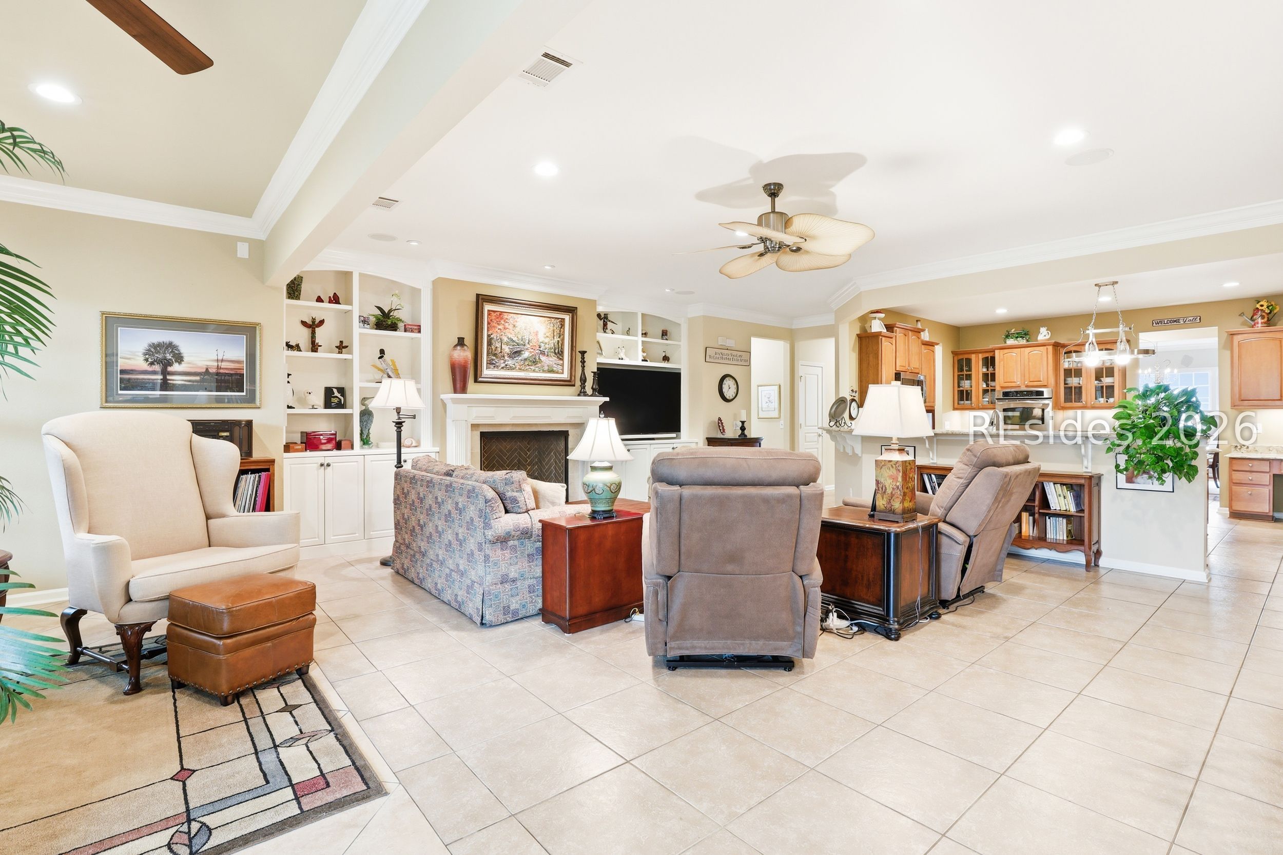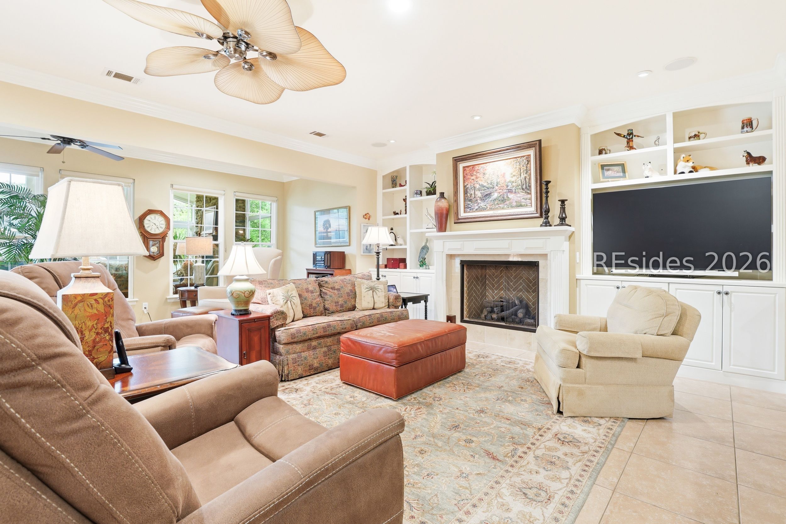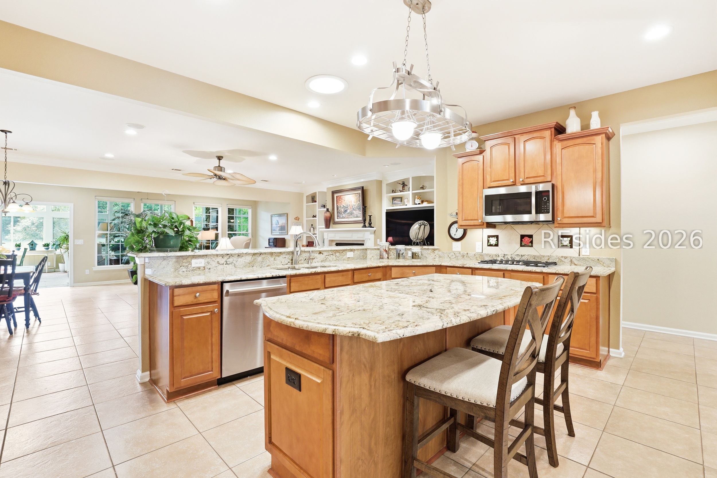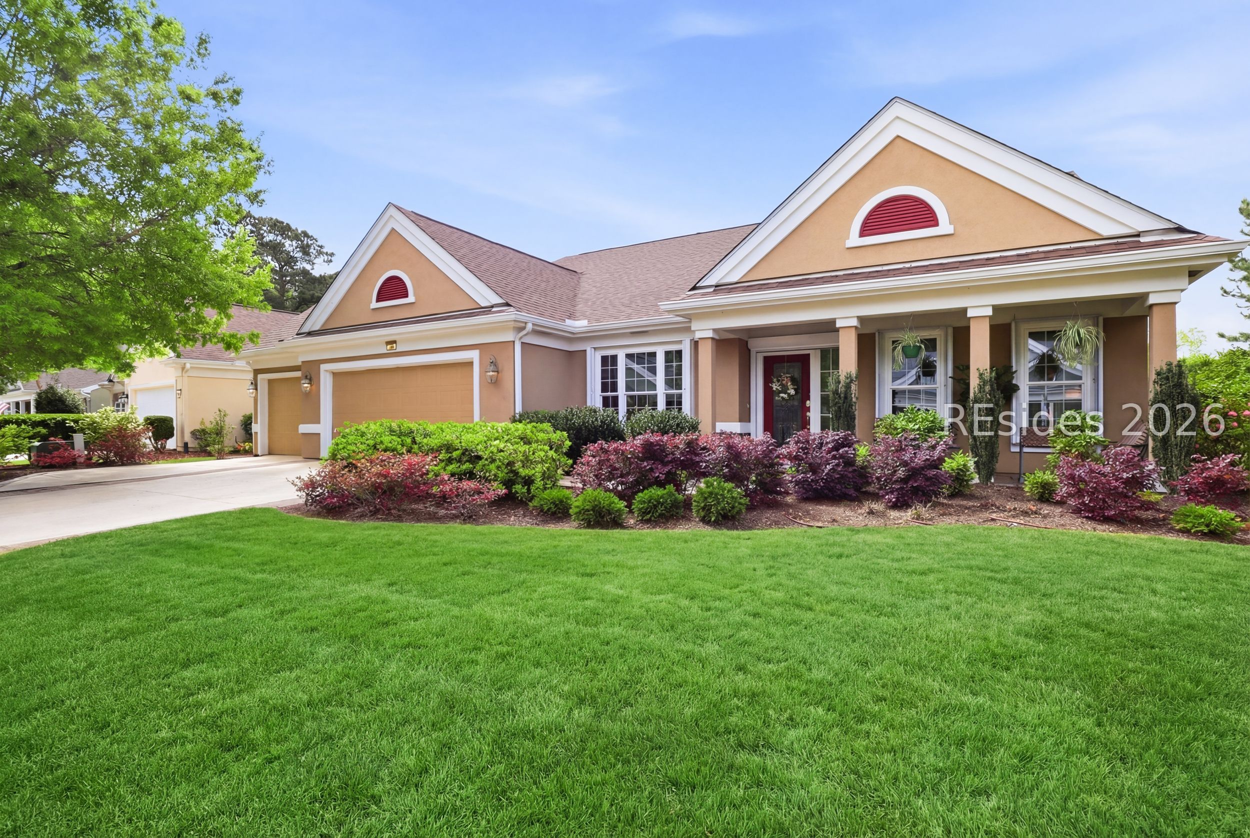 Move-in-ready Sycamore model with over $150,000 in upgrades, including the entire home being re-stuccoed. Located on the south side of Sun City with low Beaufort County taxes, this home offers gorgeous curb appeal with an updated landscaping package featuring shrubs, sod, and a newer irrigation system. Major updates include a newer roof, HVAC, water heater, and interior paint. The rare 2.5-car garage, beautiful landscaping, and covered front porch make a striking first impression.With over 3,000 square feet, this home offers 3 bedrooms, each with its own private bathroom, including one with a step-in Kohler Jacuzzi tub, plus a convenient powder room for guests. There is no carpet throughout. The layout includes a formal dining room, flex space, and an open-concept design perfect for entertaining. The kitchen features ample cabinetry, granite countertops, a center island, double ovens, a gas stove, and a Viking refrigerator. The living room is enhanced by built-in bookshelves and a gas fireplace.The owner's suite includes a large walk-in closet with custom organization system and a remodeled en suite bath. A standout feature is the expansive 16x24 four-season sunroom with a private wooded view and an additional fireplace. Other features include walk-up attic access with ample storage, washer and dryer conveying, laundry room with utility sink, smooth ceilings, skylight, recessed lighting, ceiling fans, crown molding, gutters, hurricane shutters on all windows and doors, surround sound, central vacuum, and a tankless water heater.