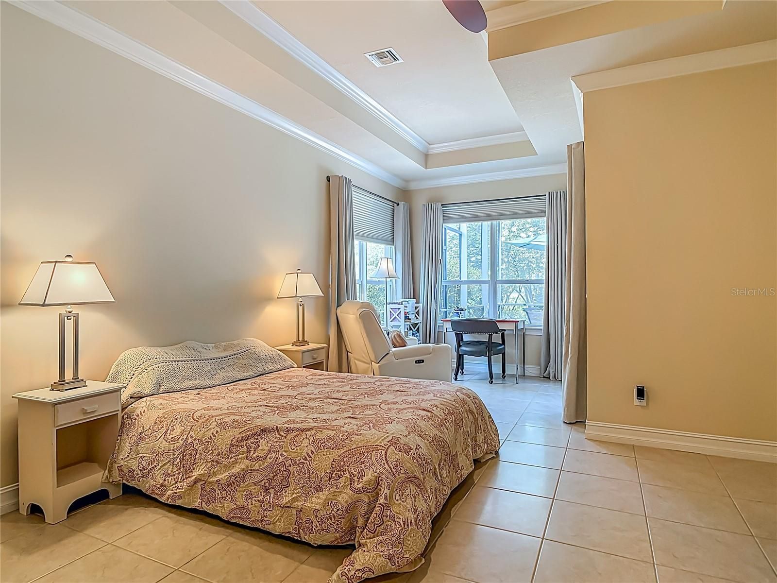 - Ceiling Fan(s), Coffered Ceiling(s), Crown Molding, Eat-in Kitchen, High Ceilings, Kitchen/Family Room Combo, Open Floorplan, Solid Surface Counters, Split Bedrooms, Stone Counters, Tray Ceiling(s), Walk-In Closet(s), Window Treatments