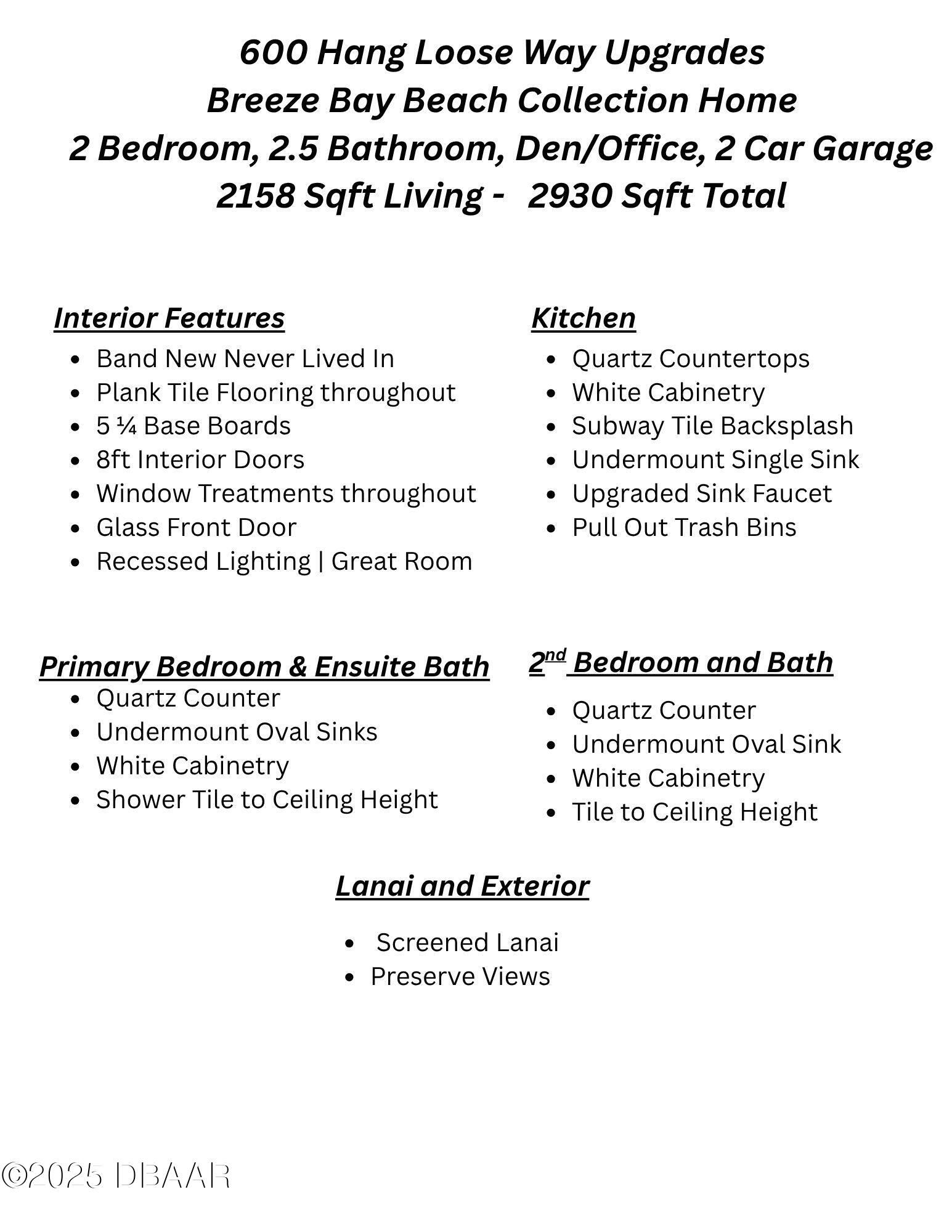 BRAND NEW, NEVER LIVED IN Breeze Bay! Come create your dream home in Paradise! 2 bedroom, 2.5 bath plus Den/Office. This wildly popular model has that coastal vibe plank tile flooring in all rooms, 5 1/4 baseboards, 8ft interior doors, window treatments & glass front door. A cooks delight kitchen features tons of clean white cabinetry, S/S appliances, a large quartz island that seats several guests & timeless subway tile backsplash. Enjoy open concept living in the spacious great room with a tray ceiling & recessed LED lighting that opens with a triple slider to a screened lanai with plenty of room to expand. The primary bedroom overlooks a preserve and also features a tray ceiling, ensuite spa like bathroom plus two walk-in closets. The possibilities are endless with designing your new home. The amazing amenities are the icing on this dream with pickleball, tennis, paradise pool, sports pool, fitness classes and a private beach club with transportation!