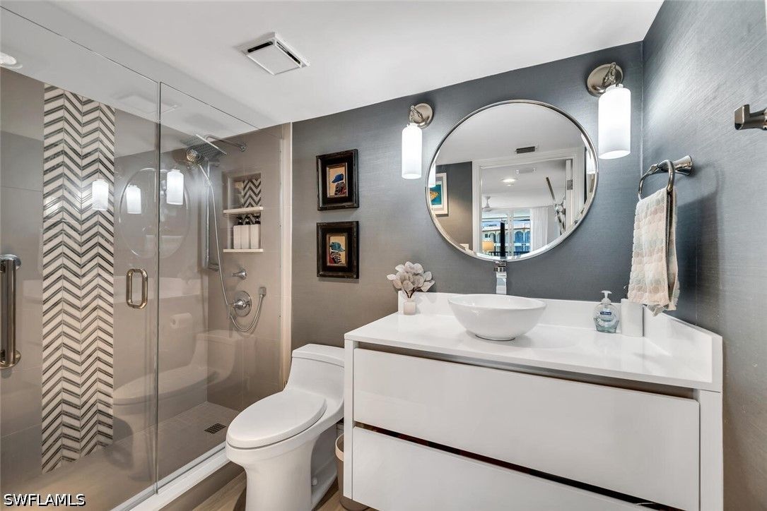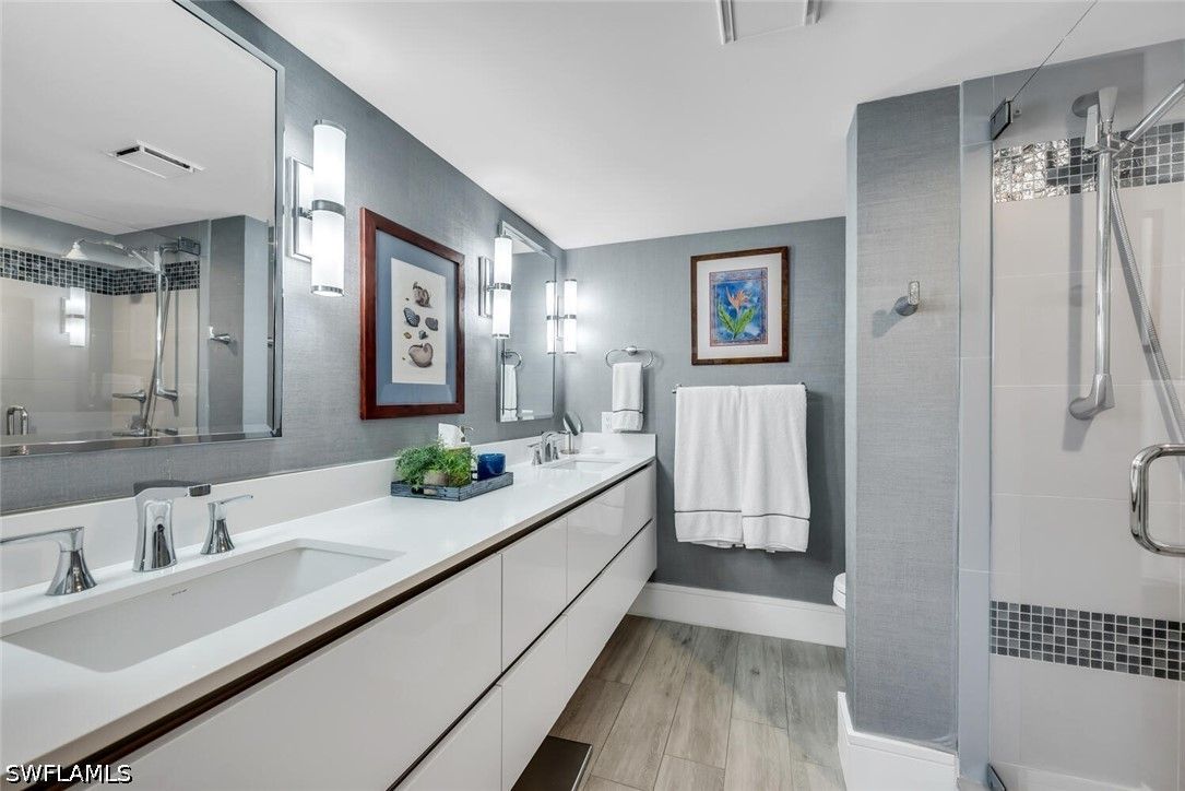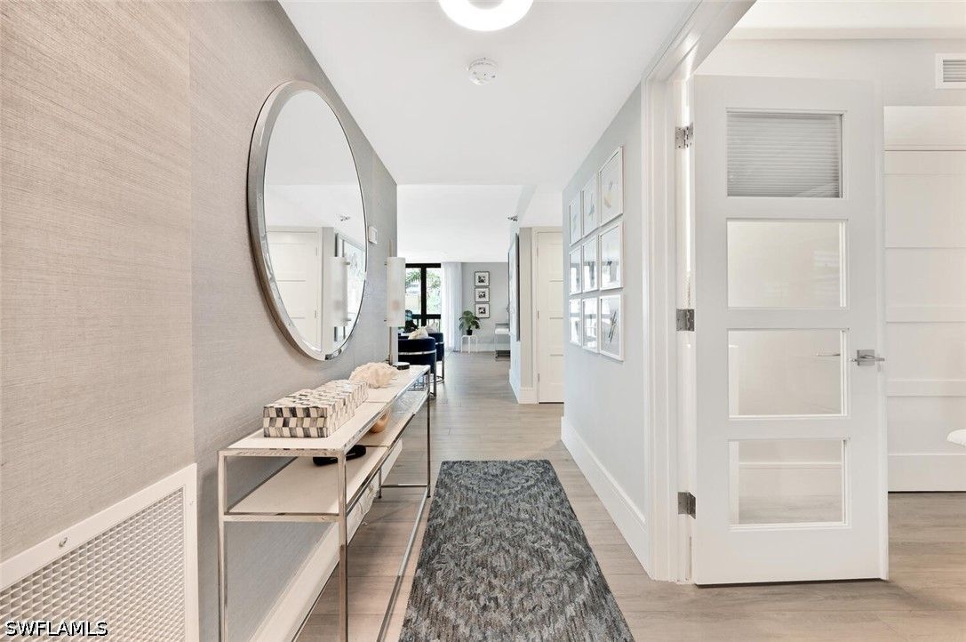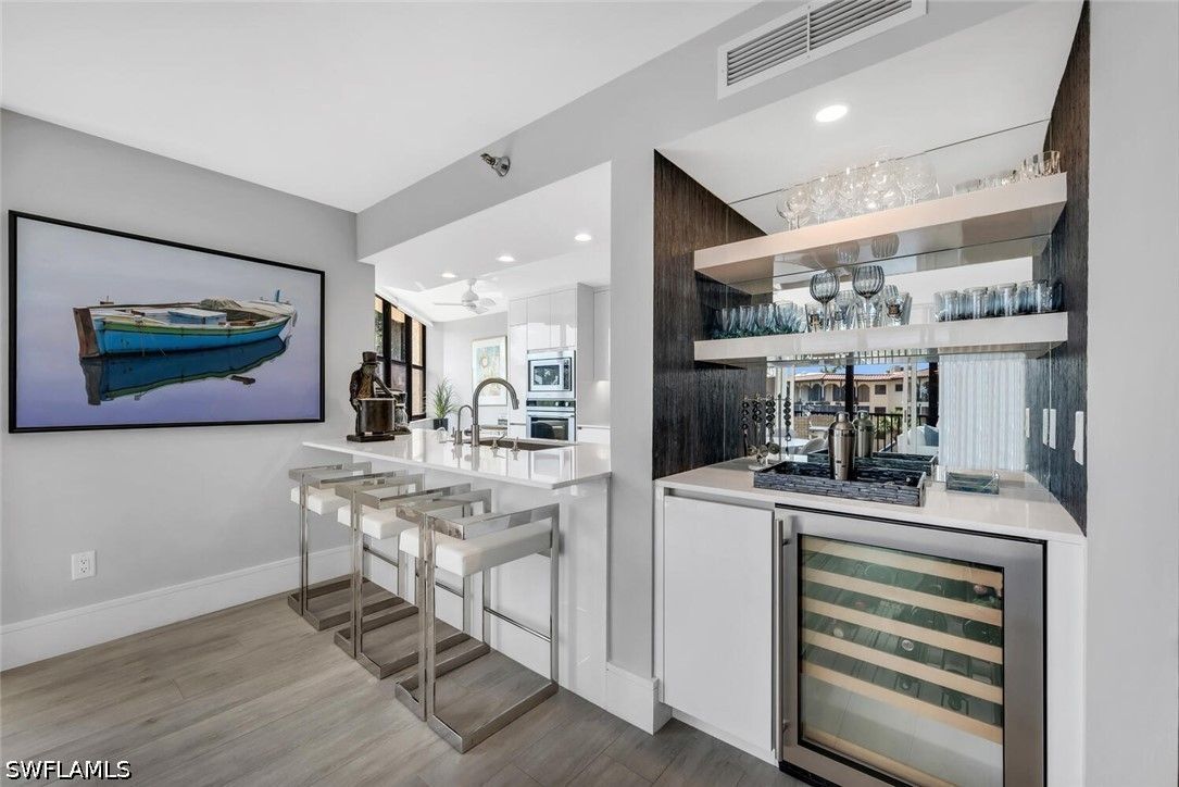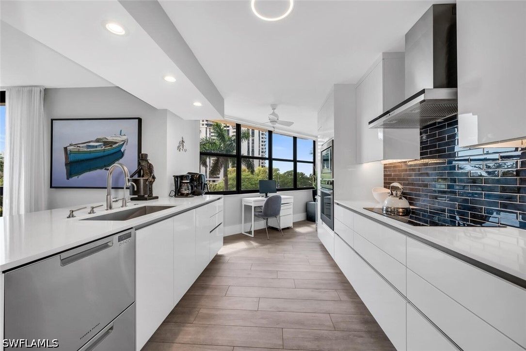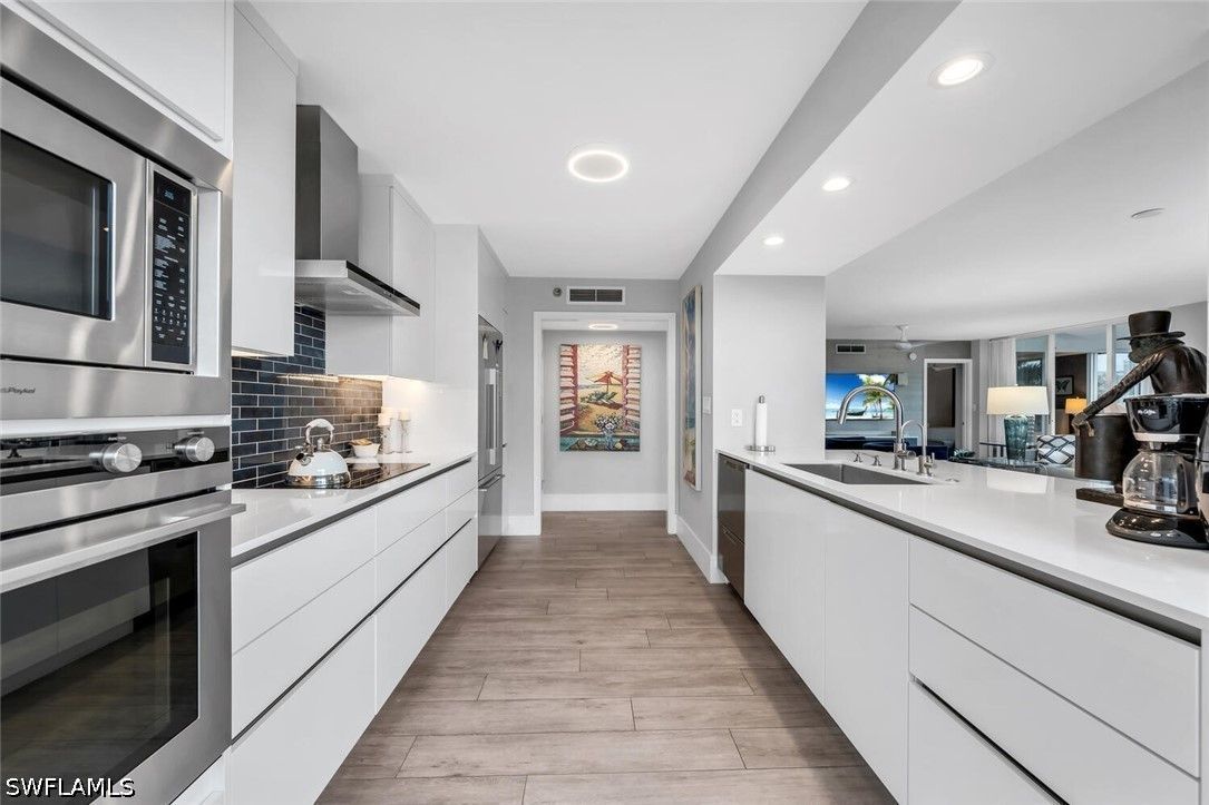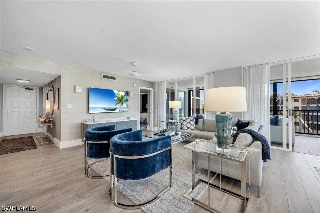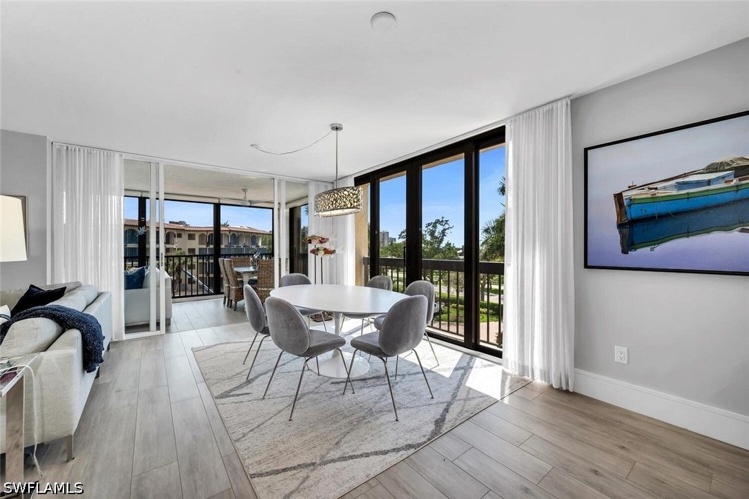 Meticulously updated and furnished Chateaumere Royale condominium designed by DAVID FRUSCIONE Republic of Design. Just steps from The Commons, beach transportation and renowned Tennis Facility. This contemporary residence featuring wood-look porcelain flooring, and a neutral color palette that creates a bright and airy ambiance. The sleek kitchen offers Fisher & Paykel stainless steel appliances and Induction cooktop, Eurocraft custom European cabinetry, and quartz countertops. The two living areas provide ample space for entertaining guests. Large impact resistant windows and doors w/remote operated blinds. Both master suite w/walk-in closet and an en-suite bathroom & 2nd bedroom w/murphy bed have been tastefully renovated. Amenities include 3 swimming pools, a fitness center, tennis courts, and exclusive beach access w/ chair and umbrella service. Conveniently located, this property provides easy access to upscale shopping, fine dining establishments, and cultural attractions. The nearby Pelican Bay Golf Club offers an elite golfing experience. Experience the epitome of luxury, sophistication, and an unmatched lifestyle within the esteemed Pelican Bay community.