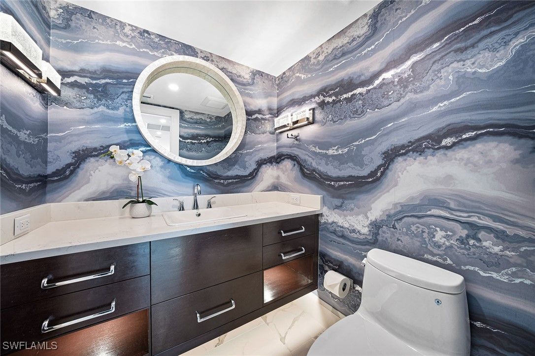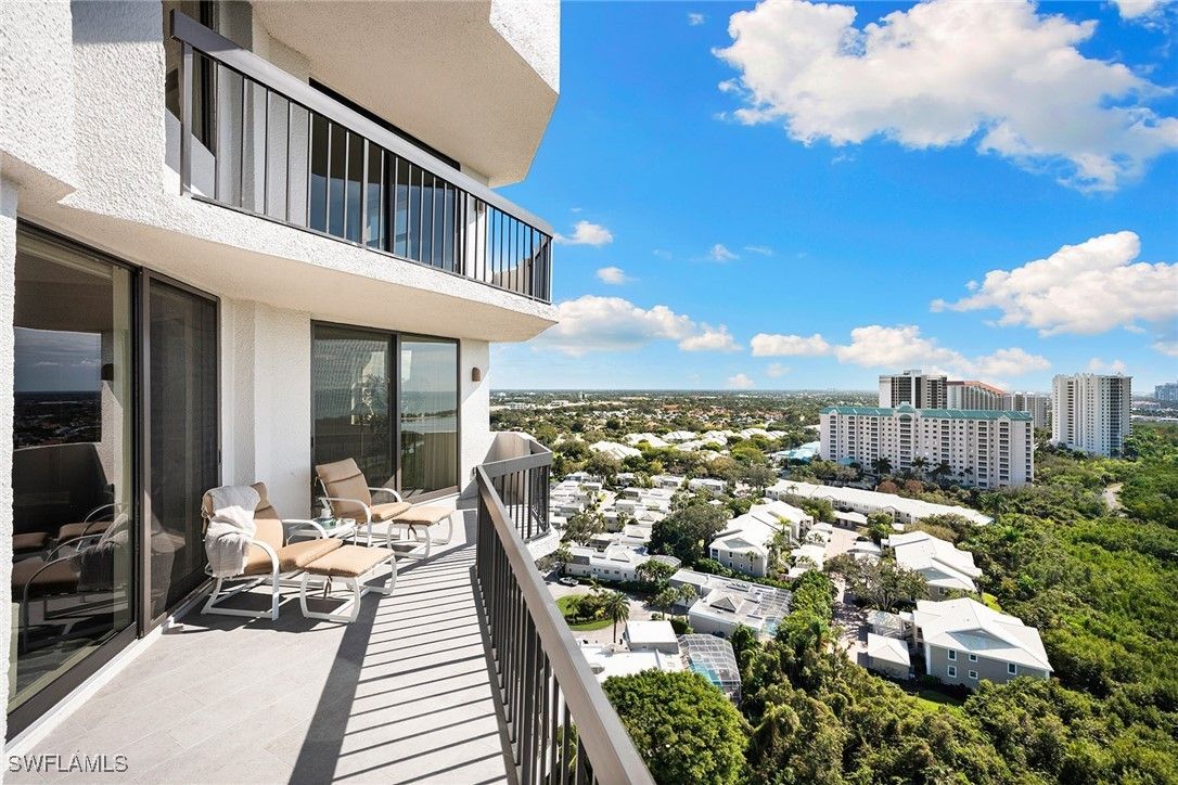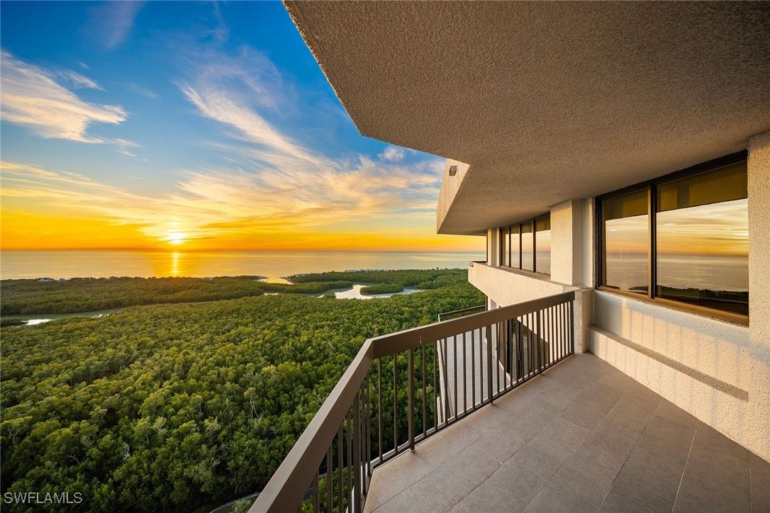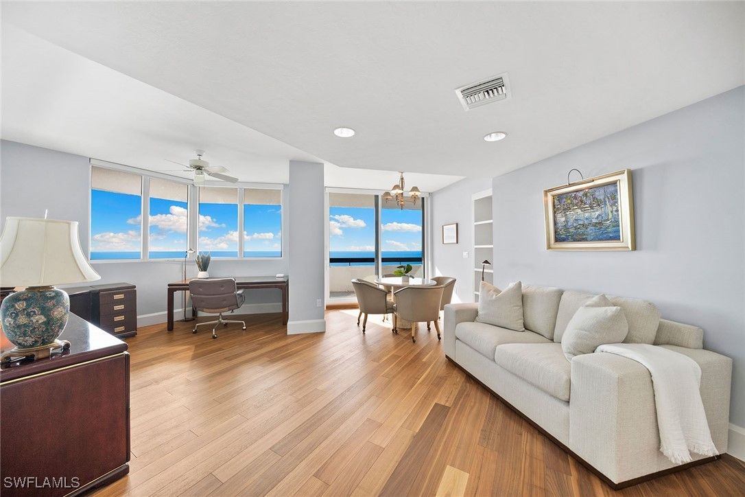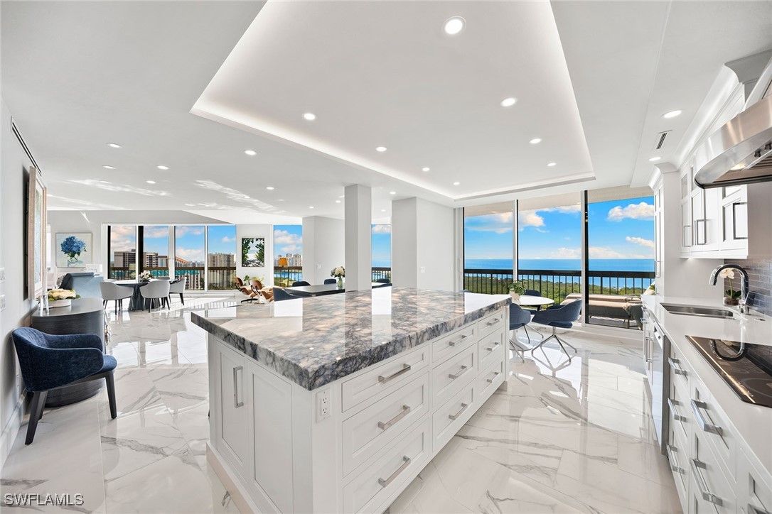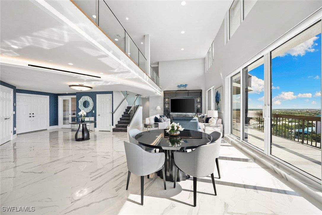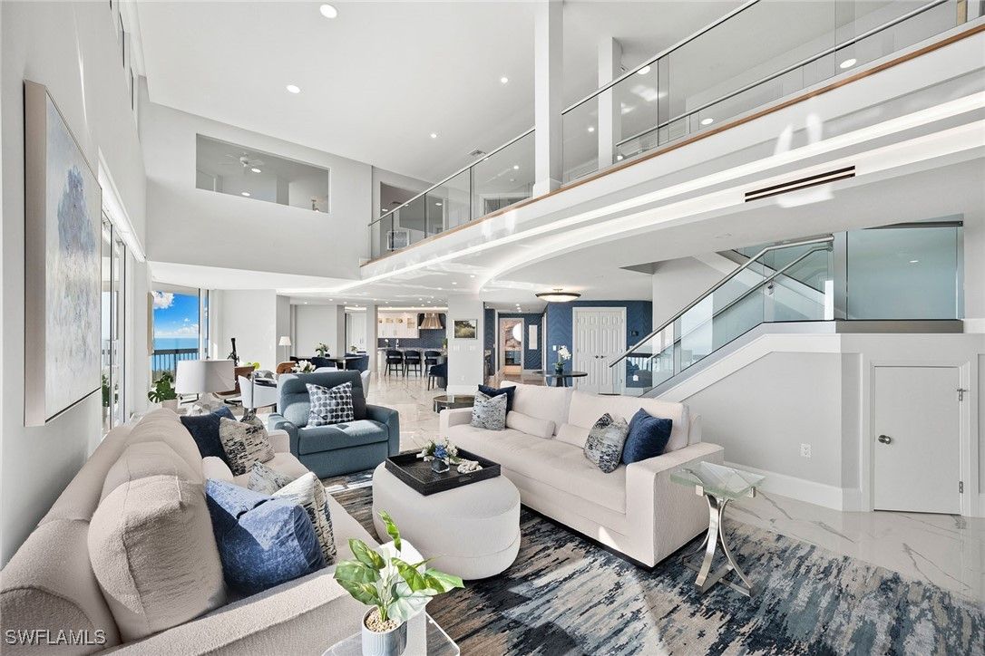 A wow showcase and unique 1-of-1, two-story penthouse perched in the sky with direct, unobstructed, panoramic Gulf views spanning the entire side of the building, among the most jaw-dropping in Naples. This expansive residence offers four bedrooms plus den, four baths and 5,500-plus square feet of living space. Newly remastered and professionally designed, featuring floor-to-ceiling impact glass sliders and windows, modern glass railing, and over 1,000-plus square feet of wraparound lanai space. Modernized in 2023 with a reimagined floor plan, to-the-studs chef's kitchen, expanded wet bar, walk-in pantry, enlarged laundry and designer powder room. The main level includes an owner's suite, den (or bedroom), and elegant Italian tile throughout. The upper level offers three additional bedrooms, an owner's suite, bonus loft/media space and versatile multi-purpose area. Offered turnkey furnished. Enjoy Custom closet systems, Hunter Douglas shades on remote throughout, two secure parking spaces plus extra storage. 2nd closest bldg. on the berm to private South Beach.