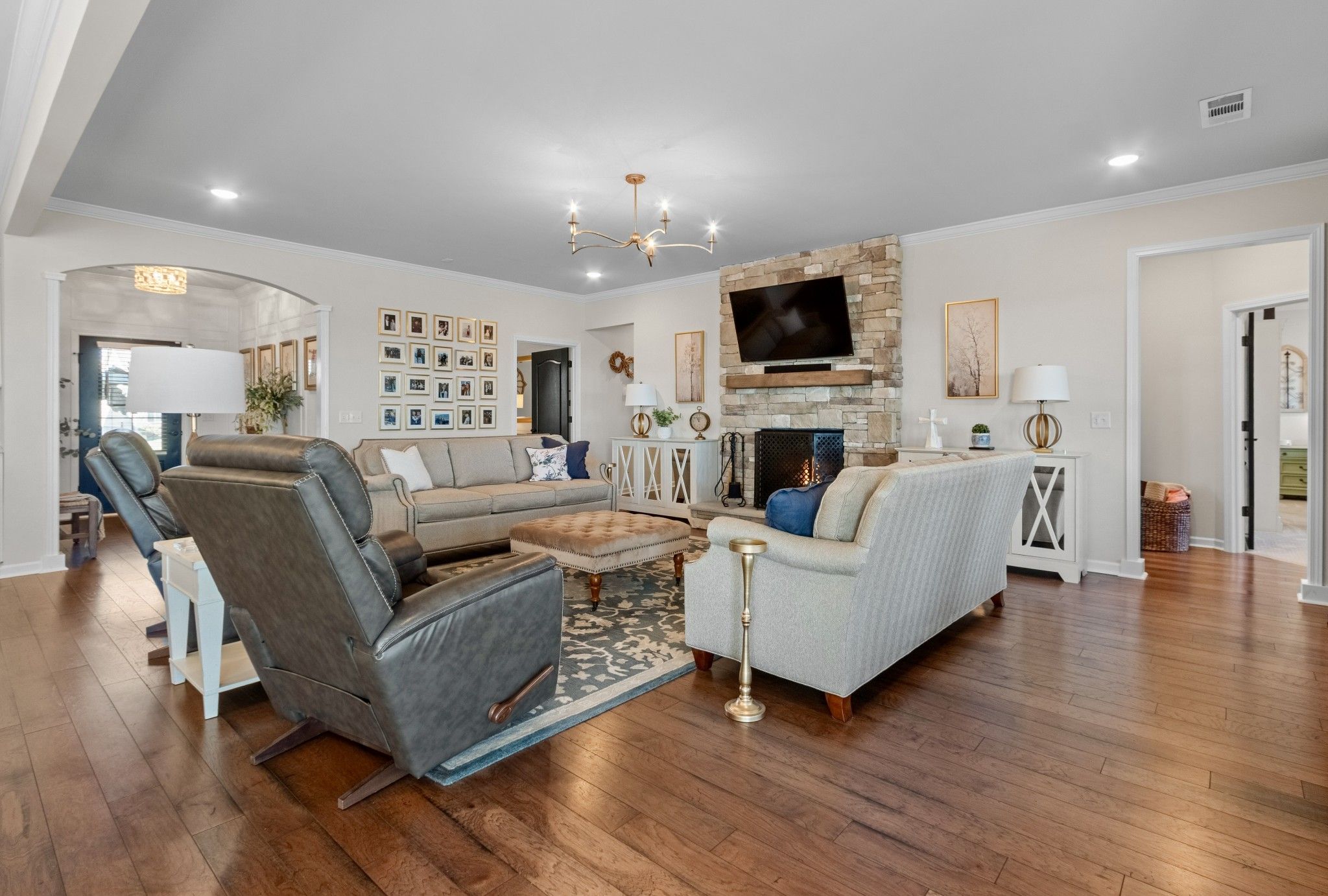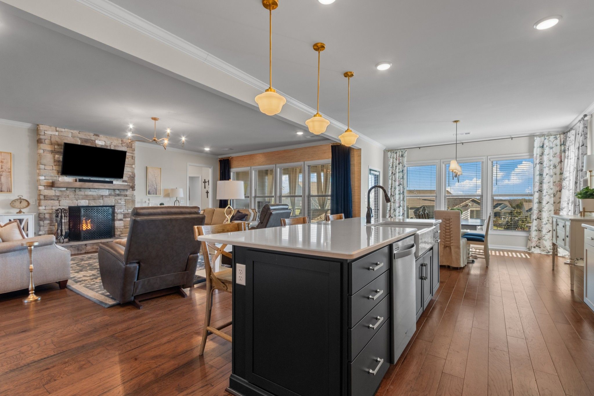 THIS IS THE ONE! ALL THE BELLS AND WHISTLES! 3 main level bedrooms 3 full baths Dunwoody Way model with office and bonus room on a large lot with the backyard facing east to enjoy the morning sunshine on your screened lanai or large patio for entertaining. Backyard connects to common area with lots of trees for privacy.Extra large two car garage with 4 foot extension and golf cart bay, epoxy floor, and generous storage options for all of your "toys".Gorgeous custom molding throughout. Great room with gas log burning stone fireplace. Beautiful, engineered hardwood floors, upgraded kitchen with farmhouse sink, gas cook top, double ovens, rollout shelving, and soft close doors and drawers. Walk-in kitchen pantry, dining area with lots of natural light. Primary bath with garden tub and walk-in shower, double sink vanities, water closet, linen closet, and easy access to the huge primary closet. Upstairs loft area has walk-in attic access for ease of storage. Seller currently uses the loft area as a bedroom/bonus room for grandchildren. This spacious area could be used as a craft and hobby room, exercise room, conditioned storage space, an office, so many possibilities. Laundry room has a built-in drop zone with storage as well as upper cabinets. This home is a must see as the seller has made so many improvements and upgrades since it was built. Community has both indoor and outdoor pools, pickle ball and tennis courts, gas fire pit, pavilion with gas grills and patio tables, clubhouse with fitness center and fitness classes, ball rooms, kitchen, conference room, card/game room, massage room, men's and women's locker rooms, and a dog park. Over 70 clubs and special interest groups, special programs, presentations, concerts, Southern Springs choir and band, as well as photography, painting, quilting, solo clubs, coffee club, Veteran's club, and so much more. Living in Southern Springs is like vacationing at a very active resort. Thirty-five minutes to/from BNA.
